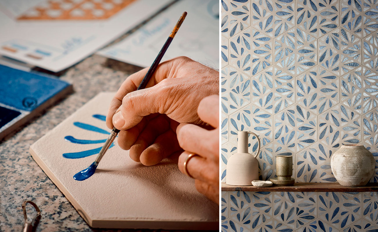 Per arricchire l'aspetto delle pareti, il formato esagona nei colori Marna e Chamotte presenta il pattern Dipinto, con un intenso effetto maiolica realizzato grazie all'applicazione di una preziosa pasta di vetro che aggiunge spessore e lucentezza alla superficie. Il contrasto tra la lucidità della materia applicata e l’opacità del fondo, e il disegno del pattern in contrapposizione alla base neutra, vibra di grande forza espressiva.