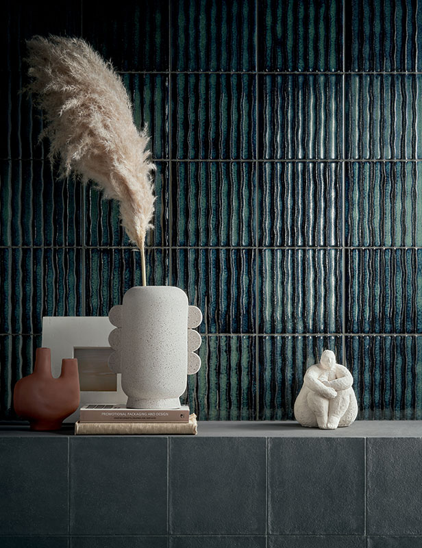 Una terza variante è Forma Vitrea, ulteriormente arricchita con un’applicazione di pasta vetrosa sulle sue creste. Utilizzandoli, è possibile creare una grande varietà di composizioni a parete e caratterizzare le porzioni che suddividono gli spazi, tra cui ad esempio nicchie, angoli e corridoi.