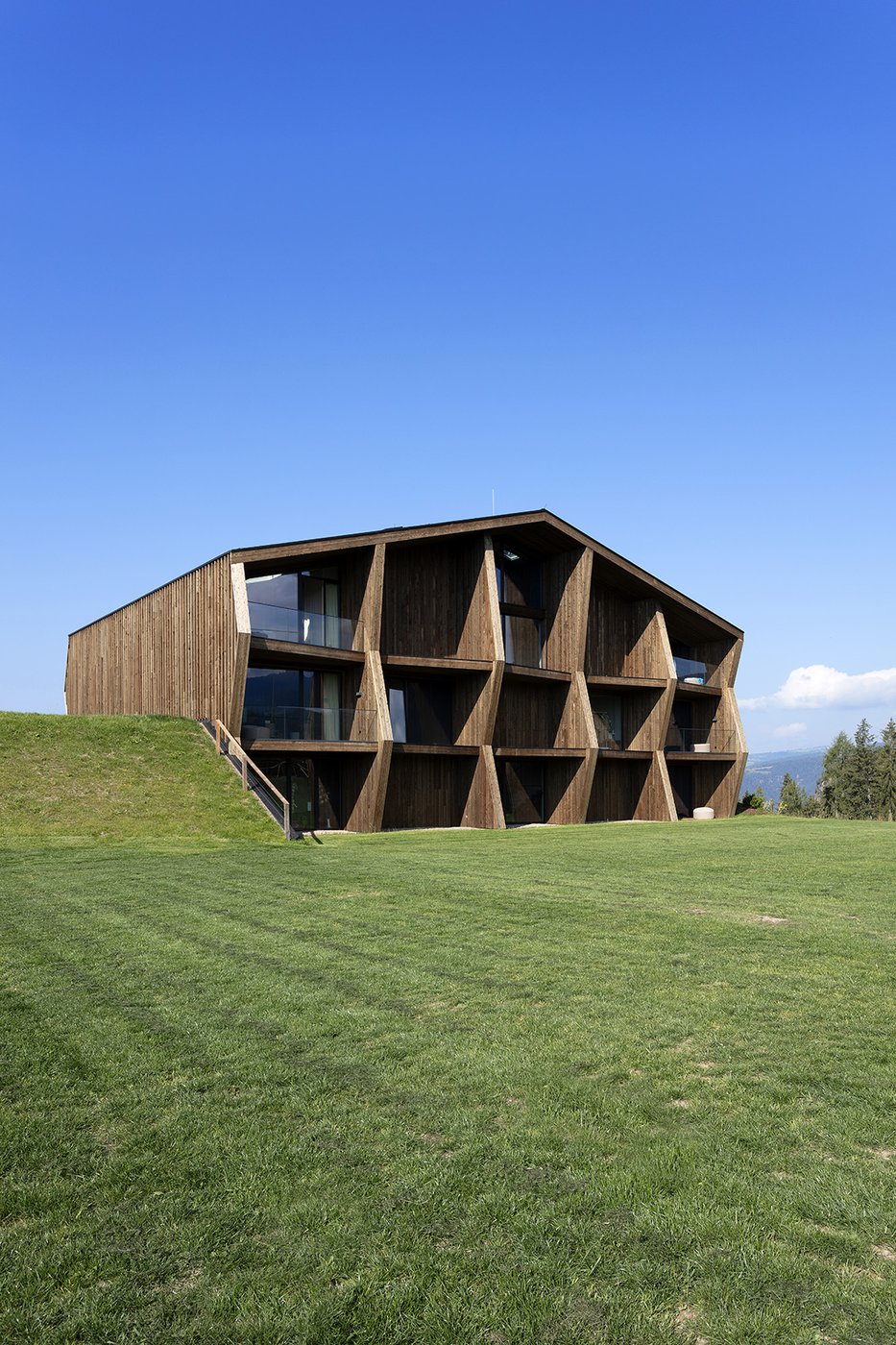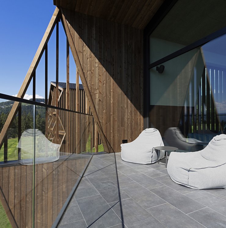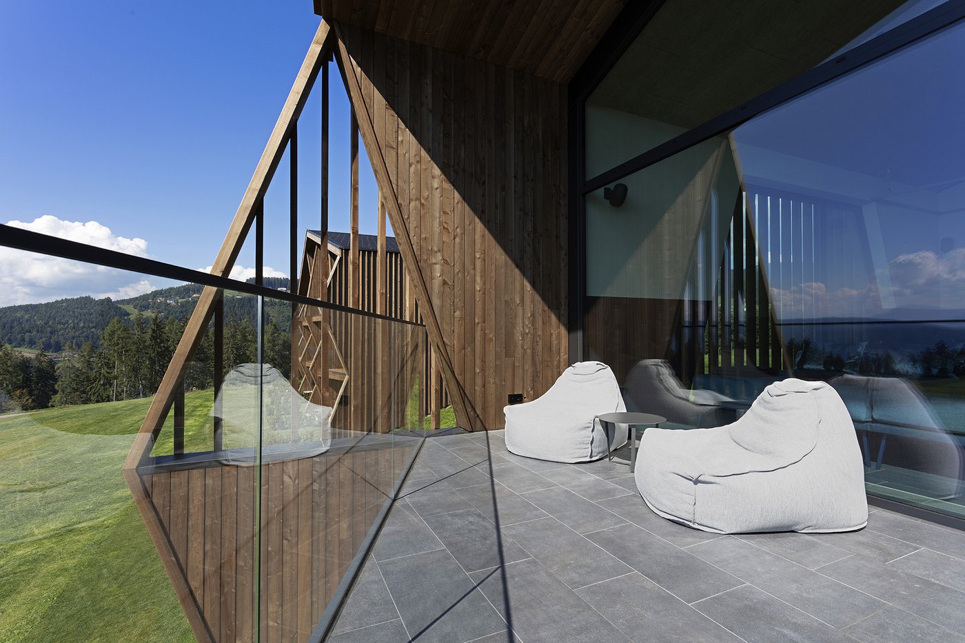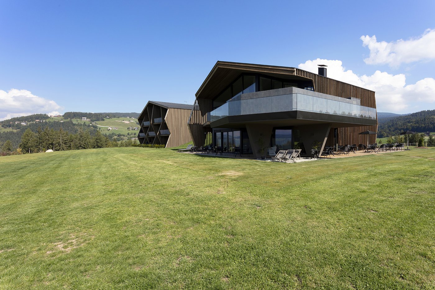 L’architettura esterna in legno presenta volumi ultramoderni e ampie vetrate, che lasciano entrare la luce e donano una vista semplicemente unica alle 15 suites private, alla piscina panoramica e alla Luxury Spa.
