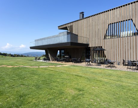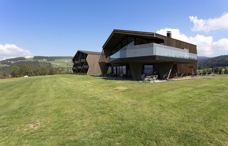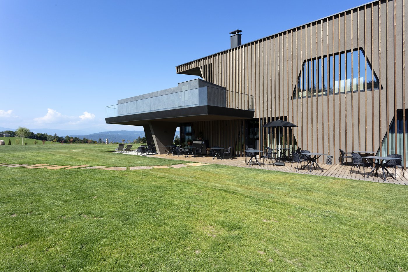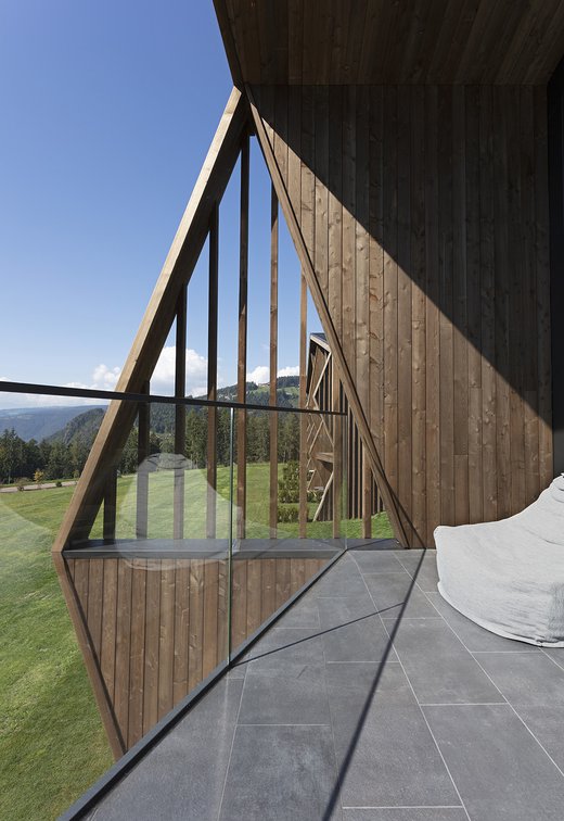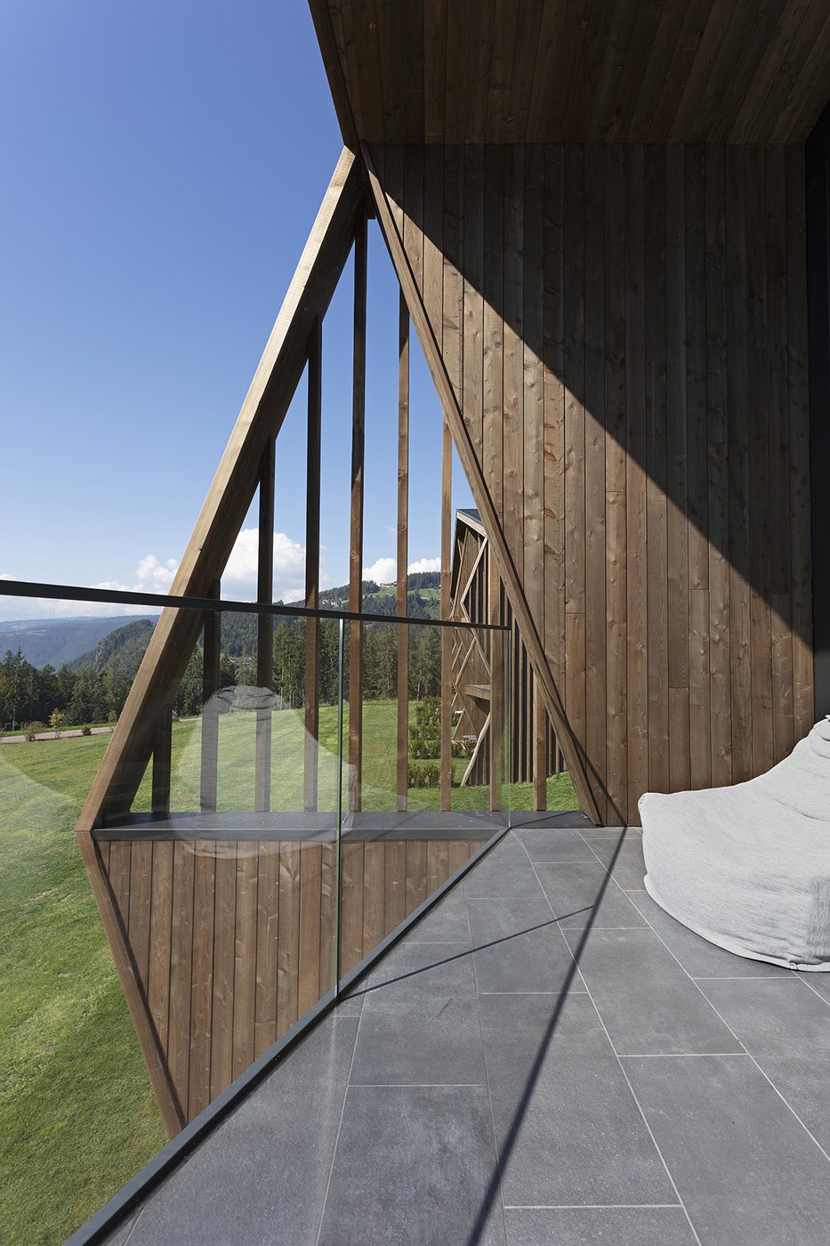 L’architettura esterna in legno presenta volumi ultramoderni e ampie vetrate, che lasciano entrare la luce e donano una vista semplicemente unica alle 15 suites private, alla piscina panoramica e alla Luxury Spa.
