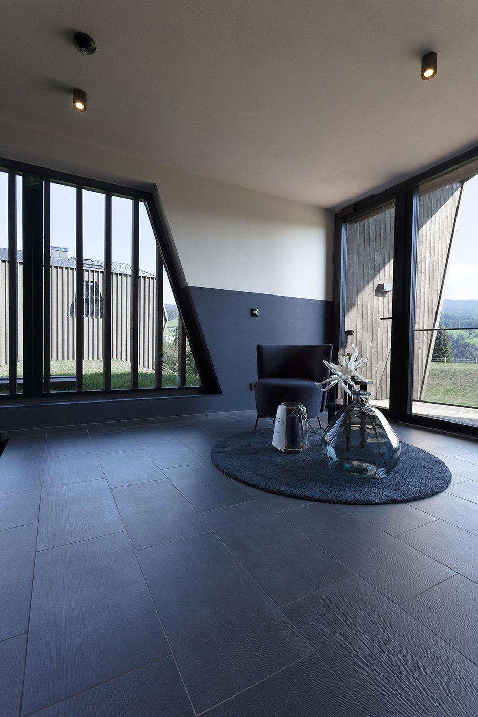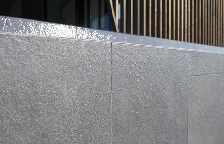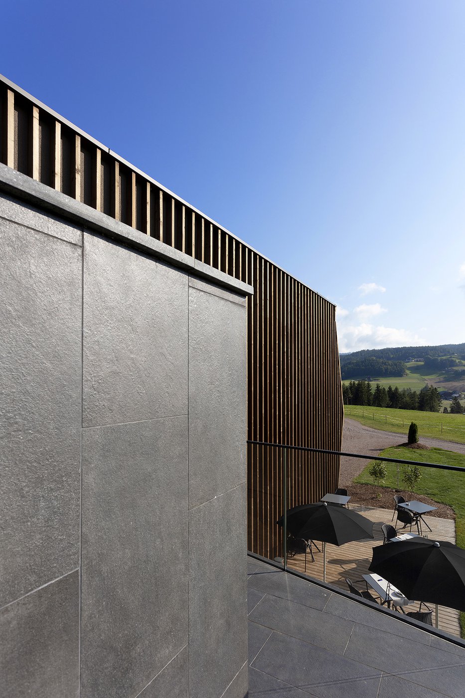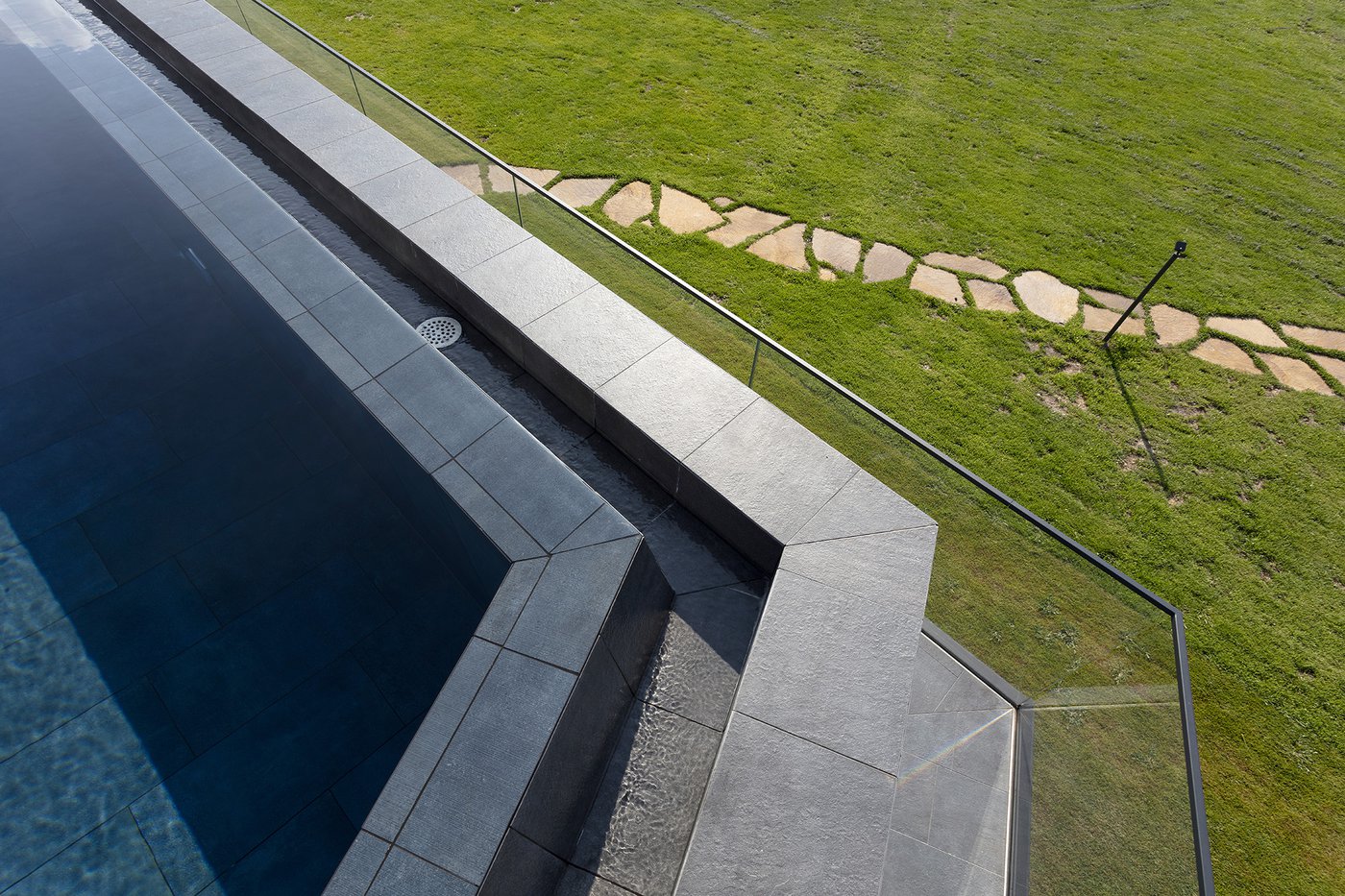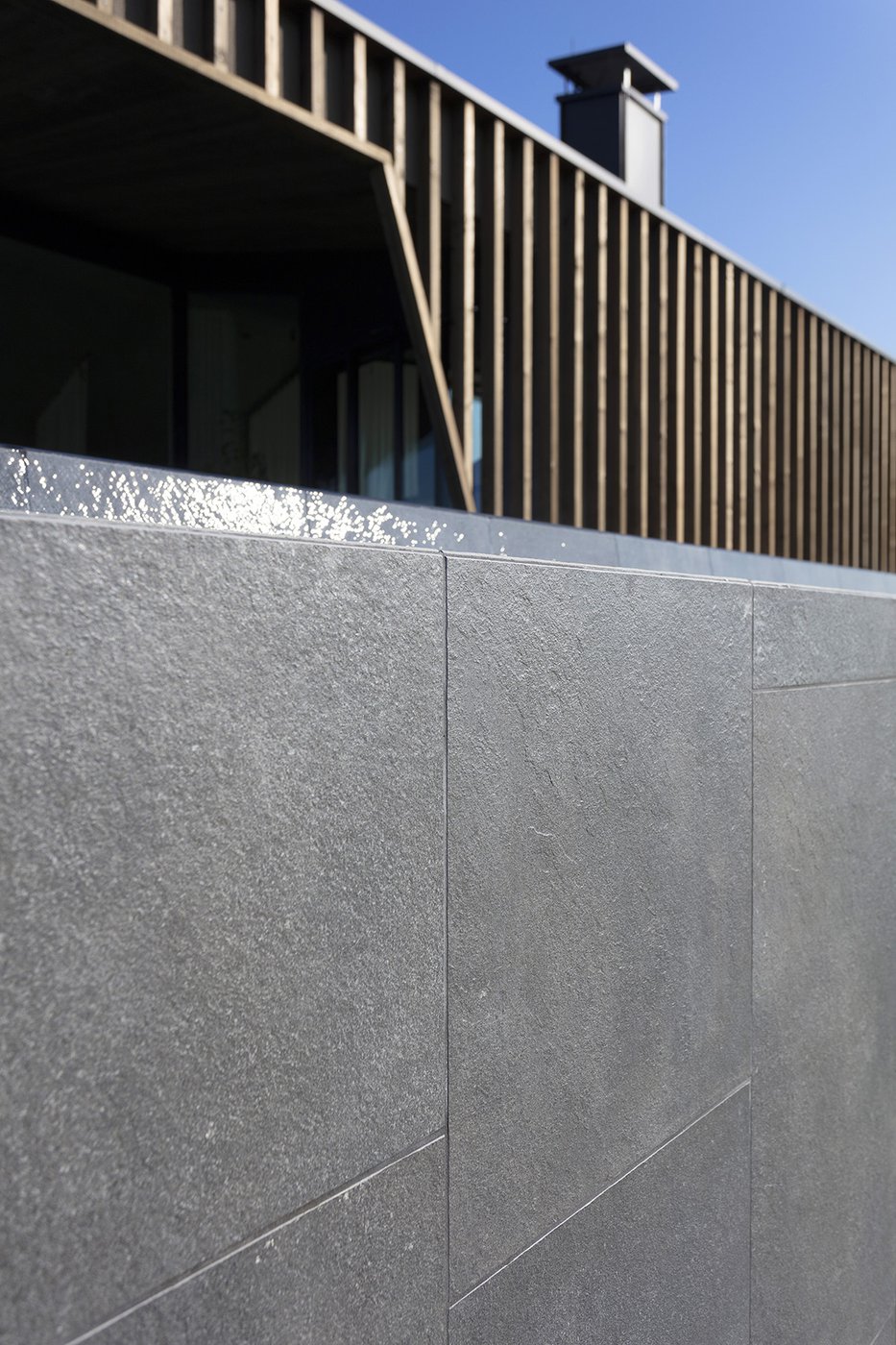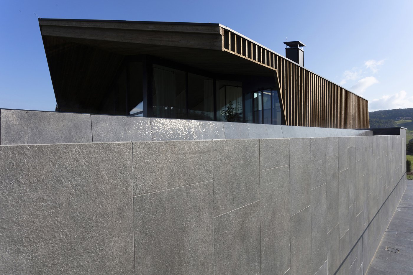 Per rivestire la piscina panoramica esterna e la terrazza Wellness si è invece optato per Stonecloud Dark in versione strutturata, ancora più resistente a sollecitazioni e agenti atmosferici.
