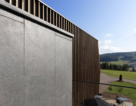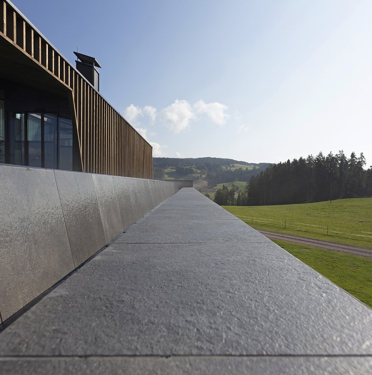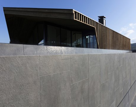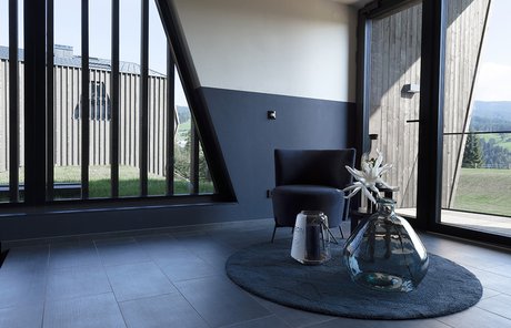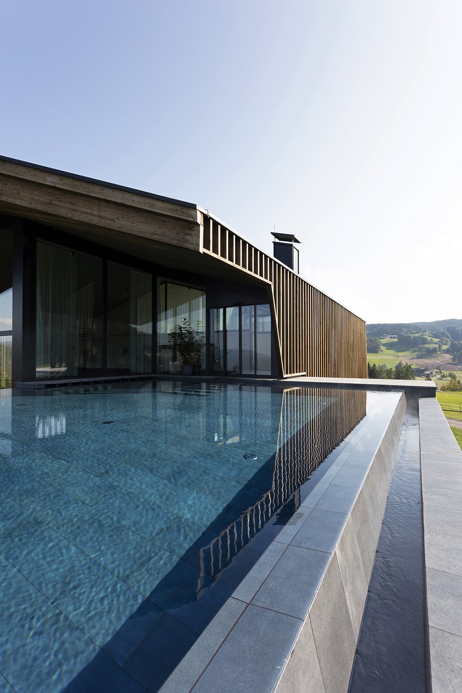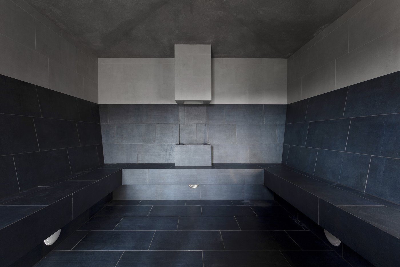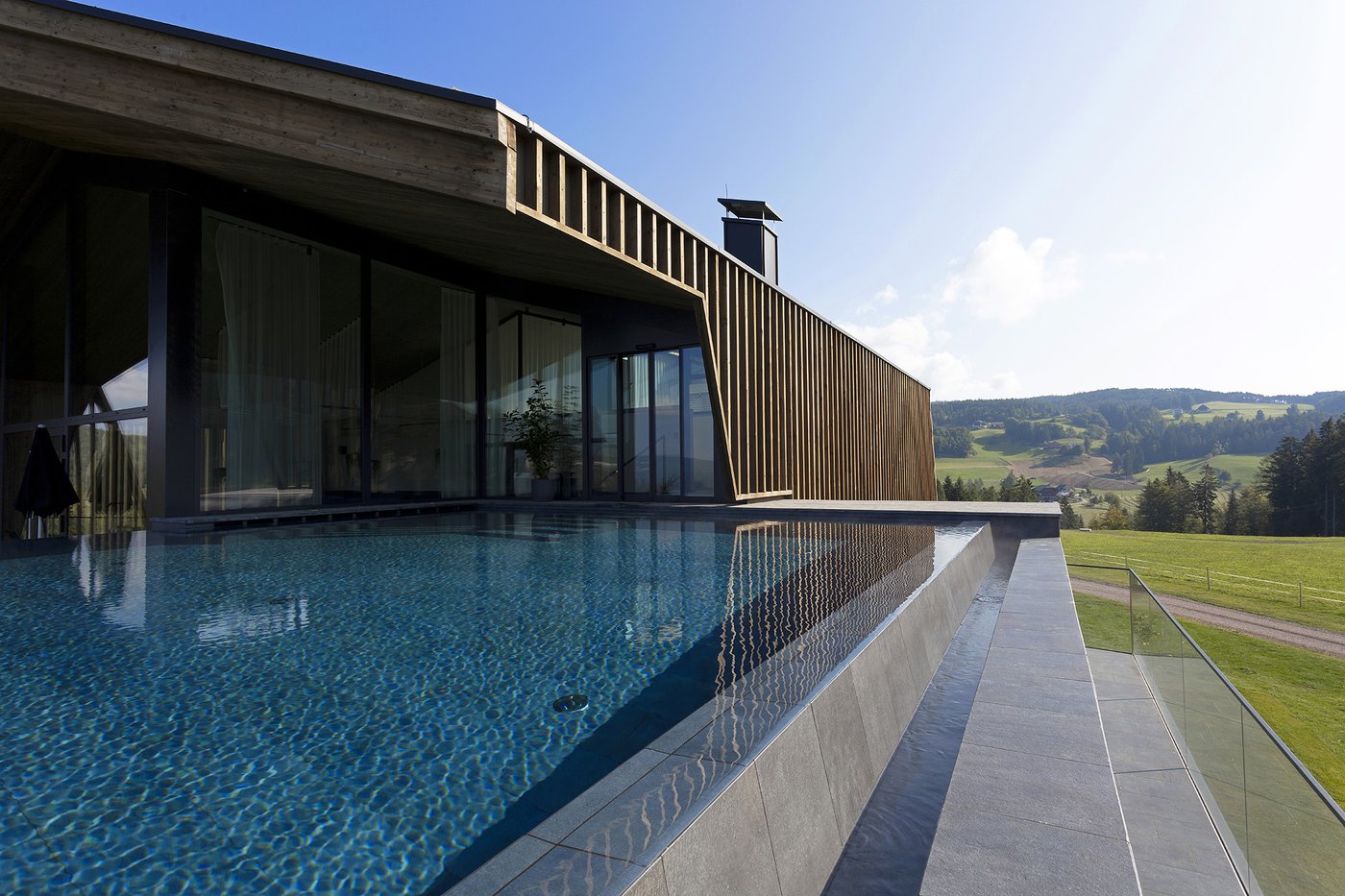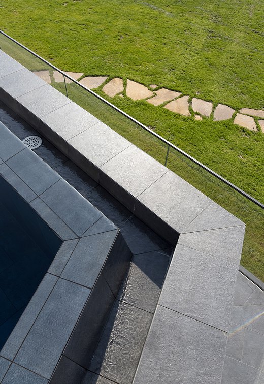 Per rivestire la piscina panoramica esterna e la terrazza Wellness si è invece optato per Stonecloud Dark in versione strutturata, ancora più resistente a sollecitazioni e agenti atmosferici.