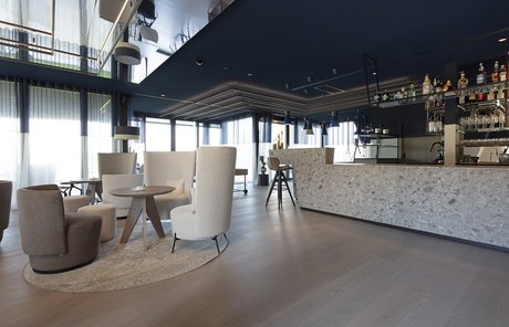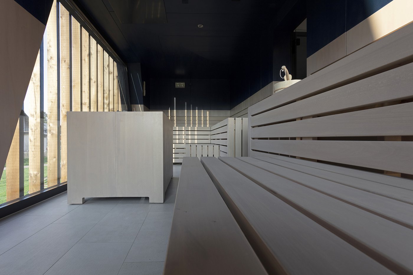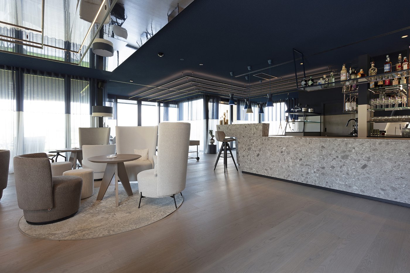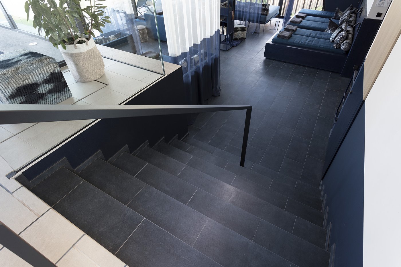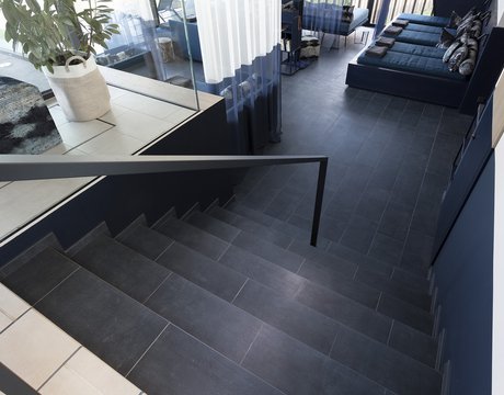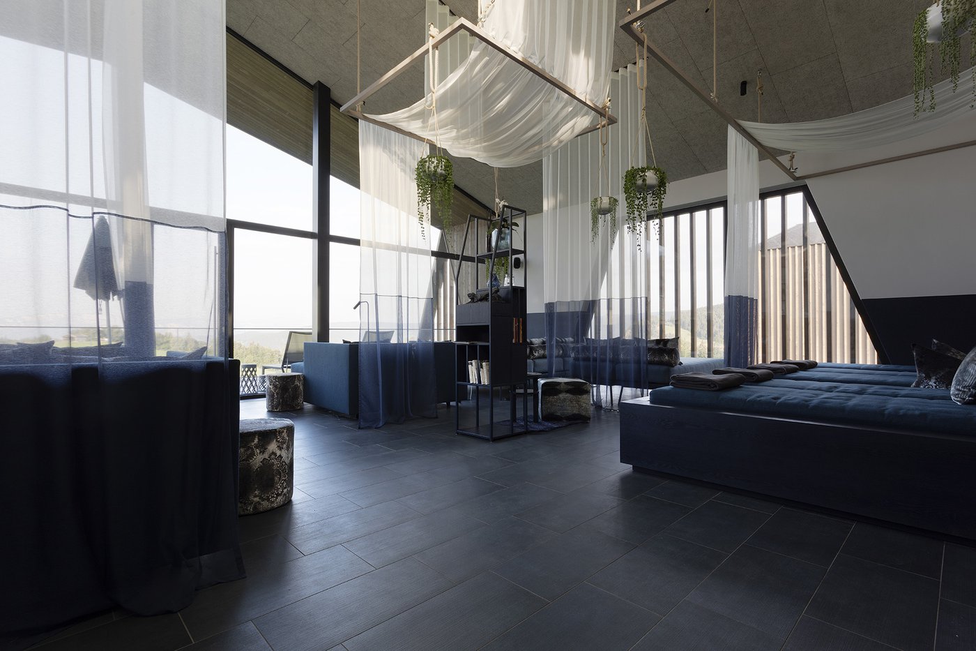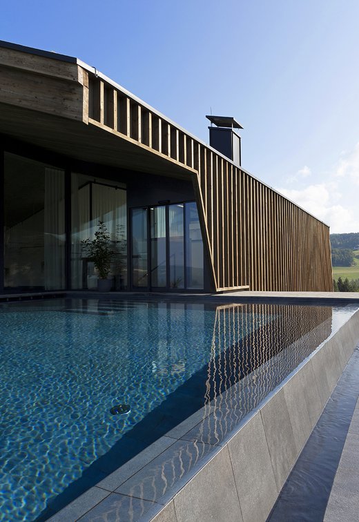 Per rivestire la piscina panoramica esterna e la terrazza Wellness si è invece optato per Stonecloud Dark in versione strutturata, ancora più resistente a sollecitazioni e agenti atmosferici.