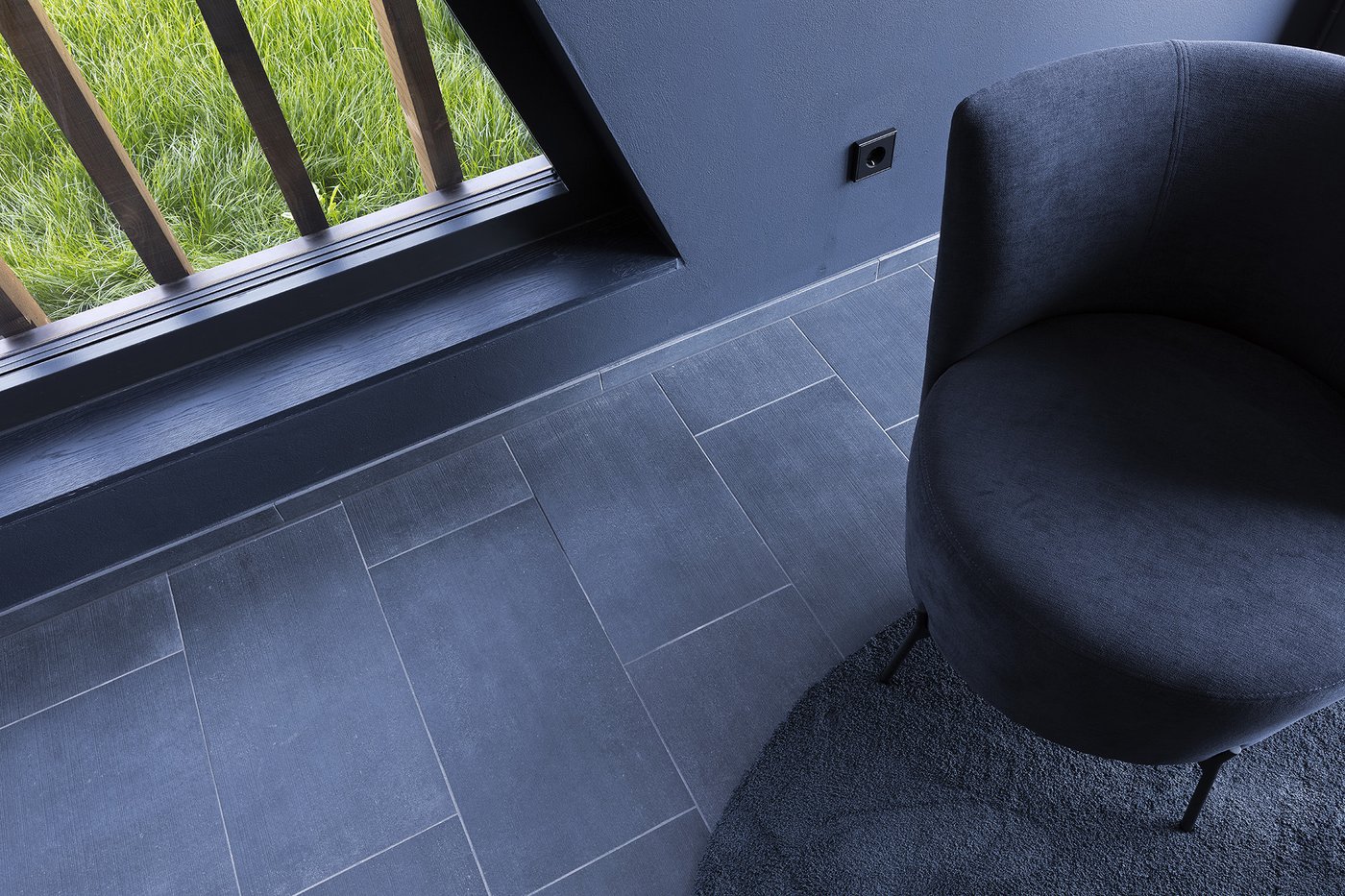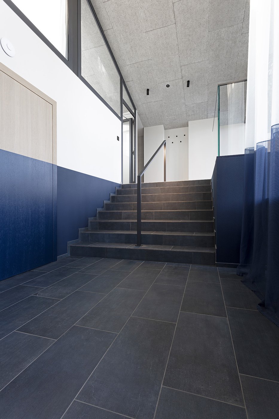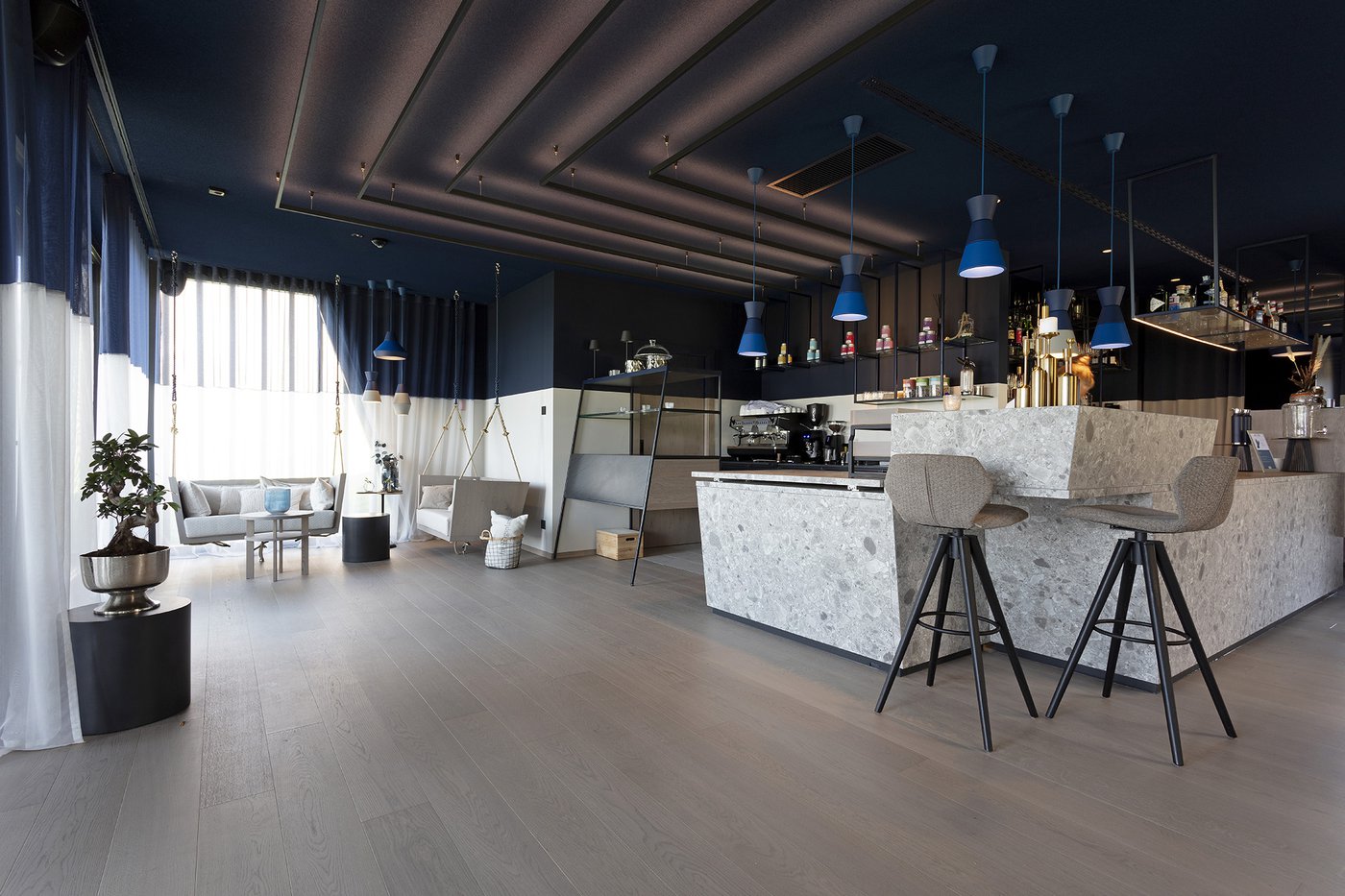 Il design d’interni è giocato su contrasti cromatici e materici decisi ma equilibrati: le tonalità beige e blu, le superfici in legno e gres effetto pietra dialogano tra loro, valorizzando ogni ambiente.
