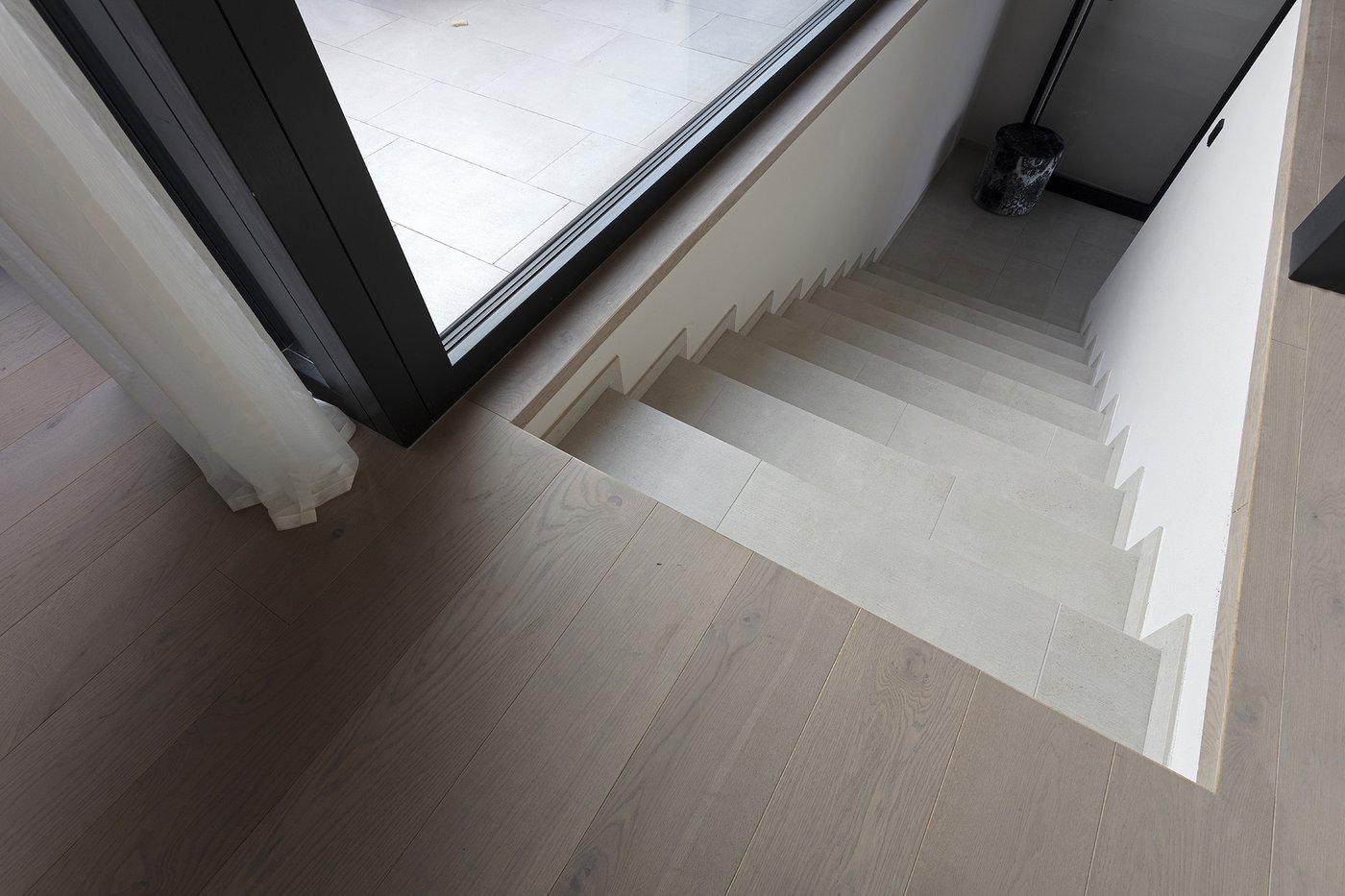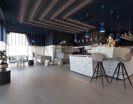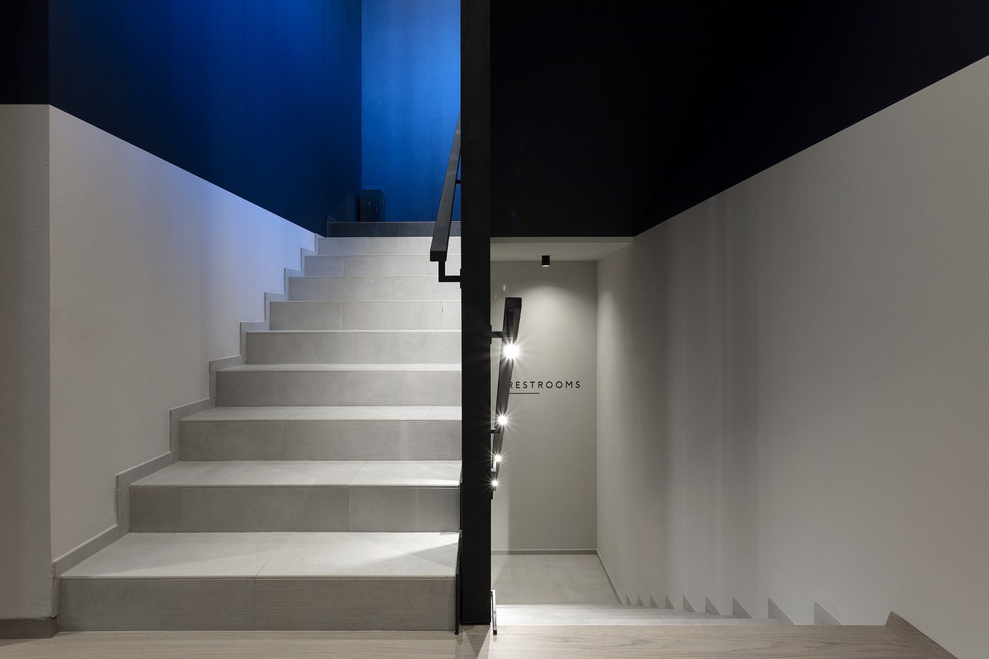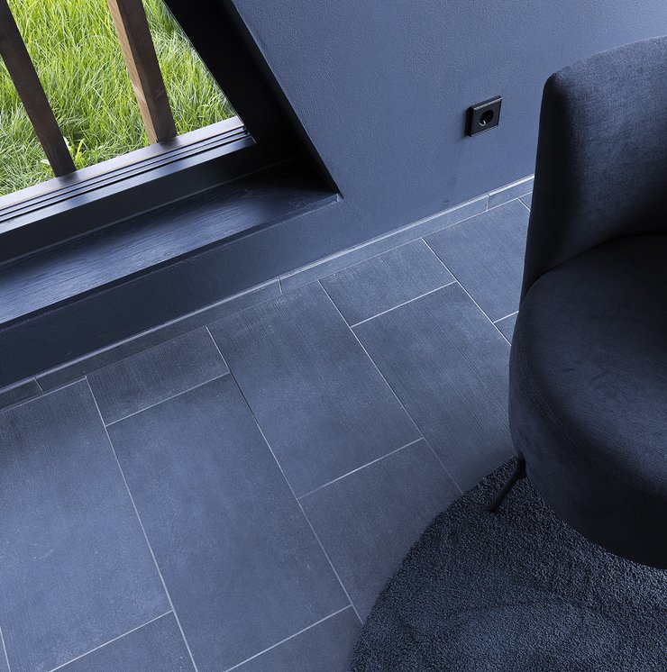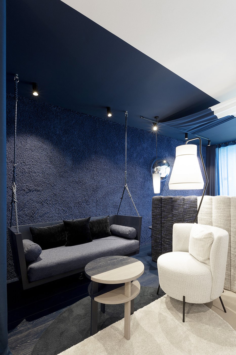 Il design d’interni è giocato su contrasti cromatici e materici decisi ma equilibrati: le tonalità beige e blu, le superfici in legno e gres effetto pietra dialogano tra loro, valorizzando ogni ambiente.