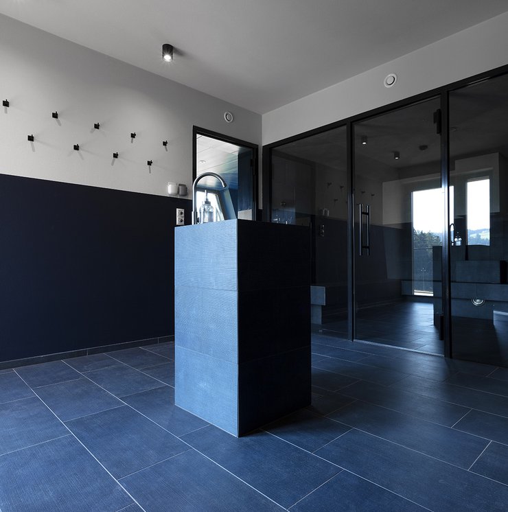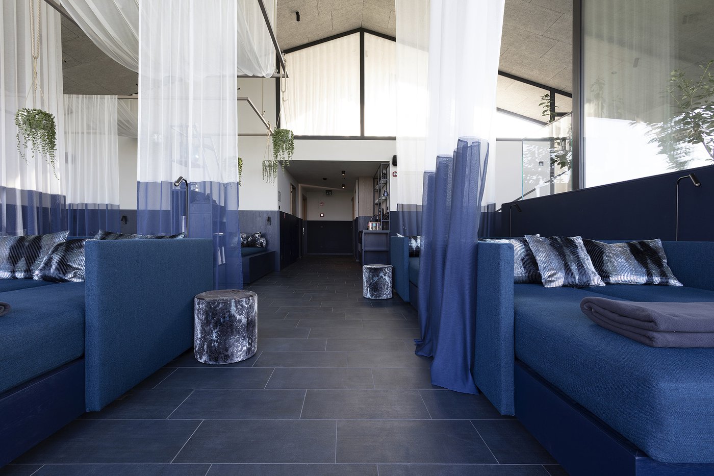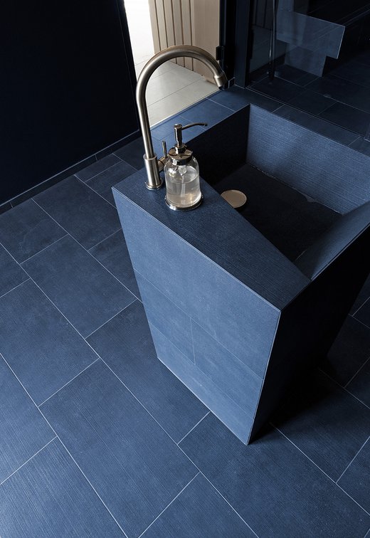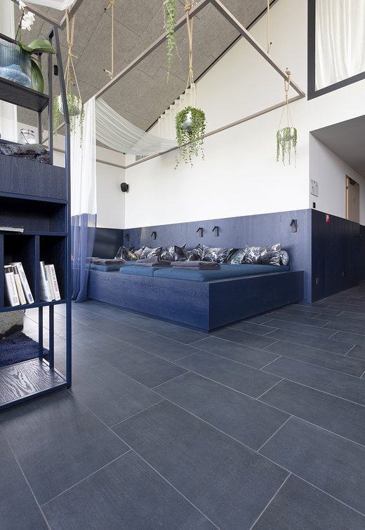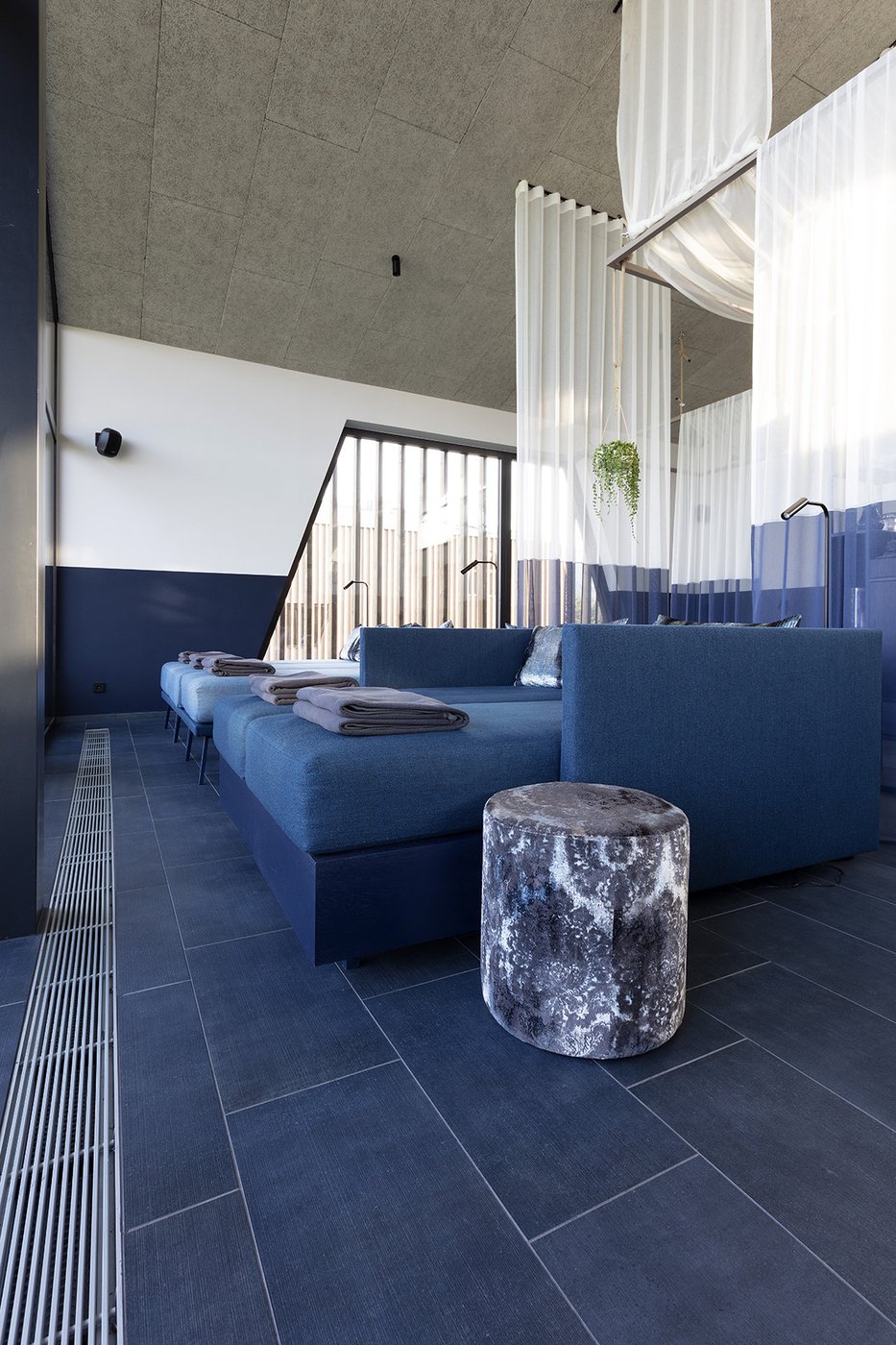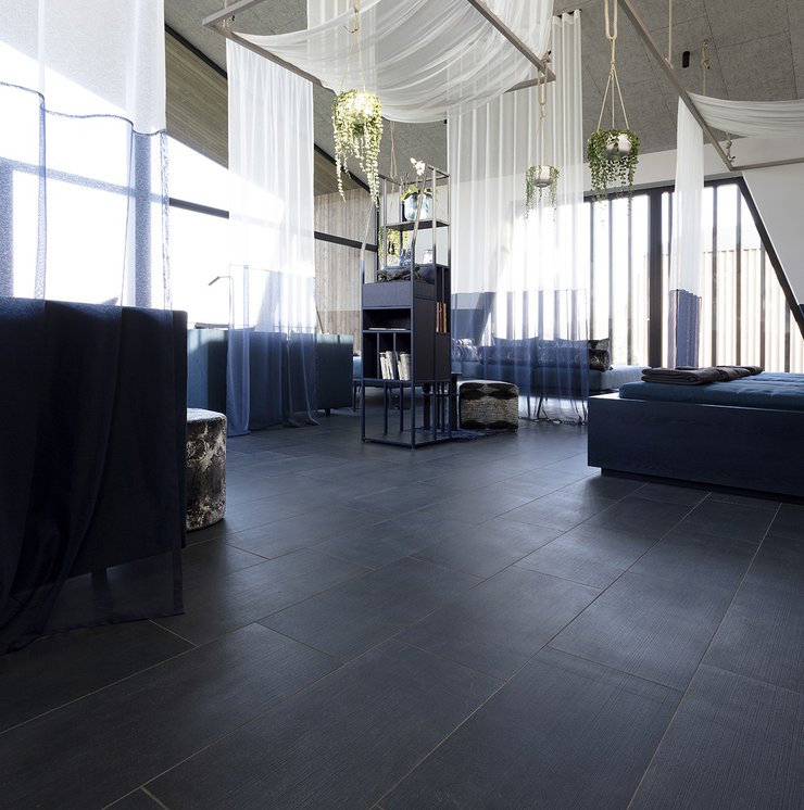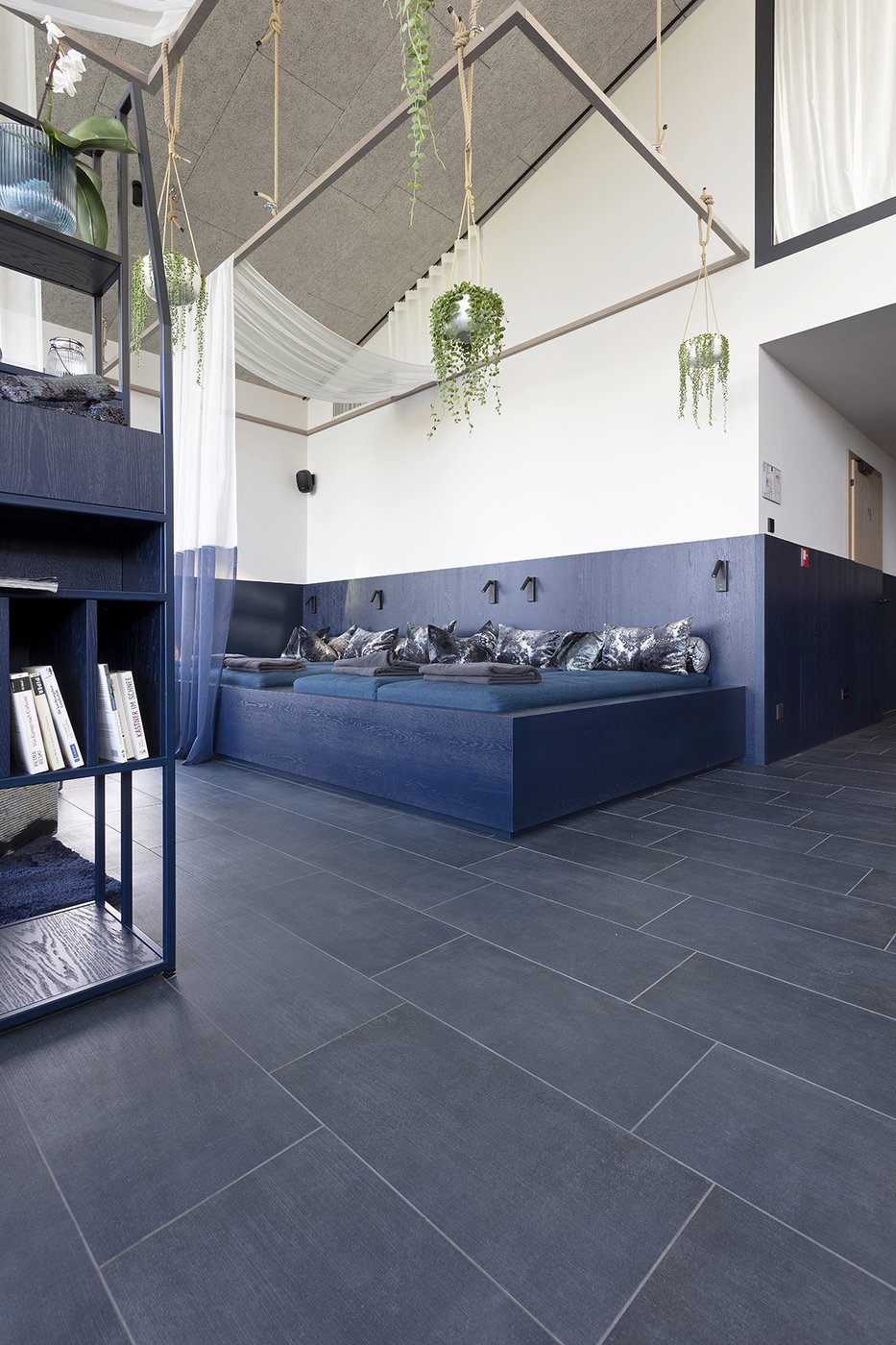 Nella zona Wellness, il cuore di questo Luxury Resort a conduzione familiare, sono i pavimenti e rivestimenti in gres Stonecloud beige e blu a dare vita a questa dicotomia cromatica, rendendo omaggio alle foreste di larici e ai cieli stellati della zona.