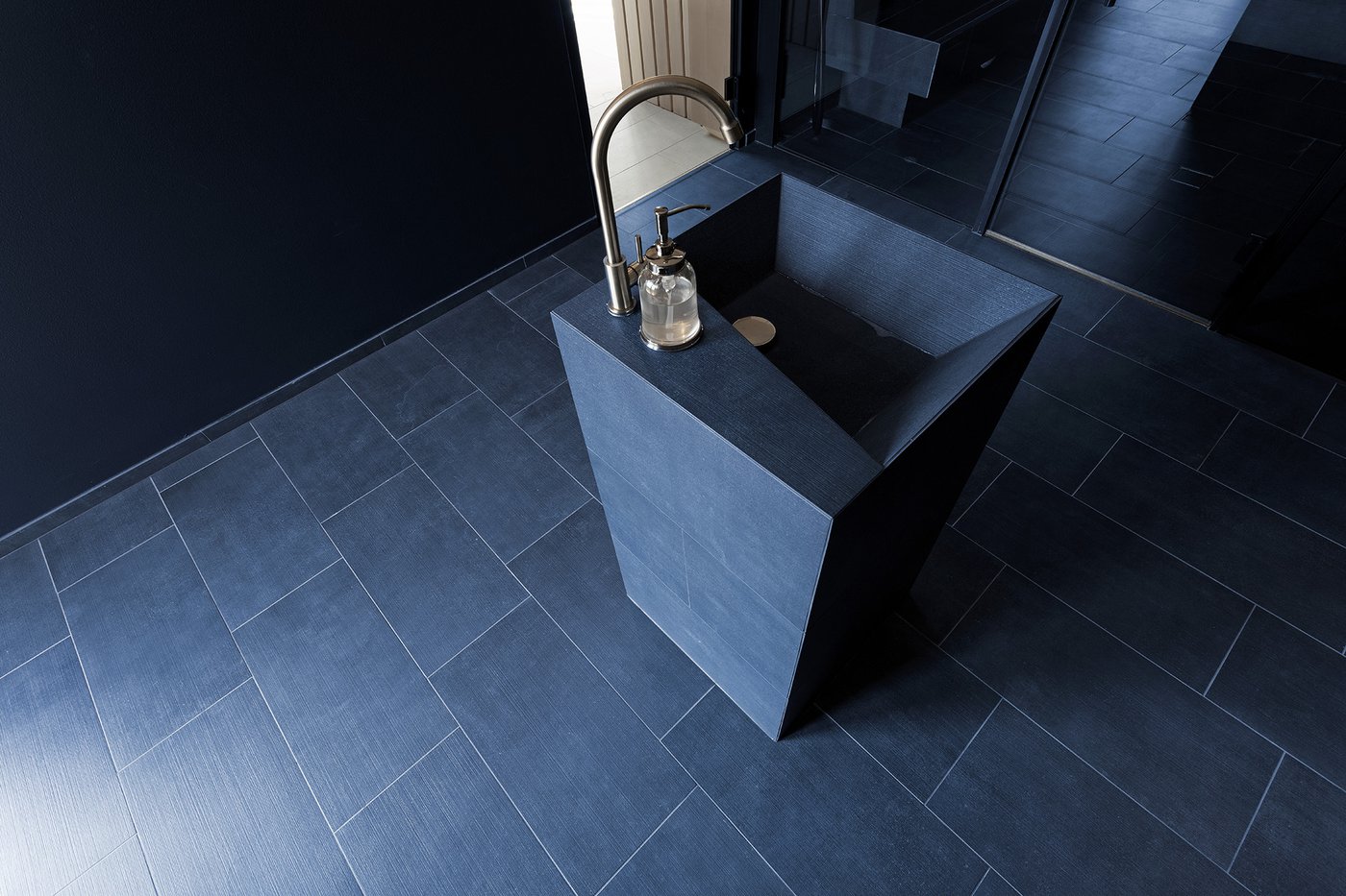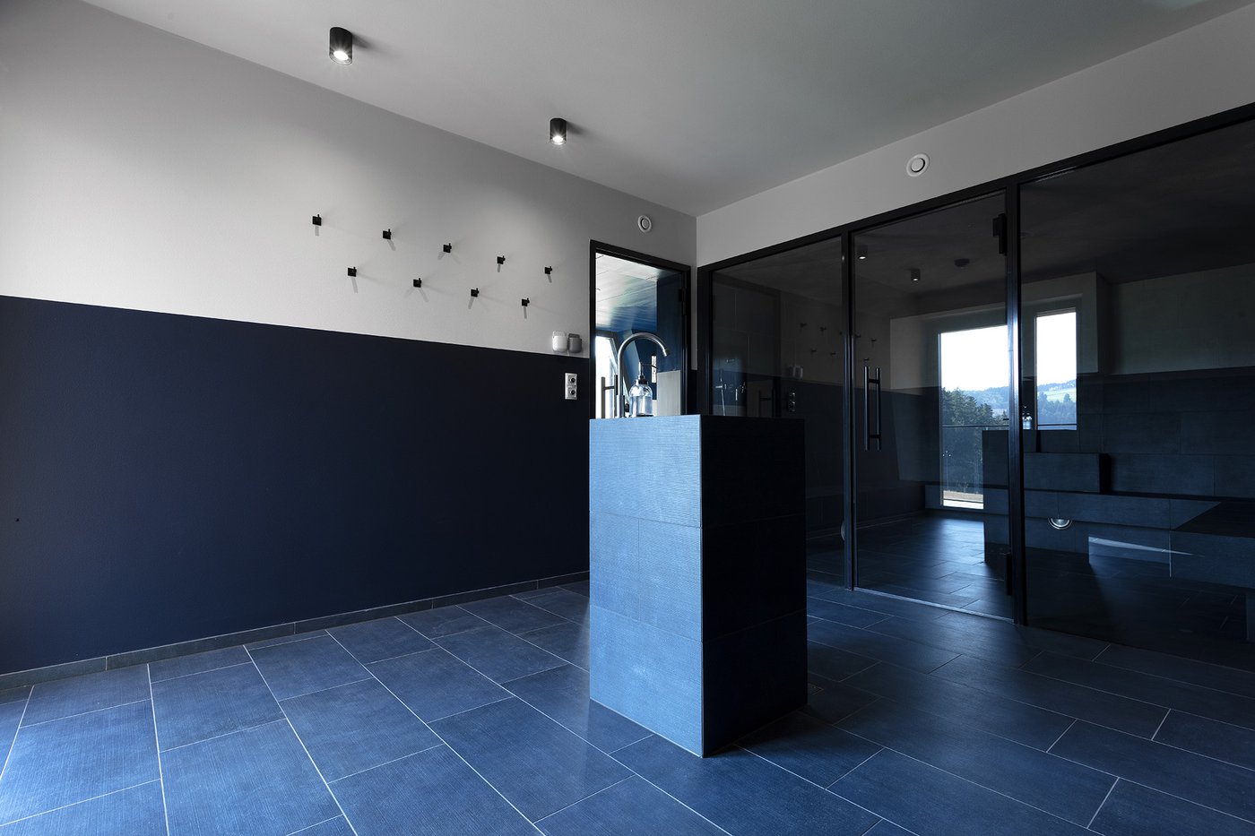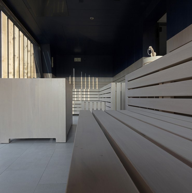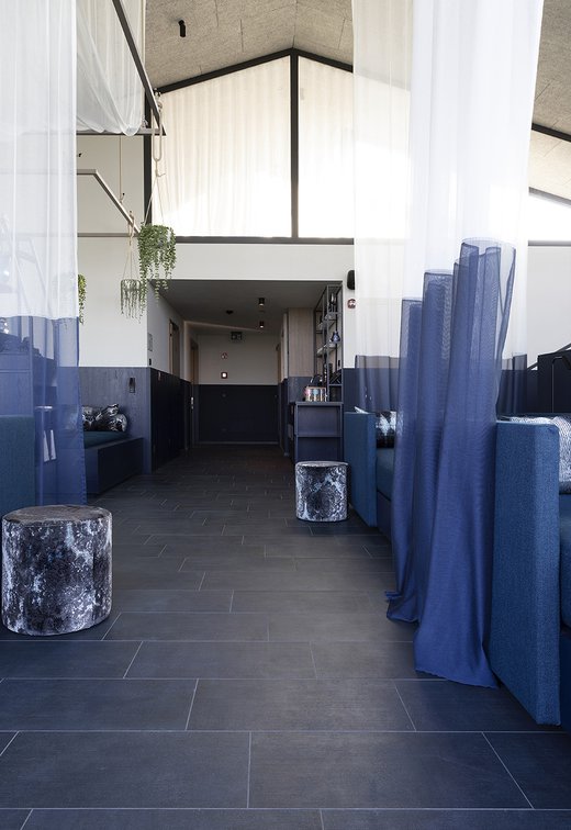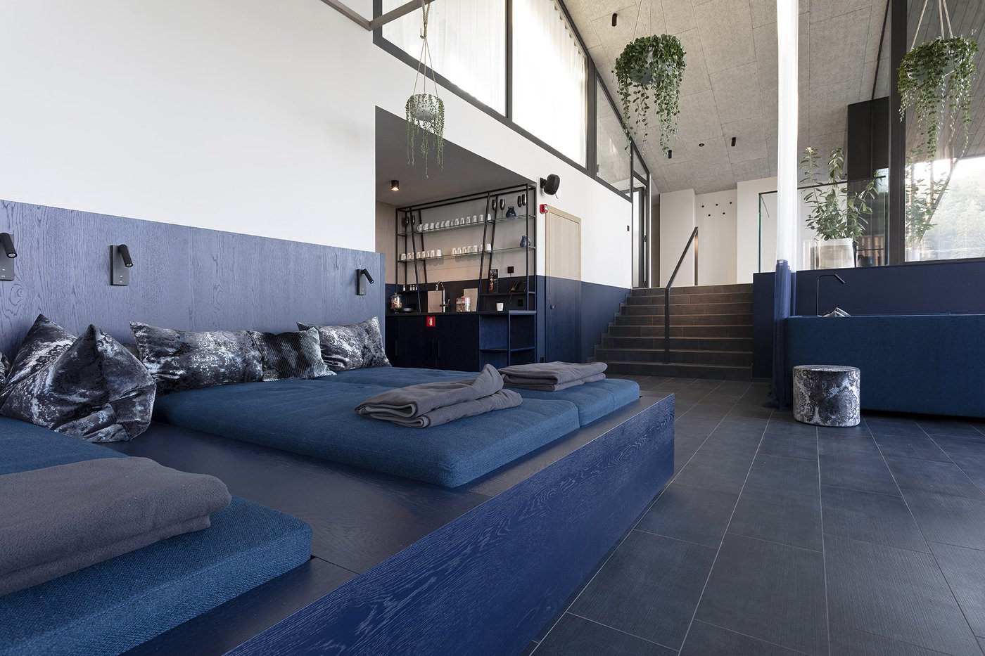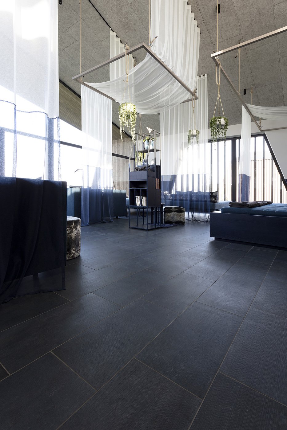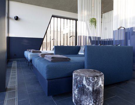 Nella zona Wellness, il cuore di questo Luxury Resort a conduzione familiare, sono i pavimenti e rivestimenti in gres Stonecloud beige e blu a dare vita a questa dicotomia cromatica, rendendo omaggio alle foreste di larici e ai cieli stellati della zona.