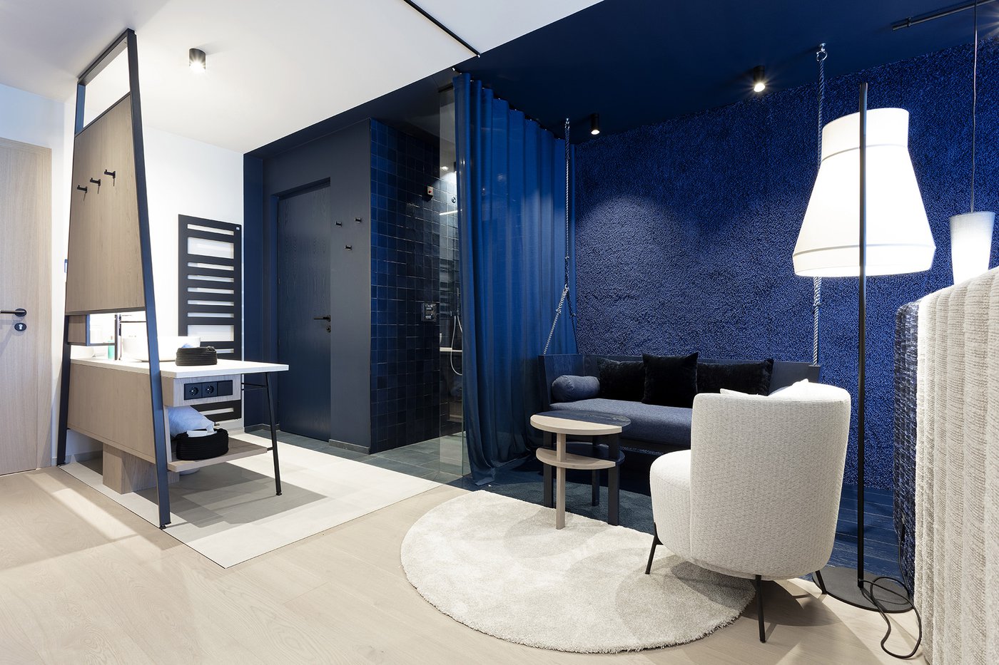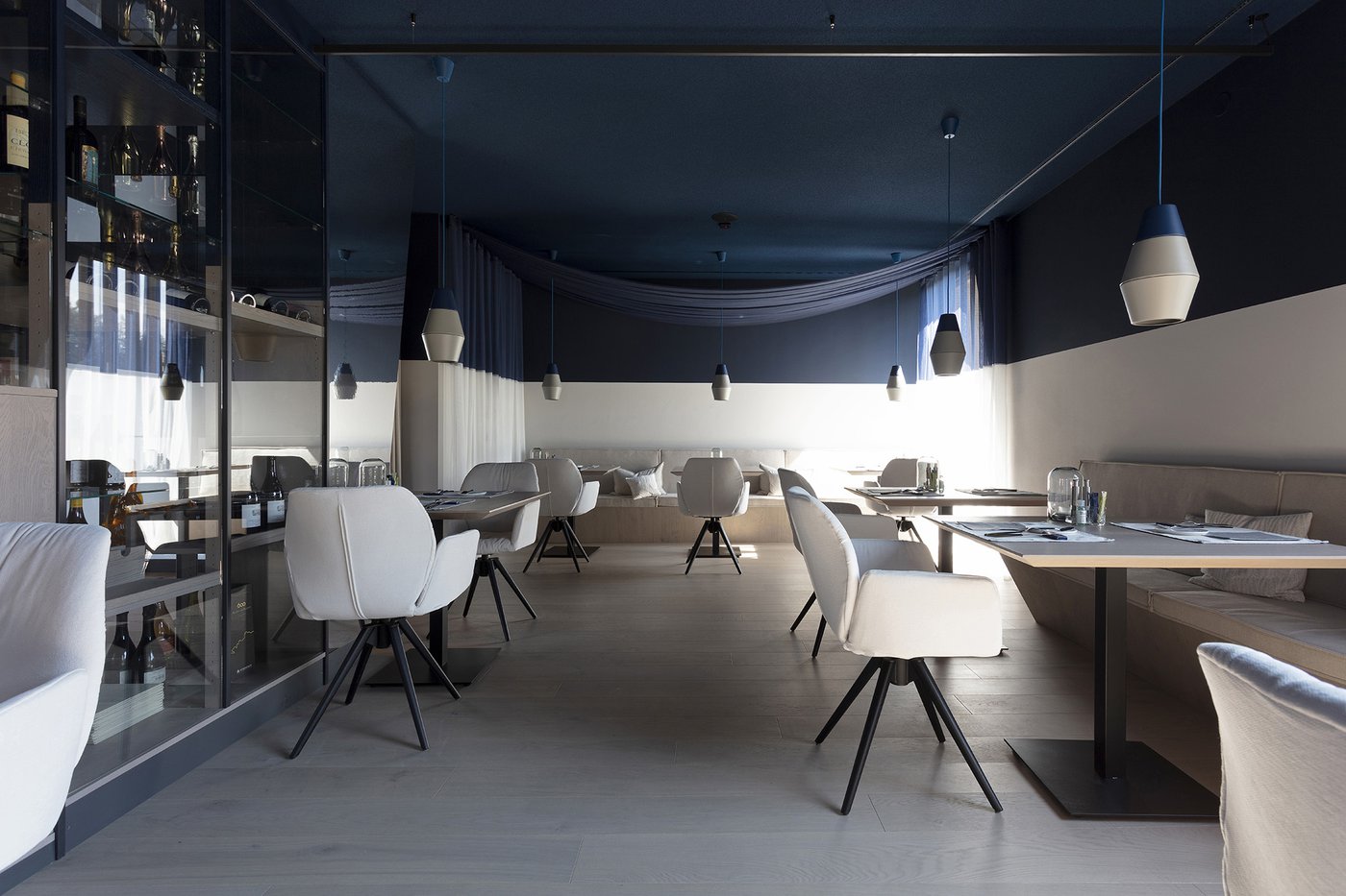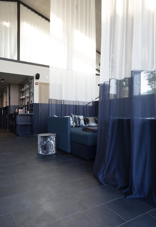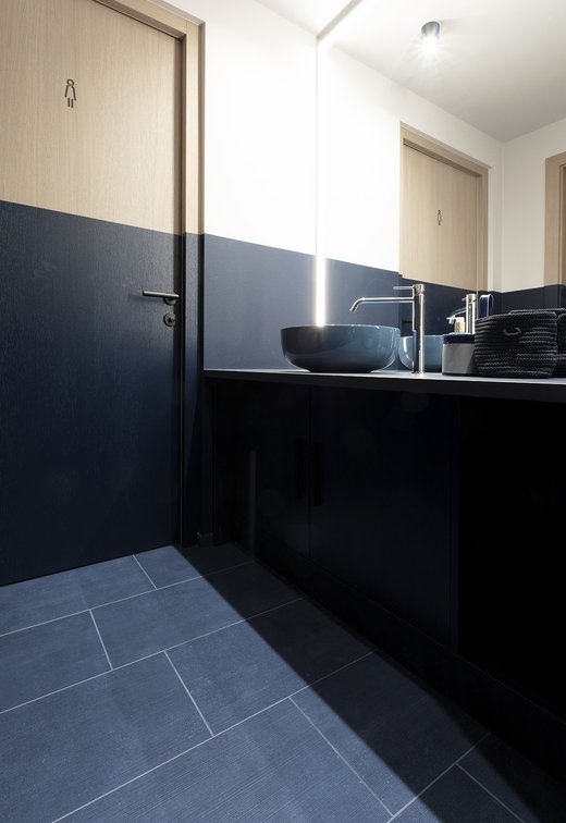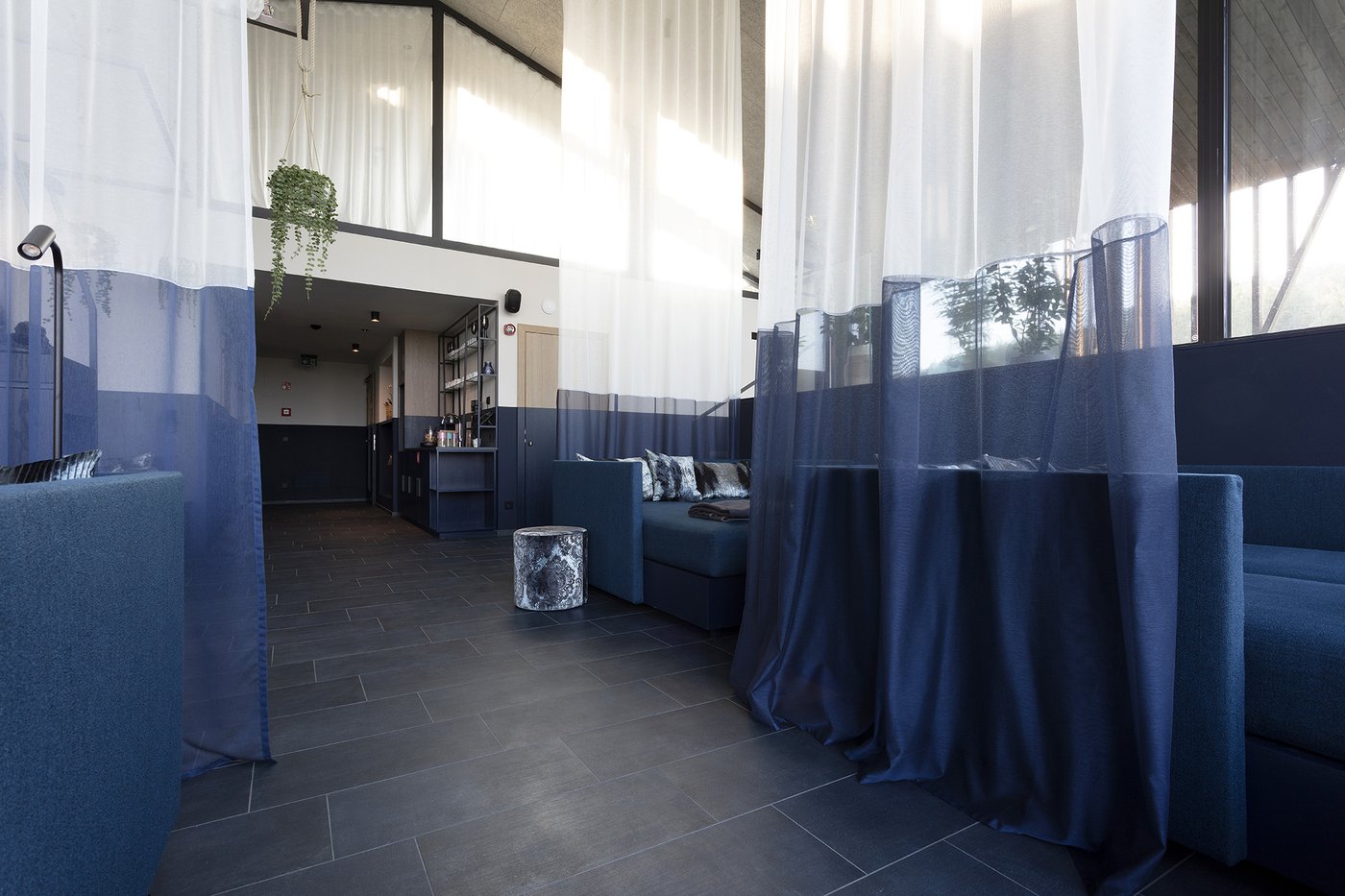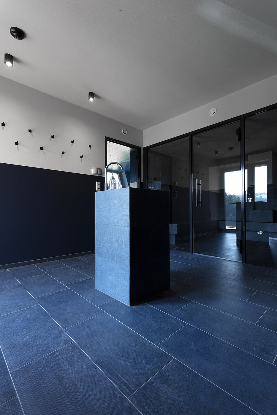 Nella zona Wellness, il cuore di questo Luxury Resort a conduzione familiare, sono i pavimenti e rivestimenti in gres Stonecloud beige e blu a dare vita a questa dicotomia cromatica, rendendo omaggio alle foreste di larici e ai cieli stellati della zona.