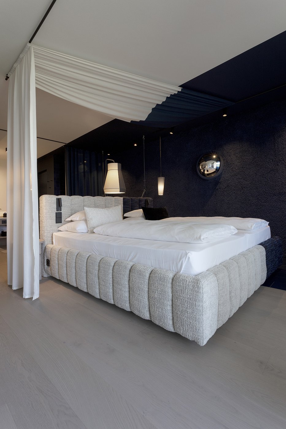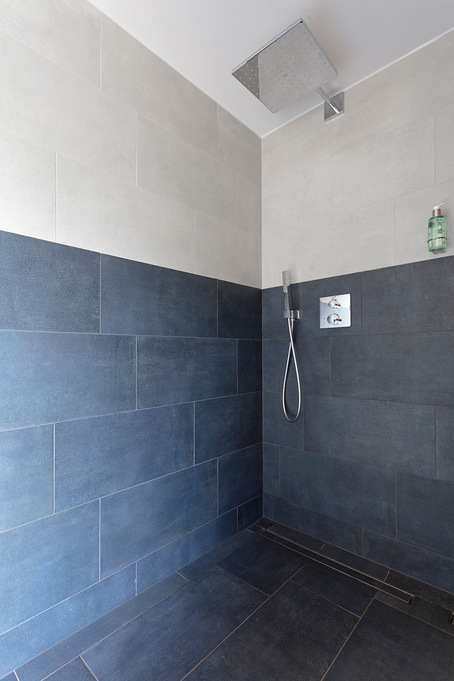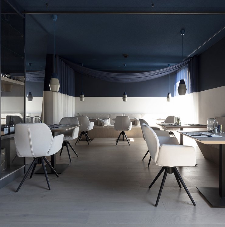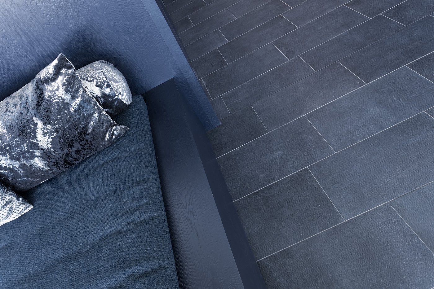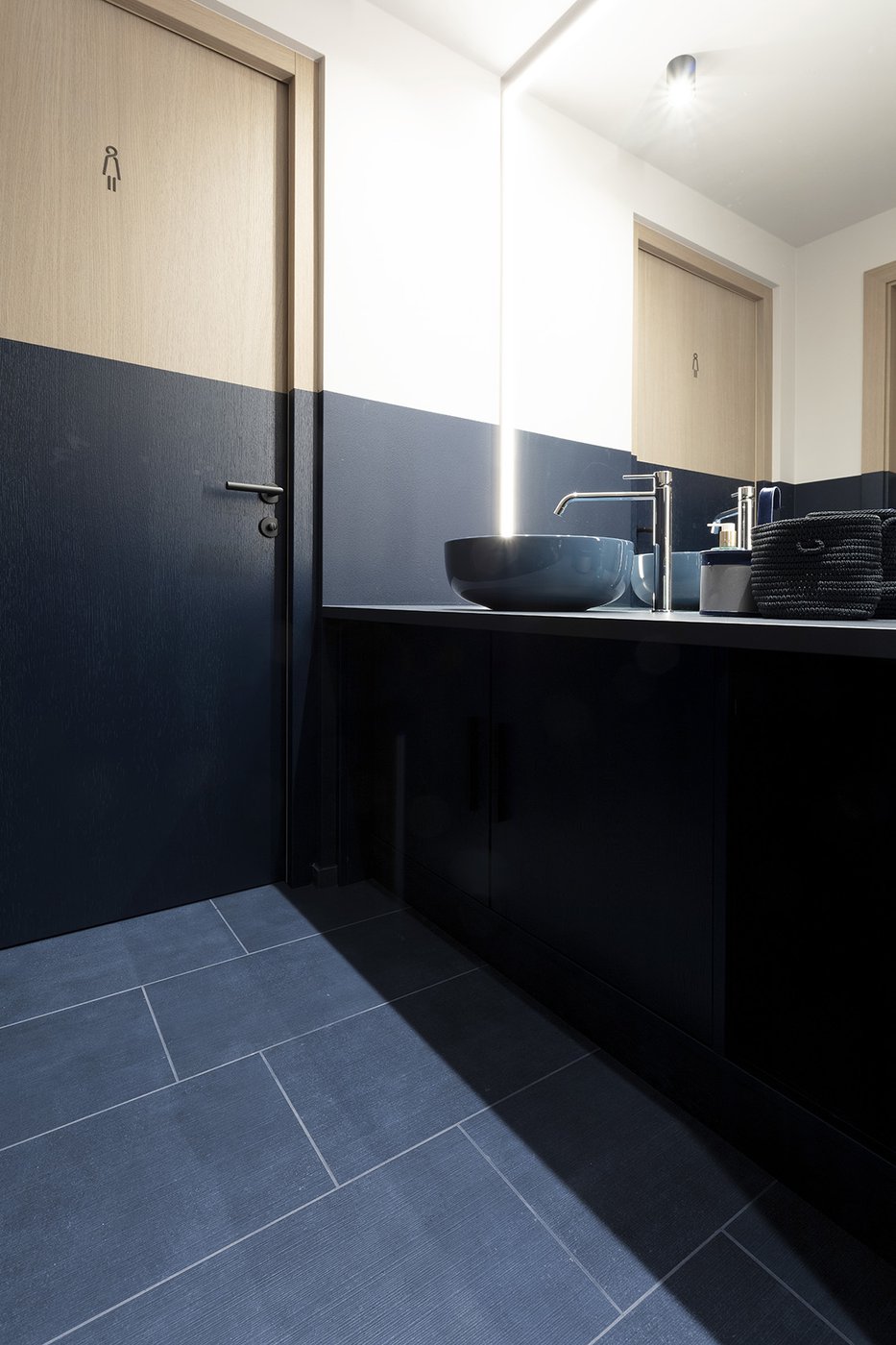 Nella zona Wellness, il cuore di questo Luxury Resort a conduzione familiare, sono i pavimenti e rivestimenti in gres Stonecloud beige e blu a dare vita a questa dicotomia cromatica, rendendo omaggio alle foreste di larici e ai cieli stellati della zona.