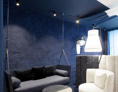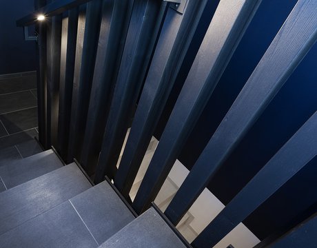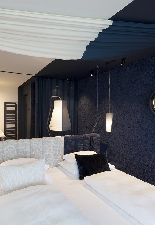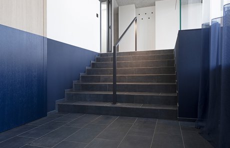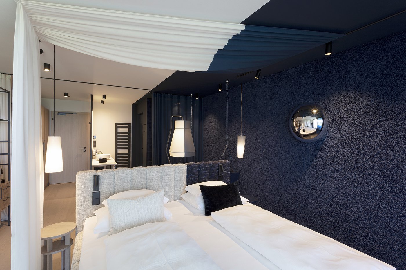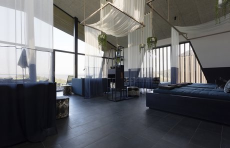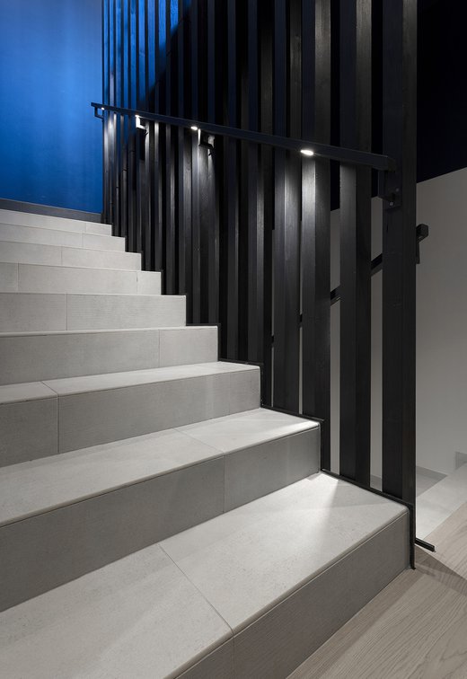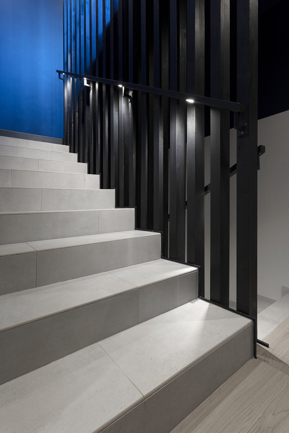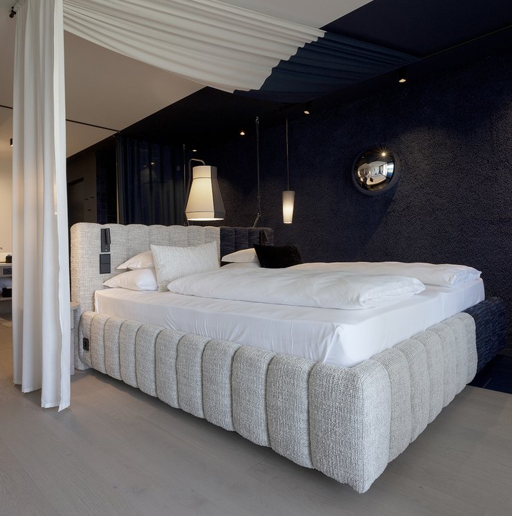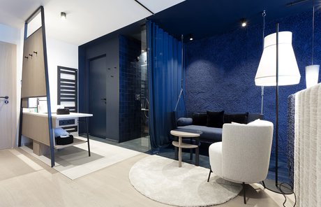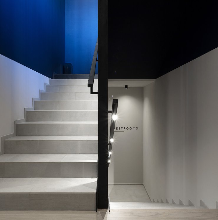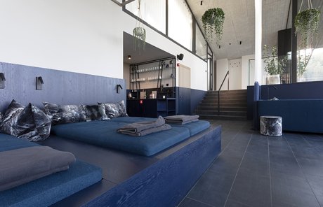 Nella zona Wellness, il cuore di questo Luxury Resort a conduzione familiare, sono i pavimenti e rivestimenti in gres Stonecloud beige e blu a dare vita a questa dicotomia cromatica, rendendo omaggio alle foreste di larici e ai cieli stellati della zona.