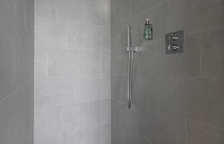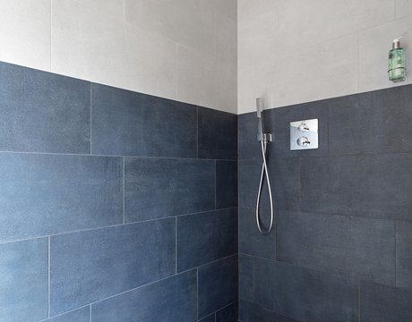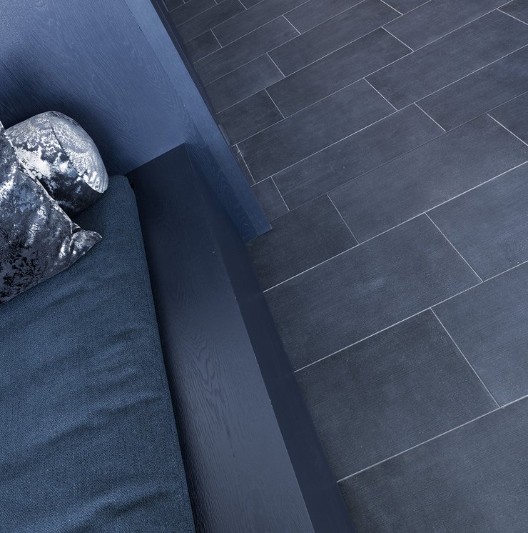 Installate nella raffinata finitura Trama, le ceramiche Marca Corona assicurano massima resistenza ai prodotti chimici, igiene e sicurezza antiscivolo, anche in queste zone a costante presenza di acqua.