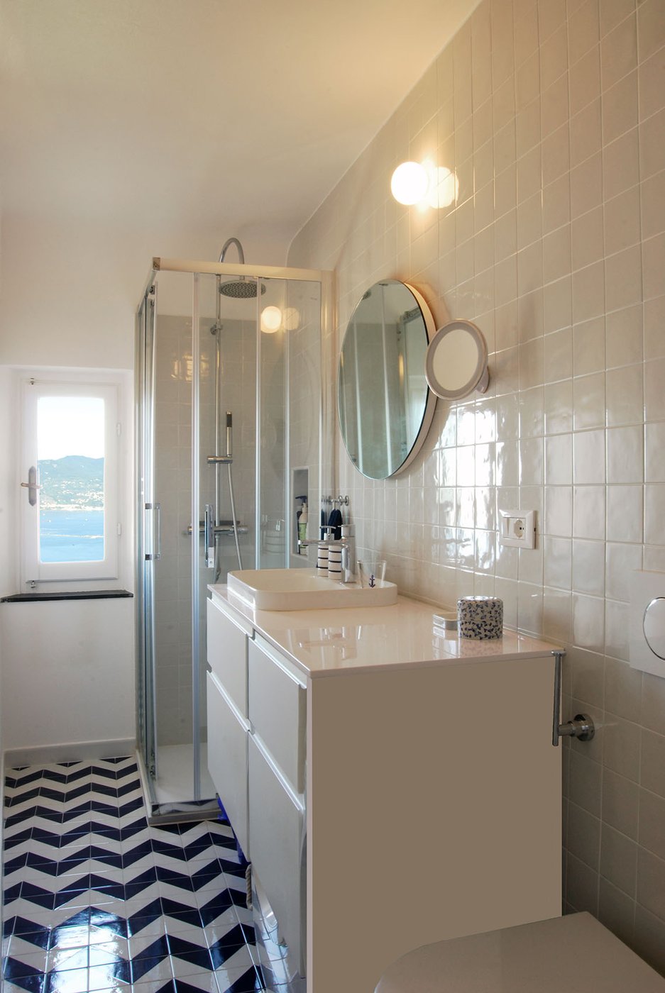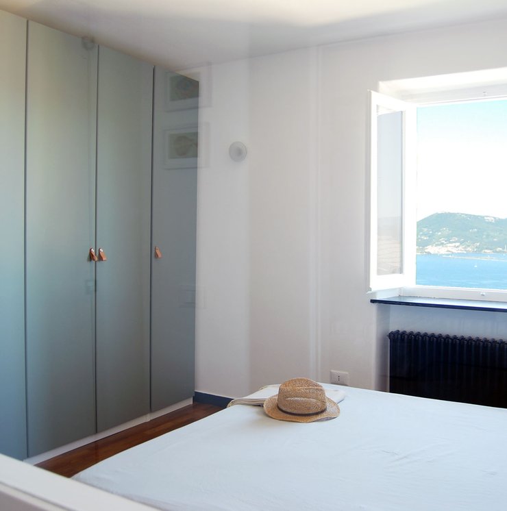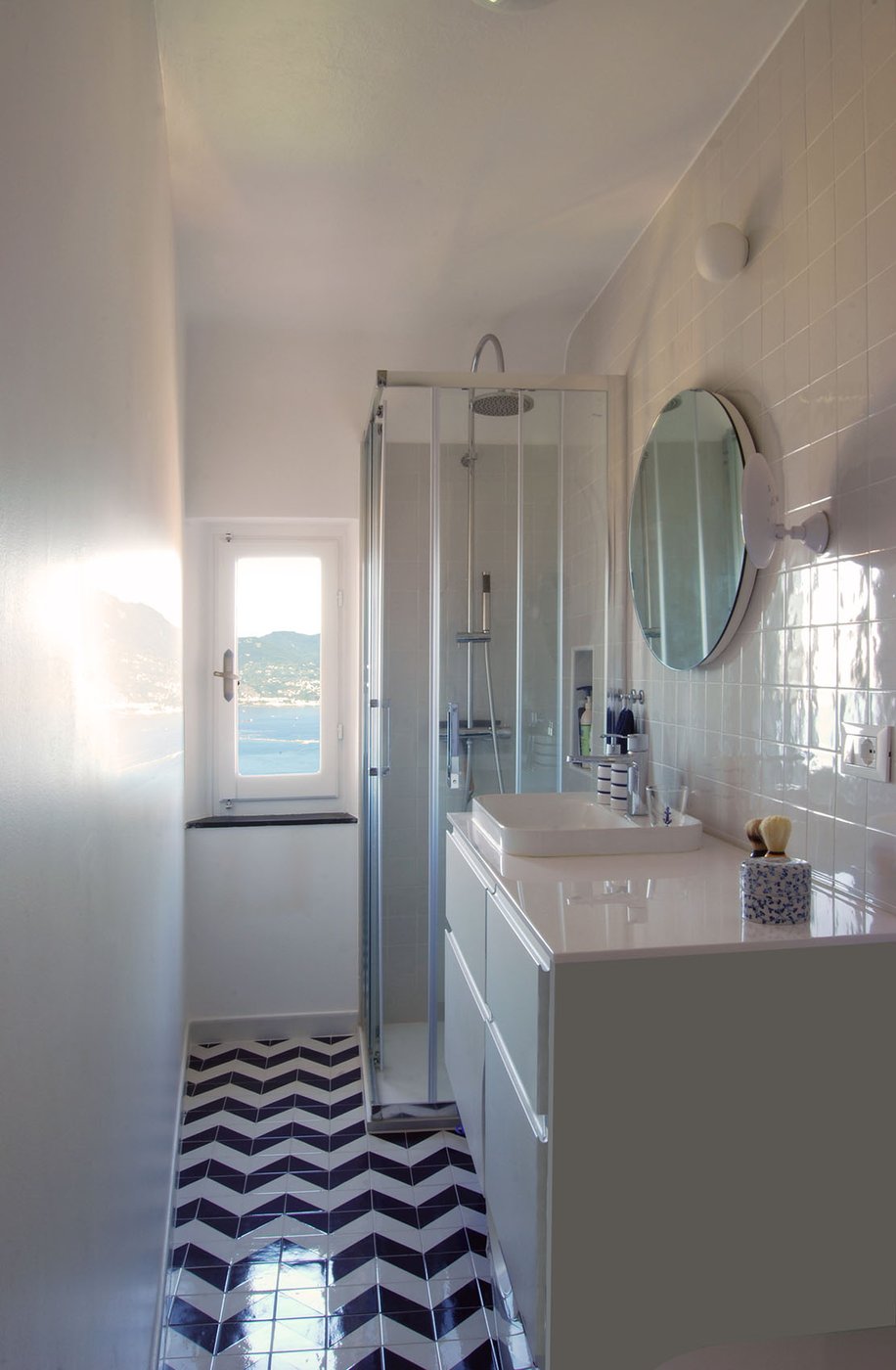 A pavimento, invece, il decoro triangolo riprende il movimento sinuoso ed il blu intenso del mare ligure, quasi annullando il confine fra ciò che è dentro l’appartamento e ciò che attende fuori il visitatore.