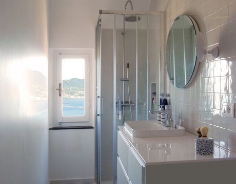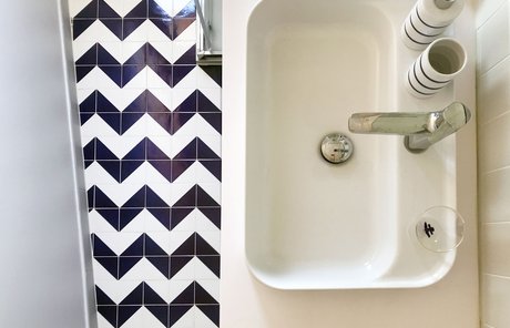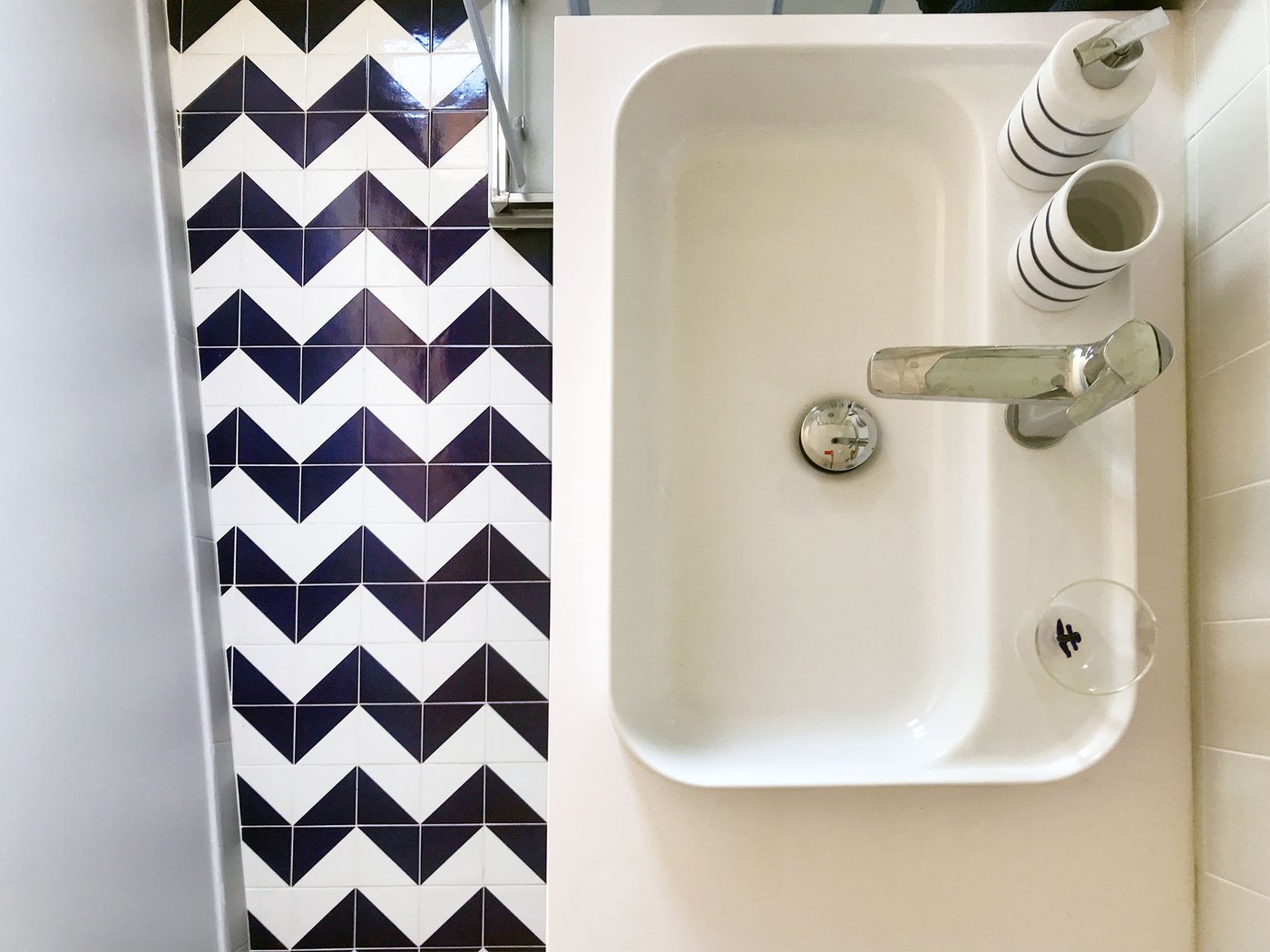Le piastrelle in gres porcellanato smaltato Maiolica firmate Marca Corona sono state scelte per decorare la piccola ma deliziosa stanza da bagno: a parete si è deciso di optare per delle cementine bianco gesso, in grado di moltiplicare la percezione di spazio e rendere l’intero ambiente più luminoso.