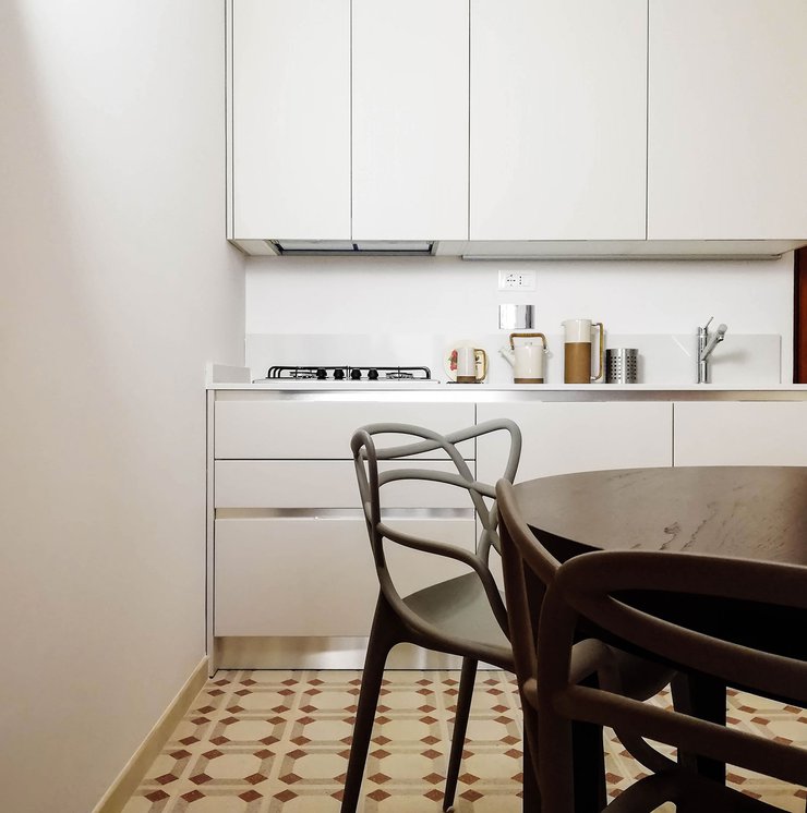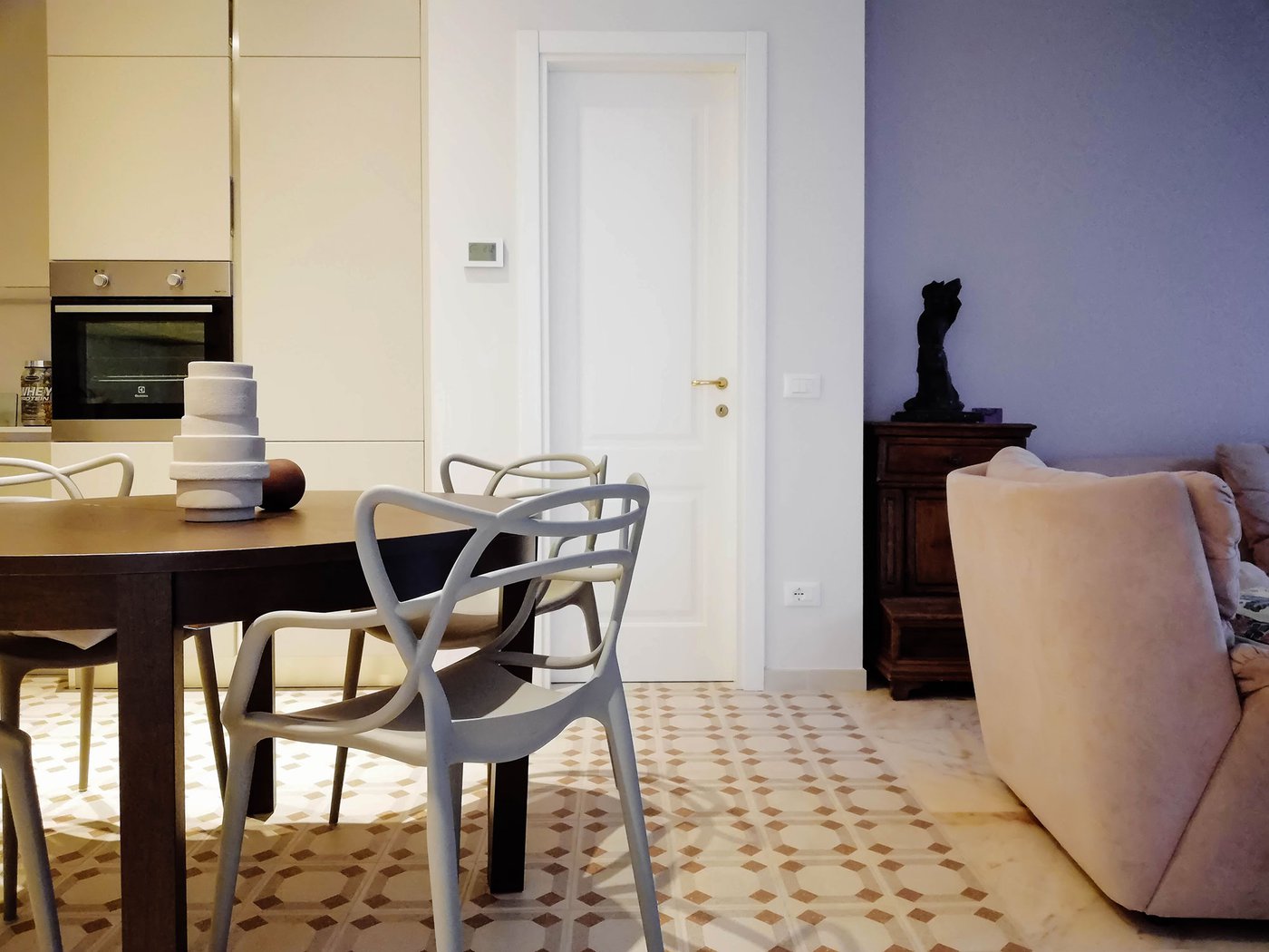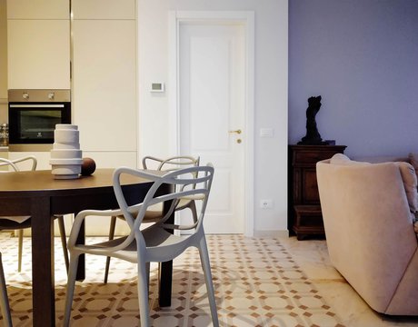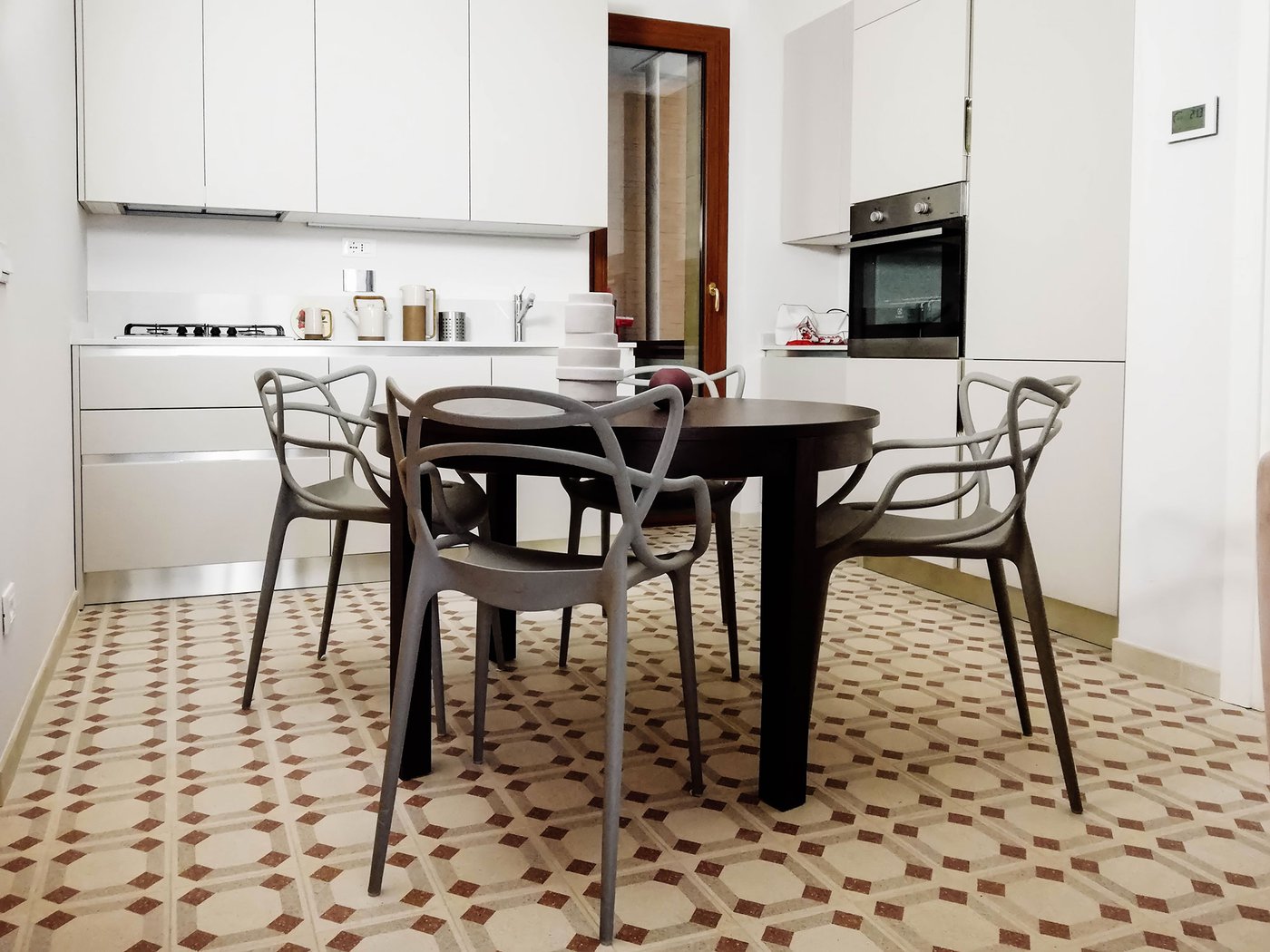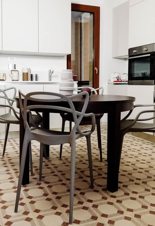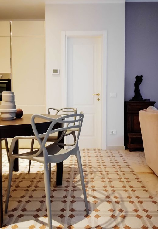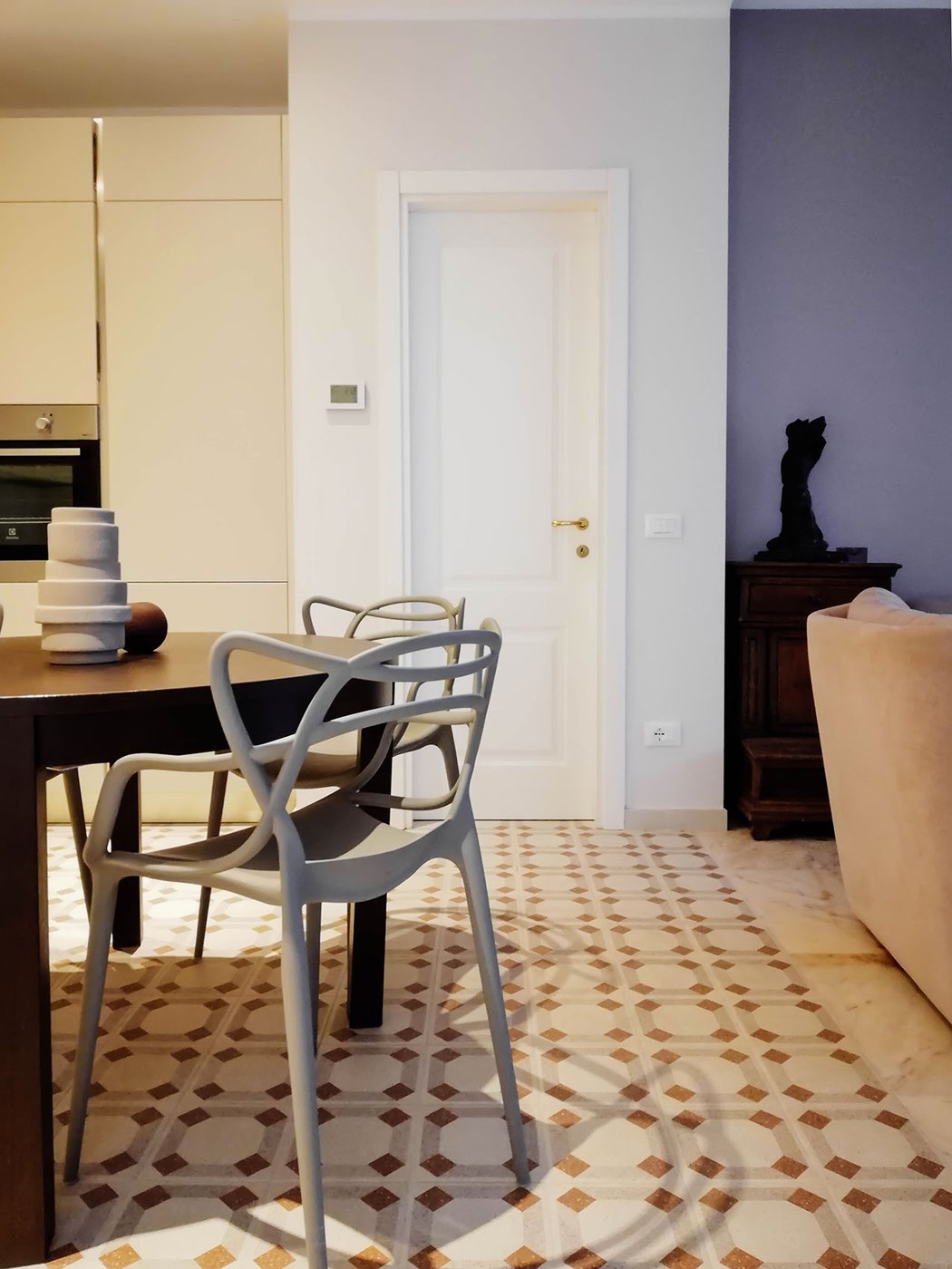 Per un appartamento ristrutturato di Sanremo è stata scelta Forme, la serie 1741 dal gusto più mediterraneo e autentico. I pavimenti con piastrelle in piccolo formato effetto graniglia si ritrovano nella zona cucina e giorno: nella variante colore calda, il decoro geometrico Ethos riesce a creare un’atmosfera decisamente intima e avvolgente.
