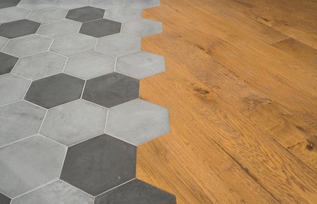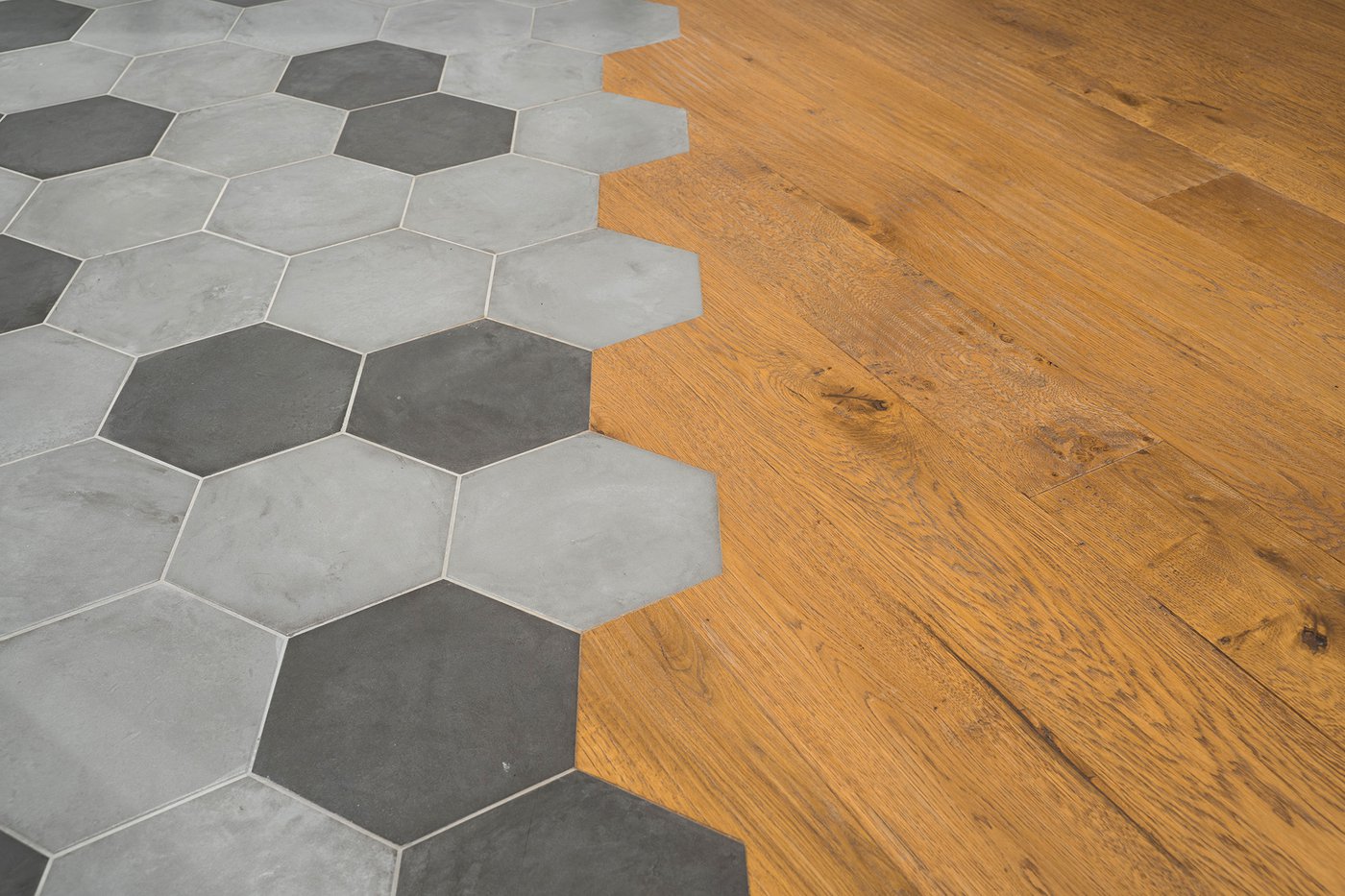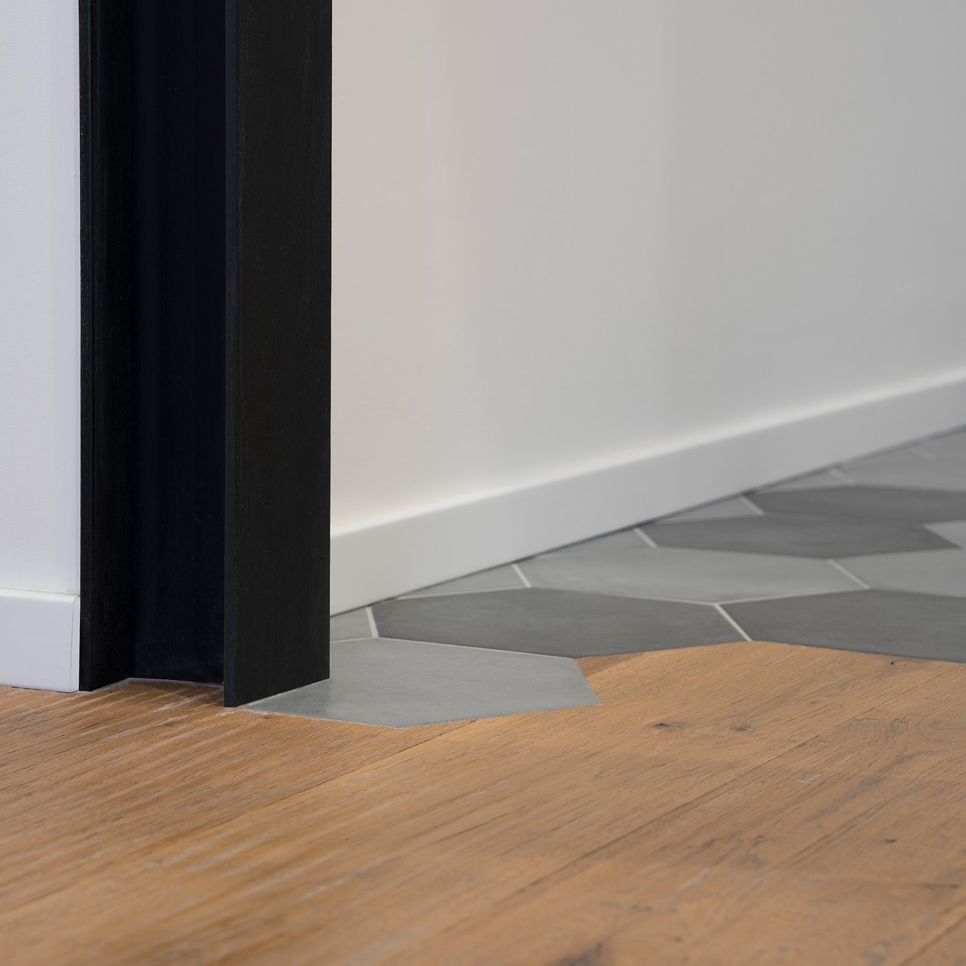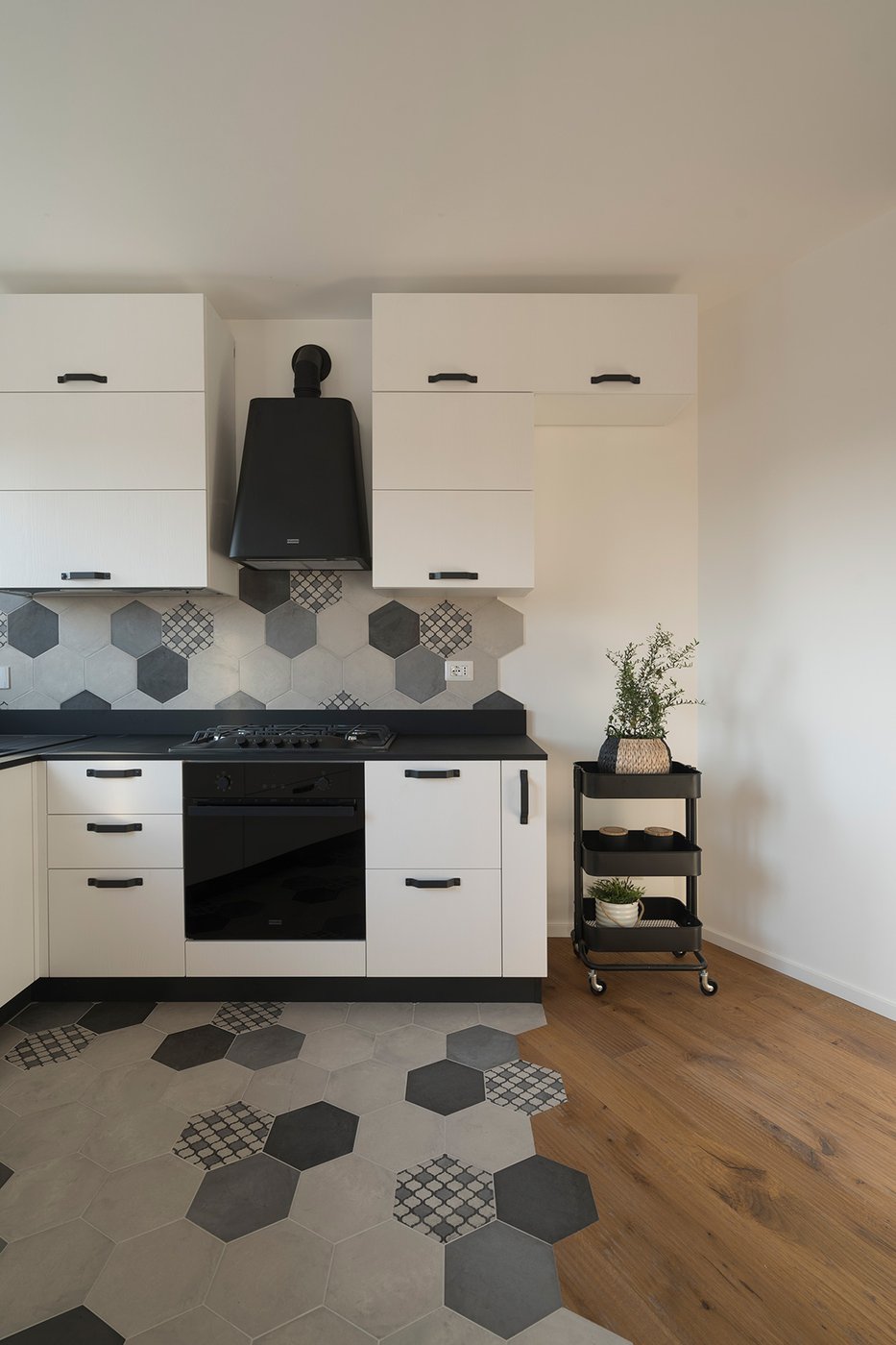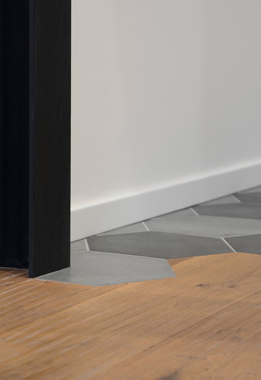 L’autenticità avvolgente dei pavimenti in parquet si sposa al fascino delle cementine dai toni gessati, posate sia a pavimento che rivestimento in un piacevole gioco cromatico. Un connubio equilibrato e raffinato ma al contempo moderno, grazie all’originalità dei patterns delle piastrelle in gres porcellanato effetto cotto Terra e alla presenza di travi a vista in metallo scuro.