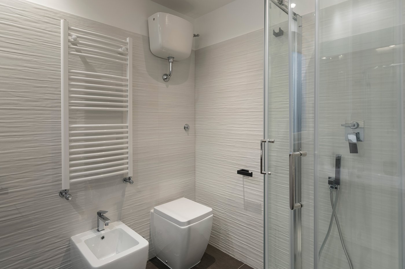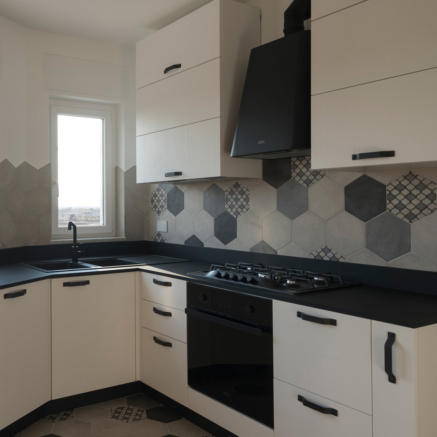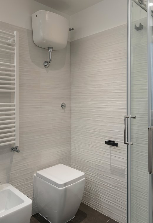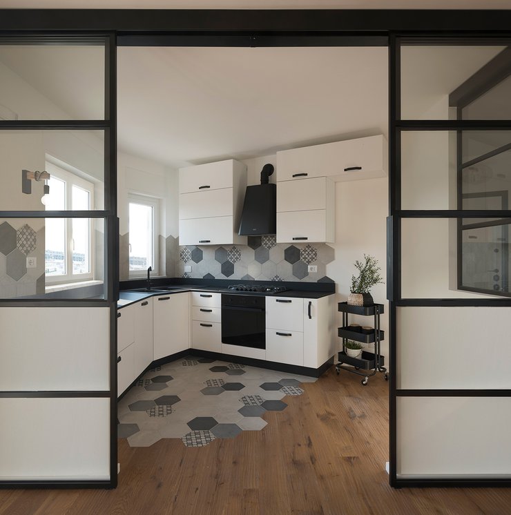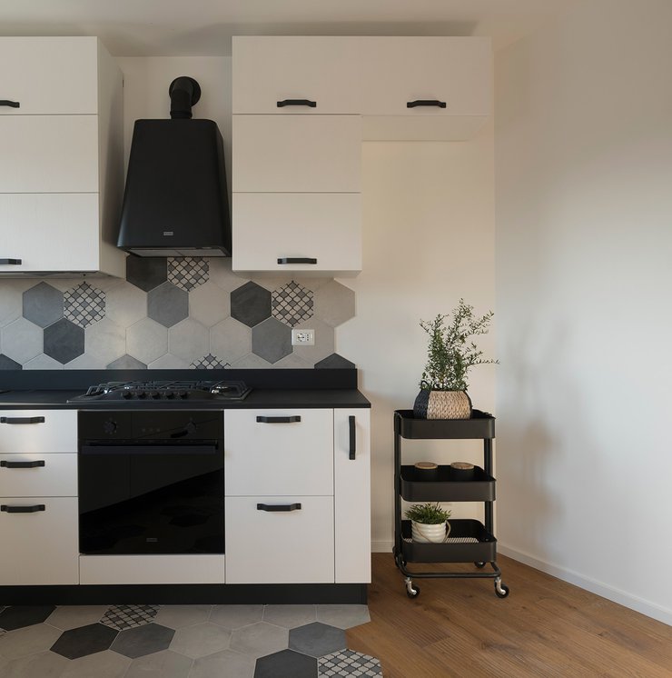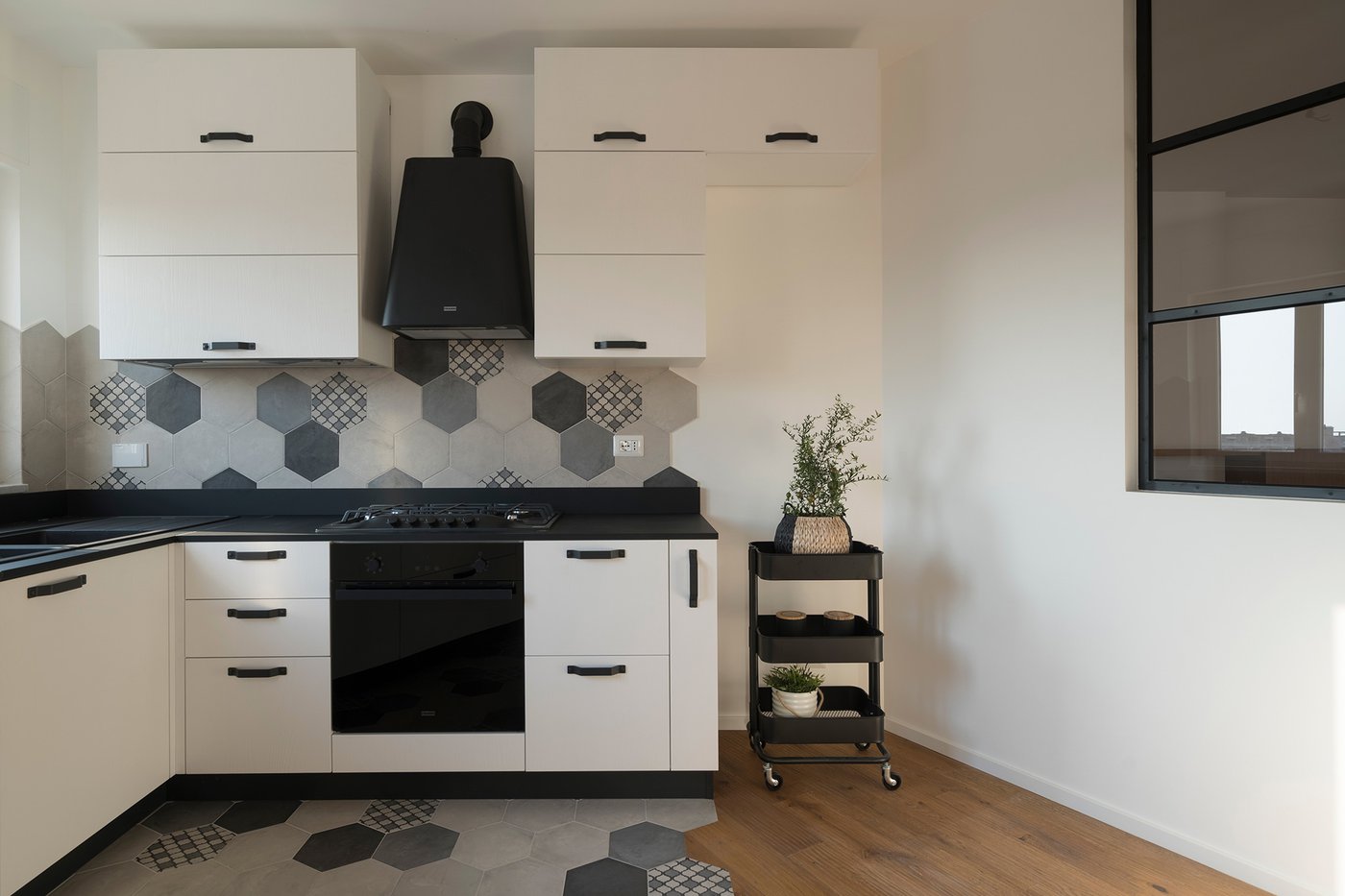 L’autenticità avvolgente dei pavimenti in parquet si sposa al fascino delle cementine dai toni gessati, posate sia a pavimento che rivestimento in un piacevole gioco cromatico. Un connubio equilibrato e raffinato ma al contempo moderno, grazie all’originalità dei patterns delle piastrelle in gres porcellanato effetto cotto Terra e alla presenza di travi a vista in metallo scuro.