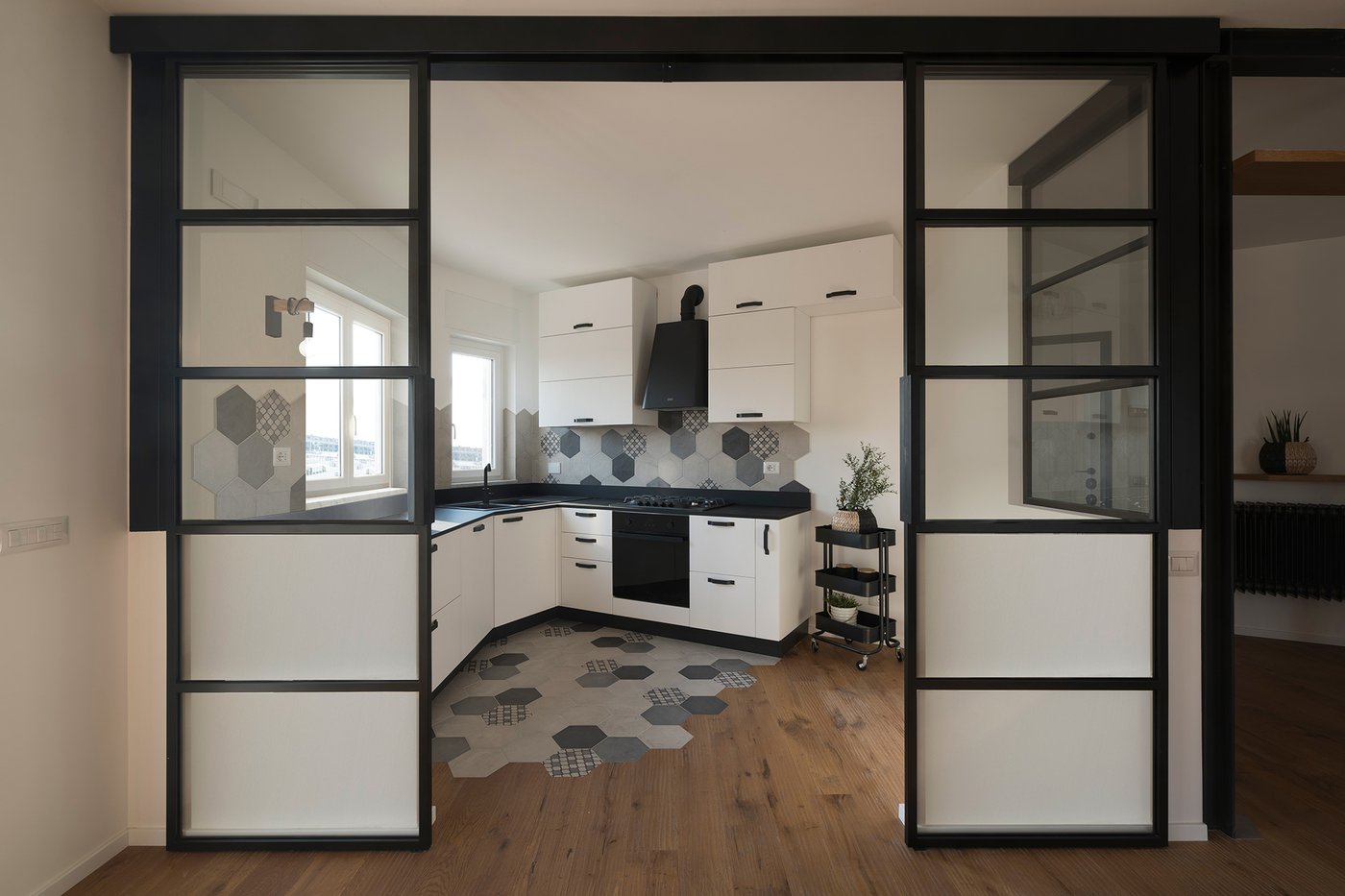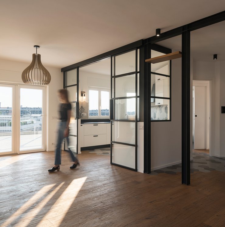 Per la zona giorno si è optato quindi per un enorme open space, dove salotto, zona pranzo e cucina dialogano tra loro, separati da una semplice vetrata in ferro, studiata per isolare i profumi della cucina, senza bloccare la luce.