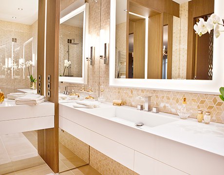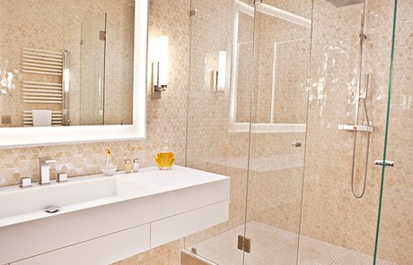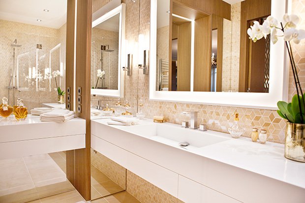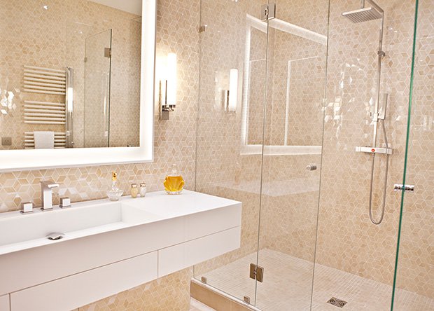 La collezione ceramica in gres porcellanato effetto marmo Deluxe impreziosisce infatti la stanza da bagno, proposta nell’elegante tonalità Beige sia a pavimento, in finitura Reflex, che a rivestimento, come ricercato mosaico di tesserine romboidali.