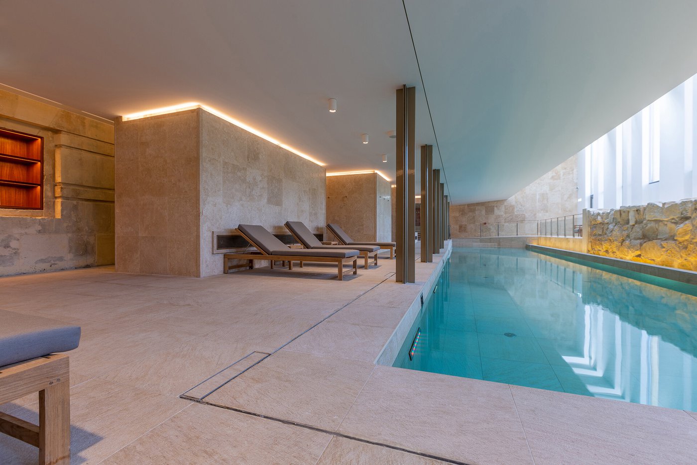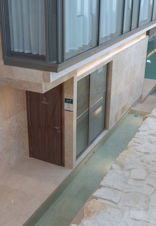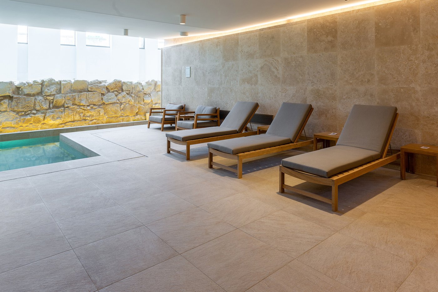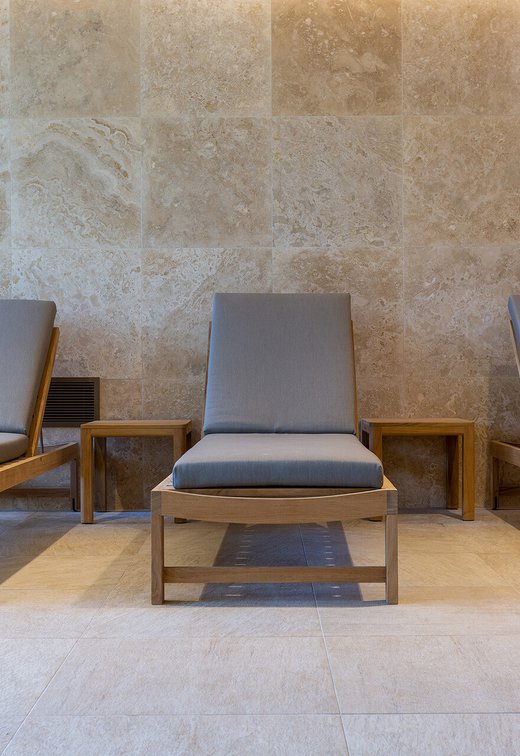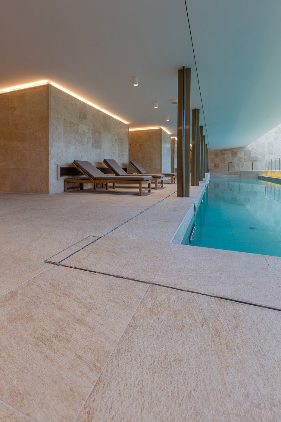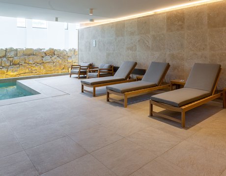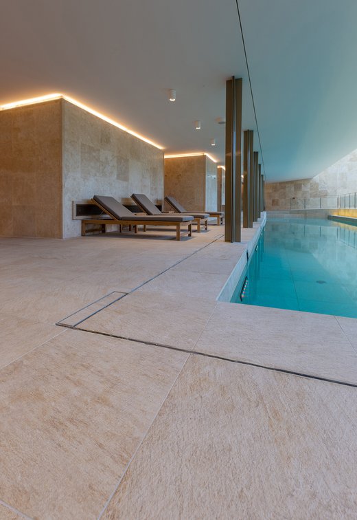 I pavimenti e rivestimenti in gres effetto pietra Stoneline, nell’elegante tonalità beige, donano all’intera struttura un carattere autentico ma esclusivo. Grazie alla versione Grip, le piastrelle Stoneline rappresentano la soluzione ideale anche a bordo e fondo piscina, dove assicurano superiore resistenza a cloro, muffe e batteri, e massima sicurezza antiscivolo.