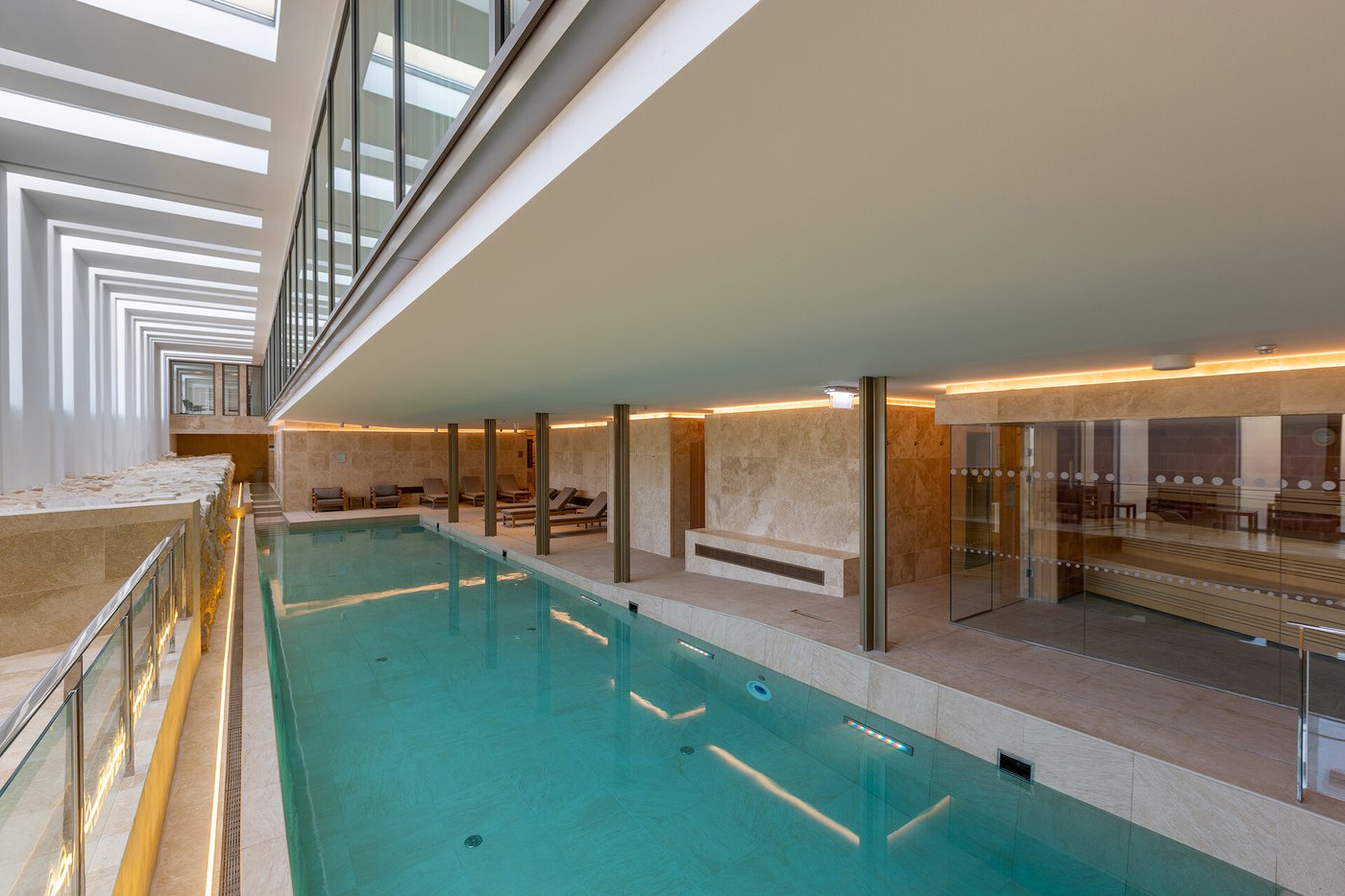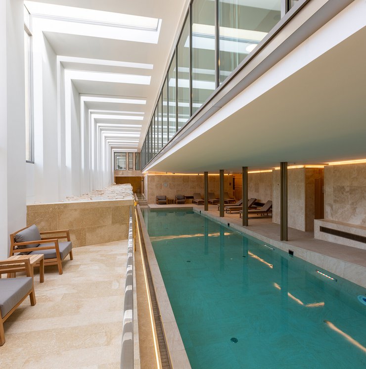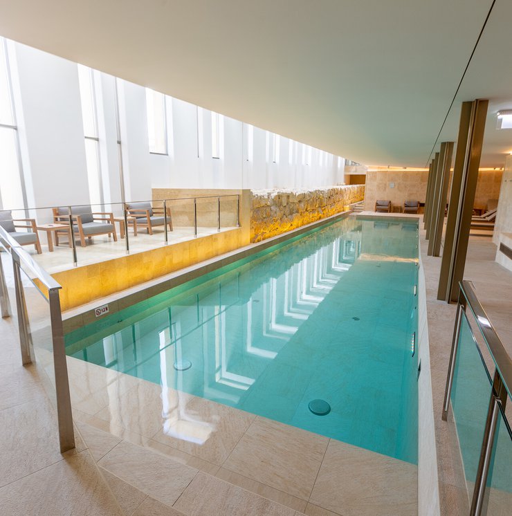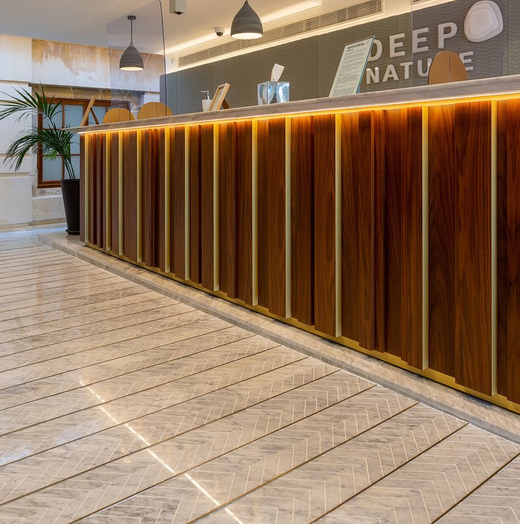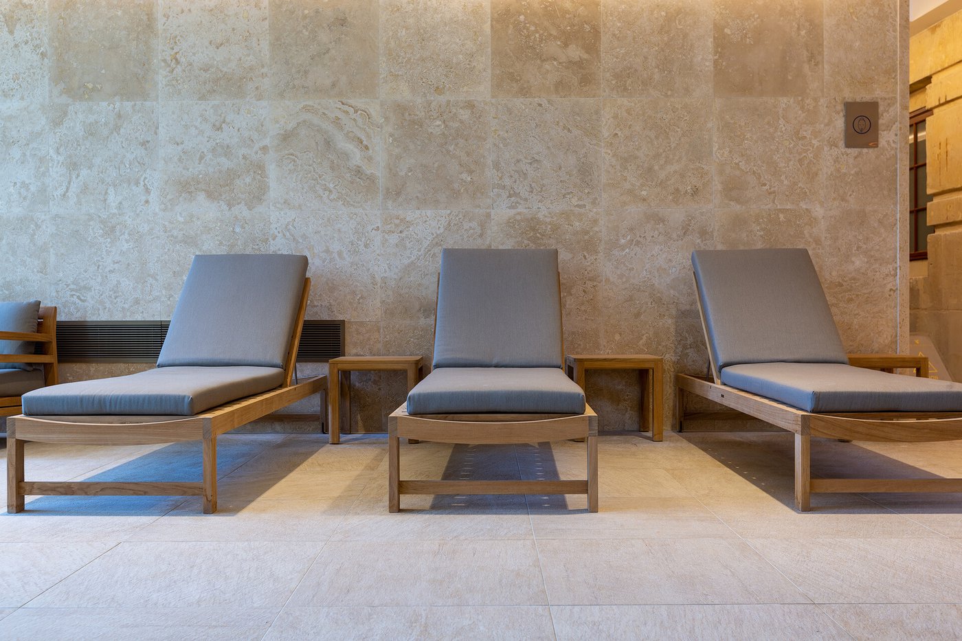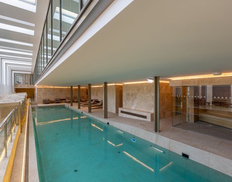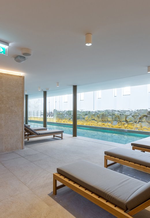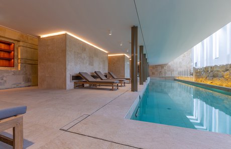 I pavimenti e rivestimenti in gres effetto pietra Stoneline, nell’elegante tonalità beige, donano all’intera struttura un carattere autentico ma esclusivo. Grazie alla versione Grip, le piastrelle Stoneline rappresentano la soluzione ideale anche a bordo e fondo piscina, dove assicurano superiore resistenza a cloro, muffe e batteri, e massima sicurezza antiscivolo.