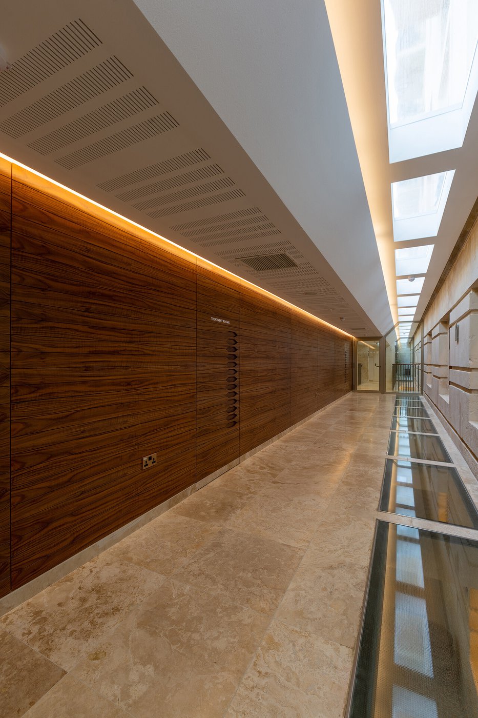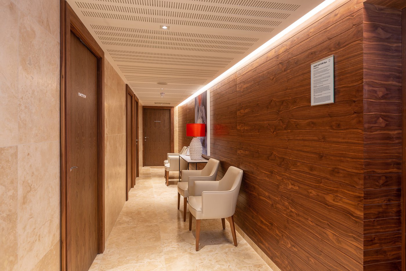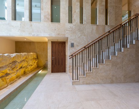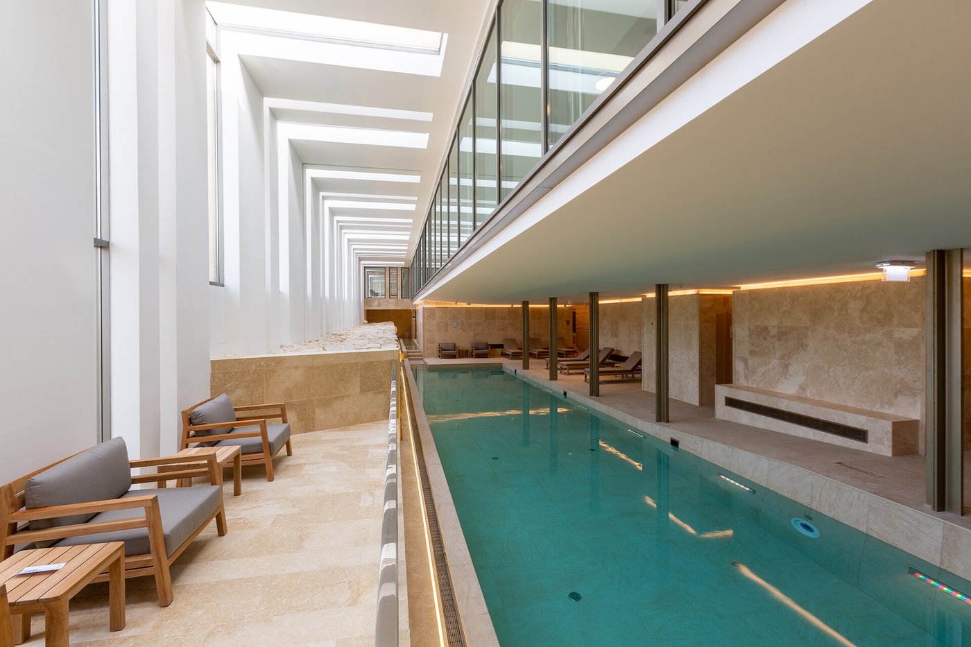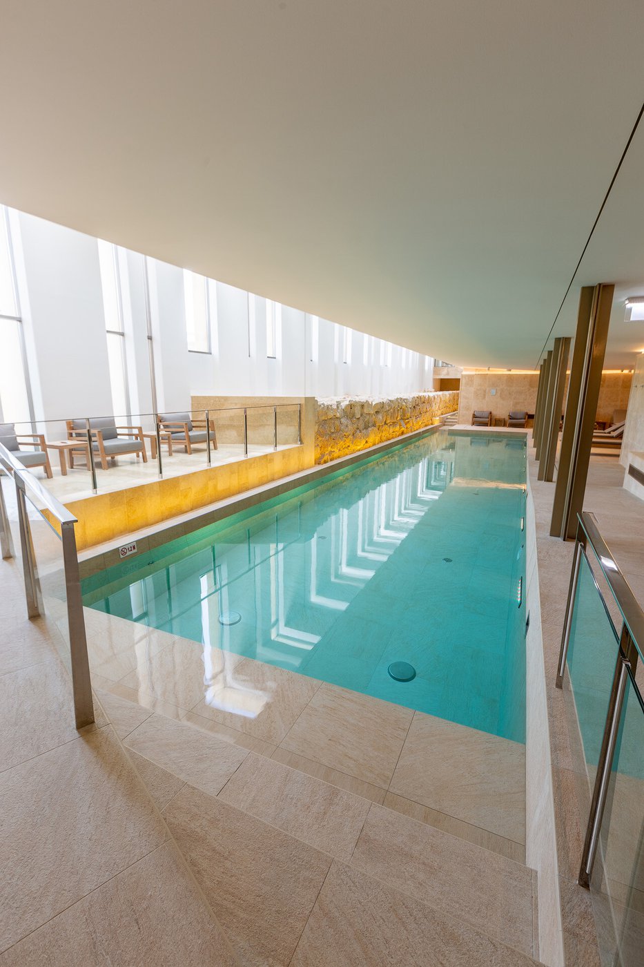 I pavimenti e rivestimenti in gres effetto pietra Stoneline, nell’elegante tonalità beige, donano all’intera struttura un carattere autentico ma esclusivo. Grazie alla versione Grip, le piastrelle Stoneline rappresentano la soluzione ideale anche a bordo e fondo piscina, dove assicurano superiore resistenza a cloro, muffe e batteri, e massima sicurezza antiscivolo.
