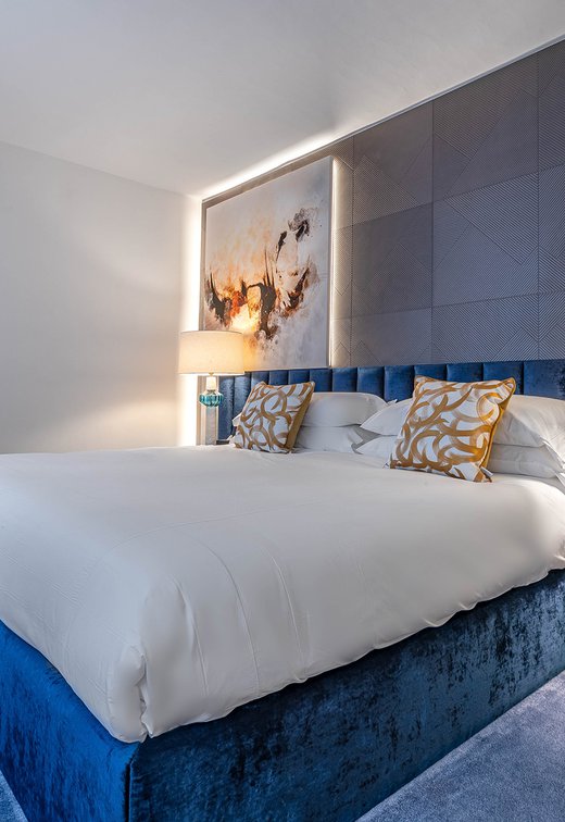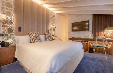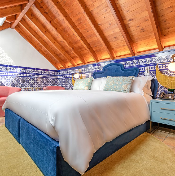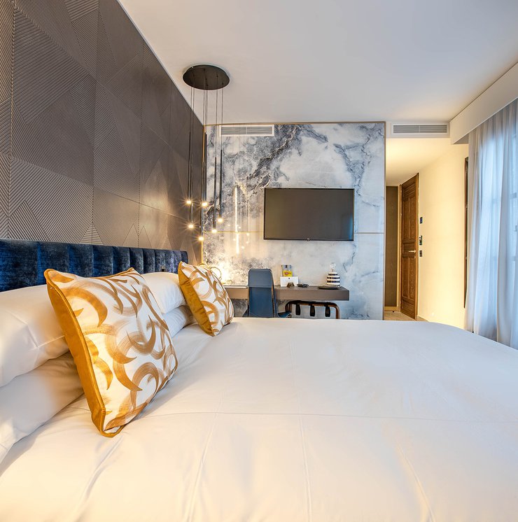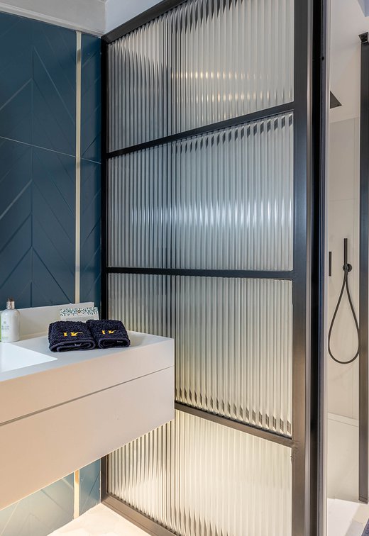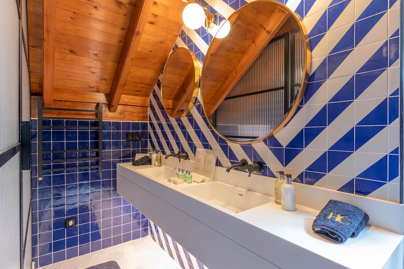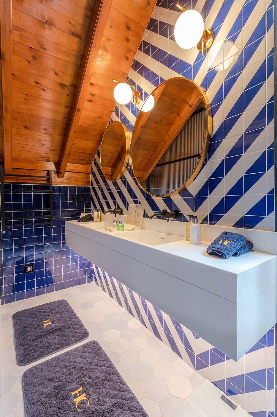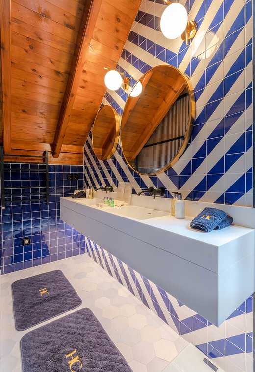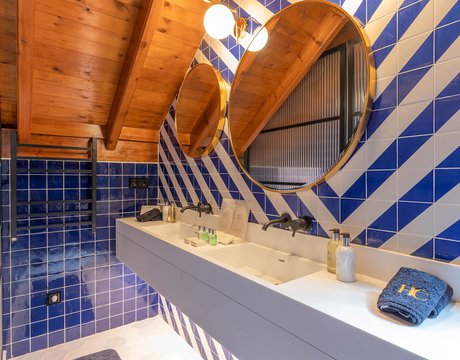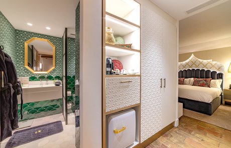 Le ceramiche Marca Corona sono state scelte per impreziosire 2 suites private nelle ampie zone bagno: nella camera Alhambra, ispirata alla città di Granada e ai suoi vivaci giardini arabi, si possono apprezzare i rivestimenti Maiolica, perfetti con il loro blu vivace dalla finitura glossy. Nella suite Maestranza, ispirata alla meravigliosa Siviglia, si ritrovano invece i rivestimenti 4D, più intensi, raffinati e moderni nella variante blu notte dai rilievi geometrici.