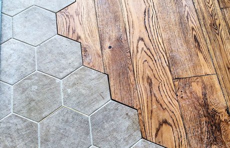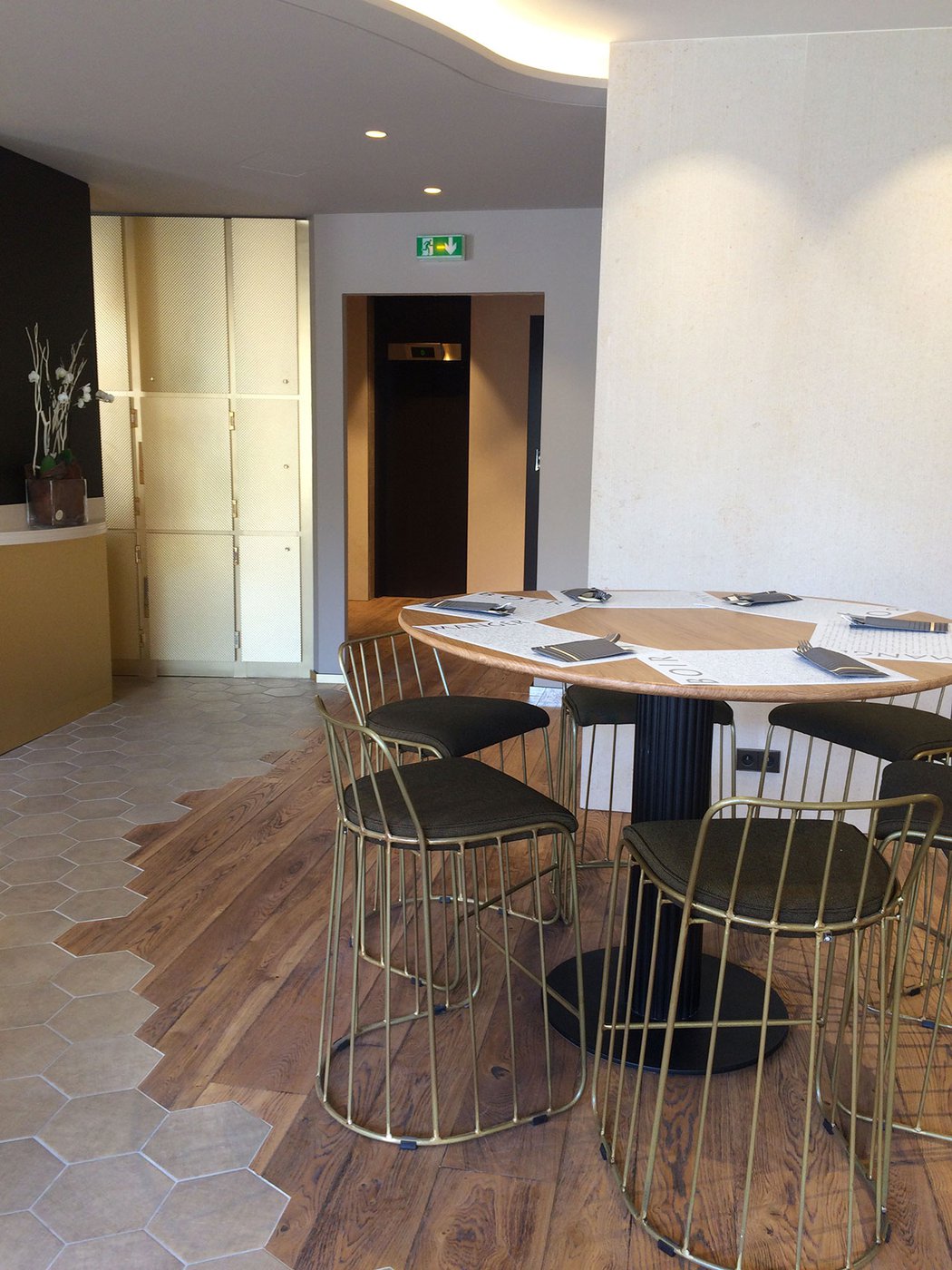 Nella Hall, nella zona Bar e nelle aree comuni dell’albergo, l’originale formato esagonale viene accostato al parquet naturale, creando un crossing raffinato e ultramoderno. Il tocco finale è dato dai profili metallici a contrasto, che incorniciano i delicati esagoni e rafforzano l’espressività materica di questo gioiello 1741.