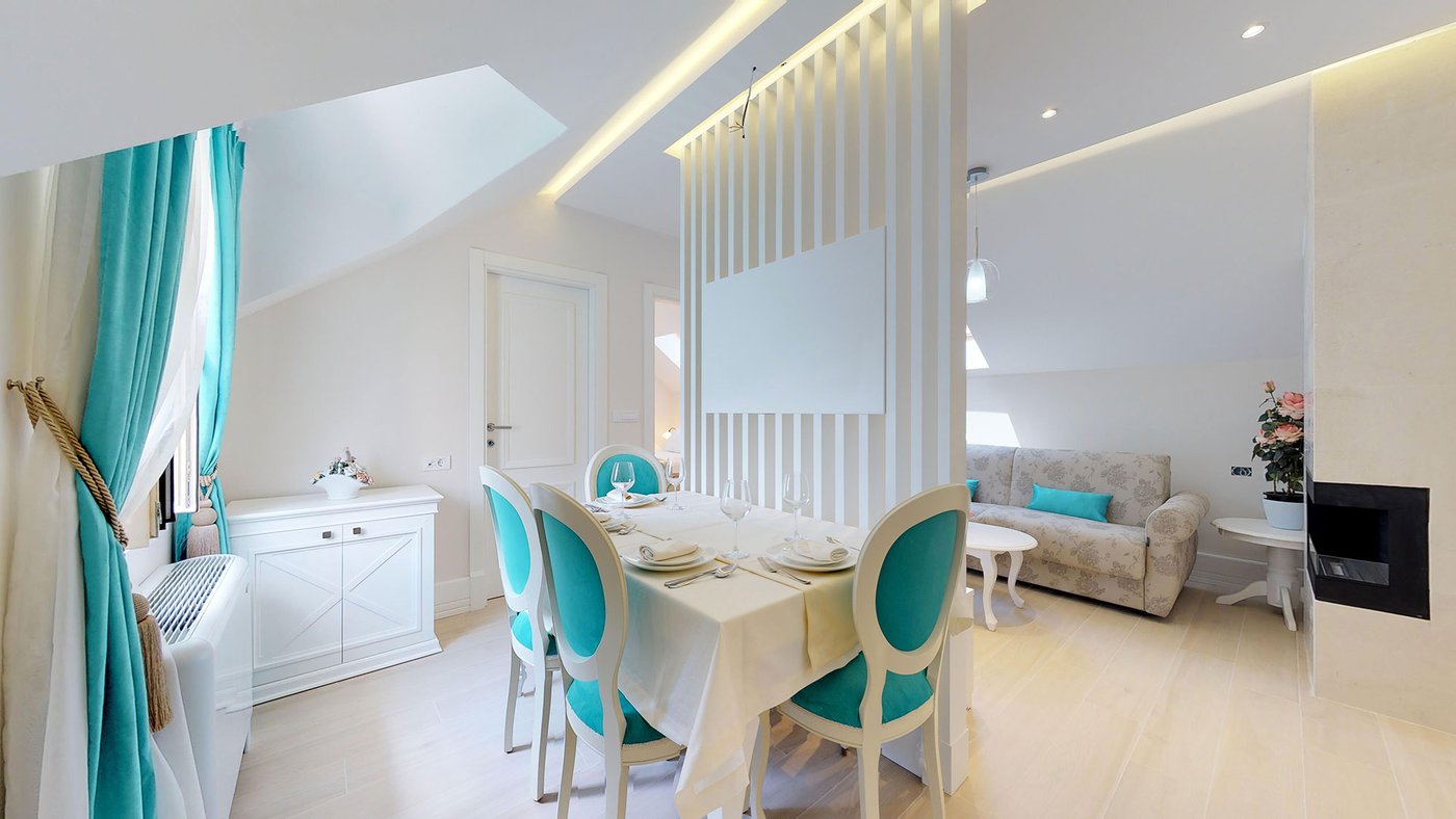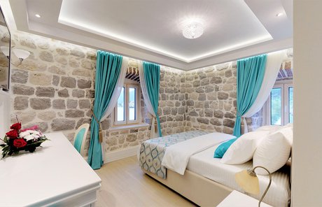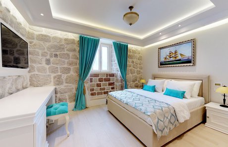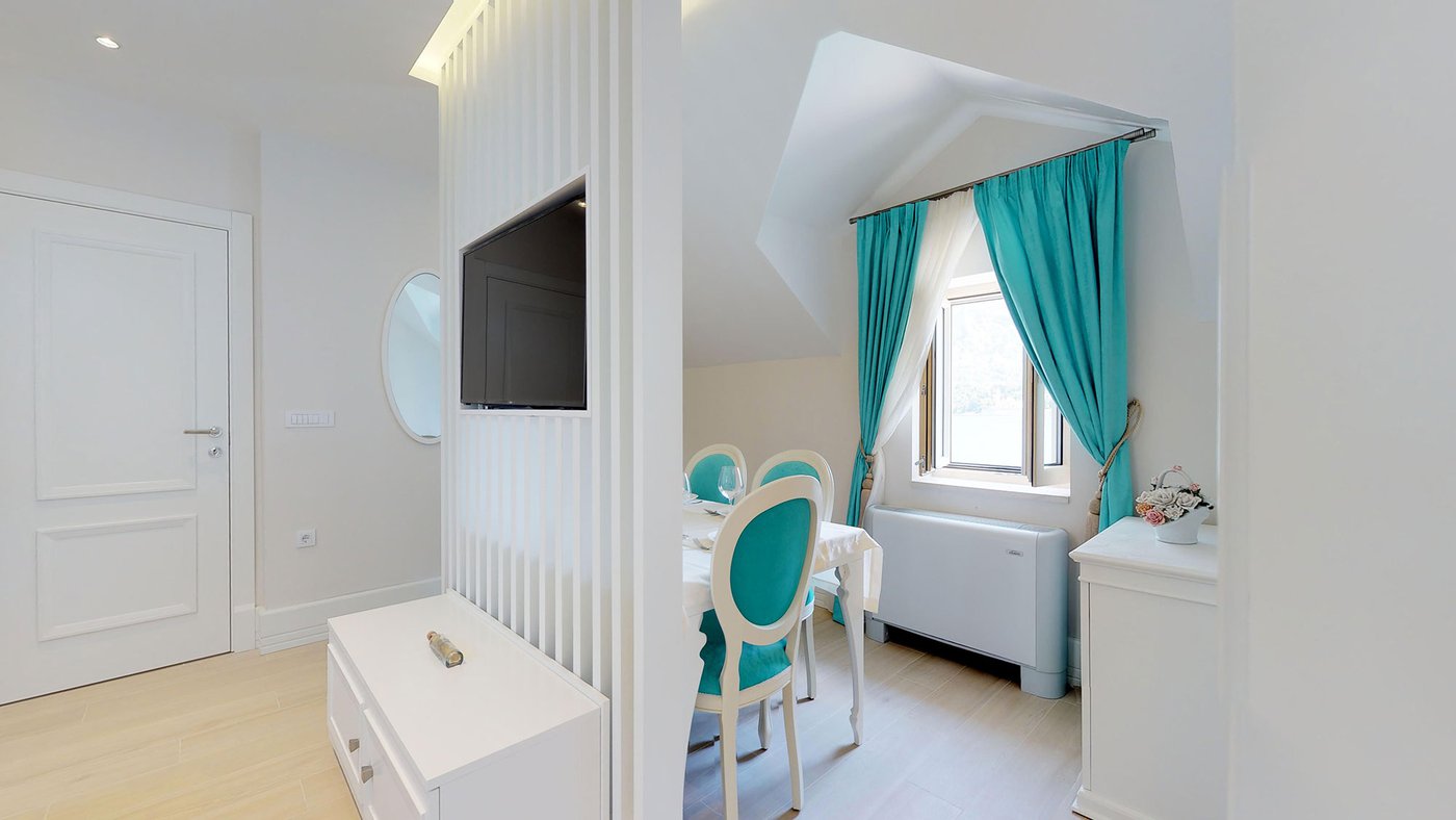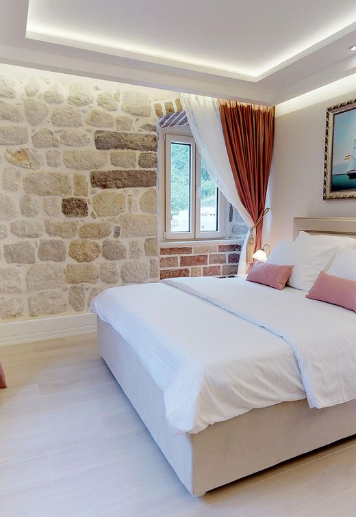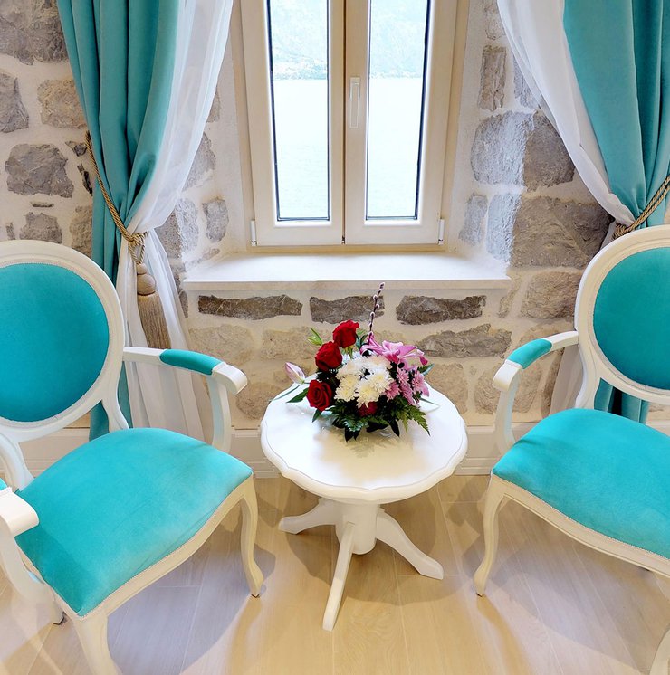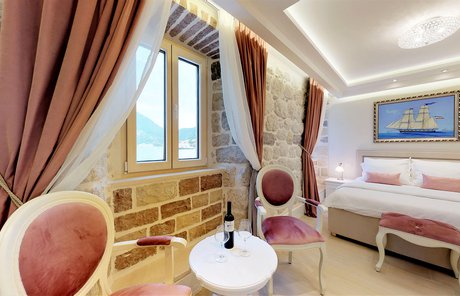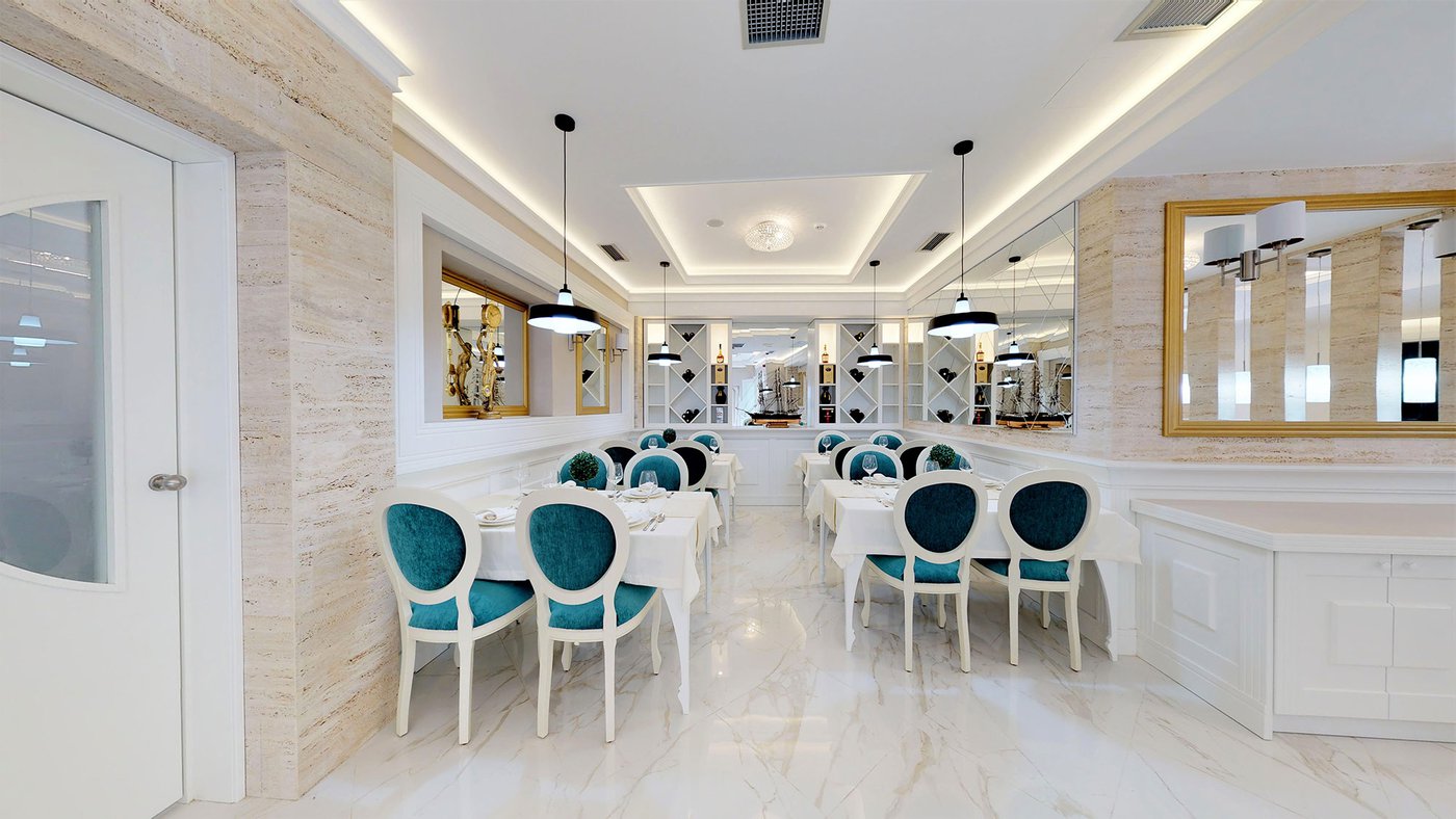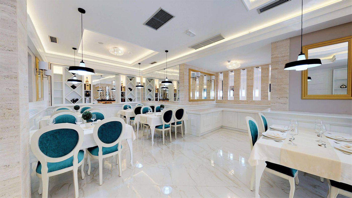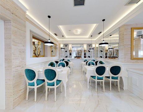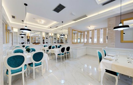 Nell'elegante Hotel Libertas, affacciato sulla Baia di Kotor, gli ospiti vengono accolti dalla serie ceramica in gres effetto marmo Motif Extra, perfetta nella variante Gold Reflex per donare un tocco luminoso e raffinato alla Reception. Le stesse superfici effetto marmo si ritrovano anche nell’ampia Sala Ristorante accostate ad arredi chiari e sedute imbottite dai colori decisi.