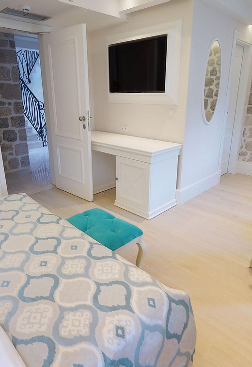 Nelle Suites si può invece apprezzare l’atmosfera intima e ricercata creata dai pavimenti in ceramica effetto legno Essences Extra. La tonalità chiara scelta, Elm, si sposa perfettamente ai muri faccia vista e ai tocchi di colore che caratterizzano ciascuna stanza. Dai terrazzini privati si può poi godere di una vista mozzafiato della piscina esterna e della spiaggia.