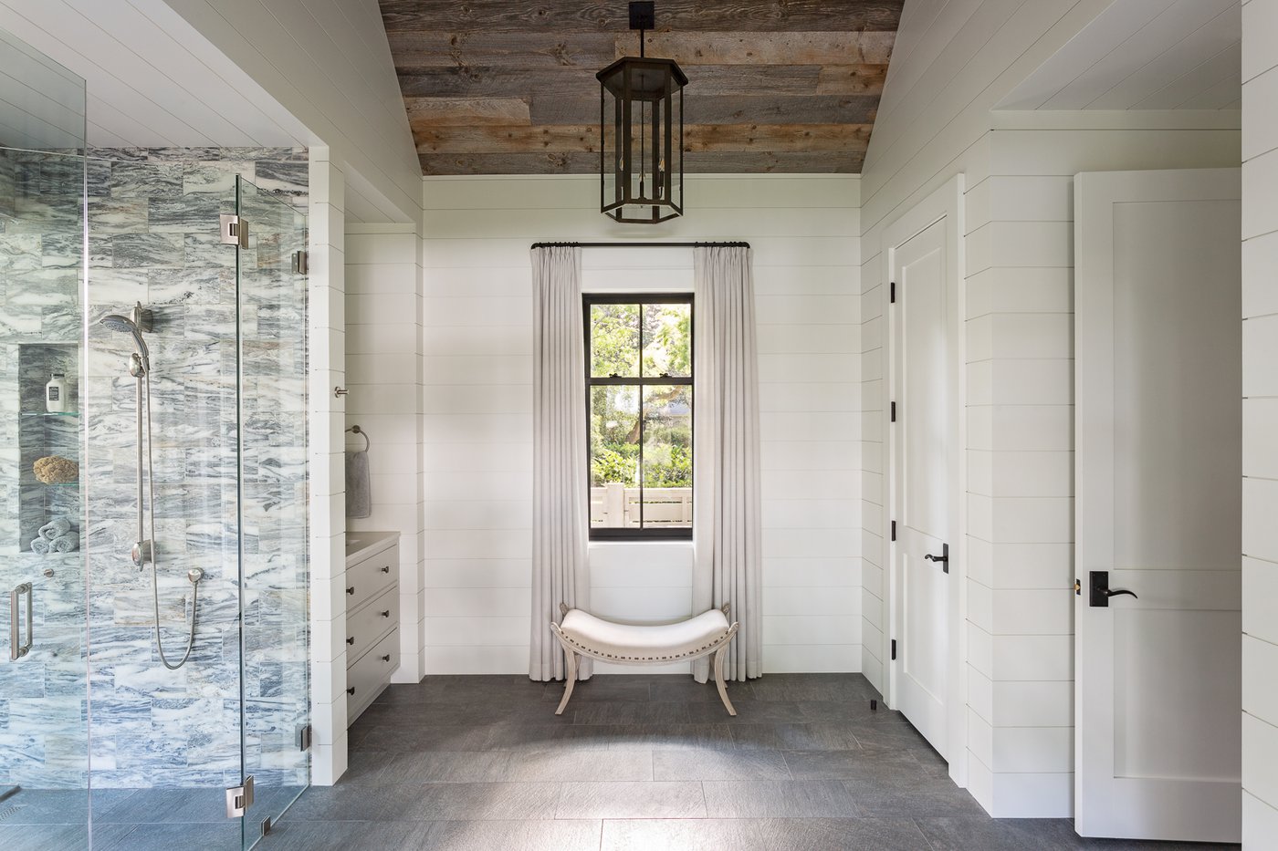 Per la pavimentazione del lussuoso bagno padronale, in particolare, sono state scelte le ceramiche effetto pietra Stoneline, una collezione in gres porcellanato dalla grafica autentica e decisa. Nella variante Black, i pavimenti Stoneline creano un piacevole contrasto con il candore delle pareti e della vasca standing, interpretando a pieno il gioco tra lusso architettonico e natura incontaminata.