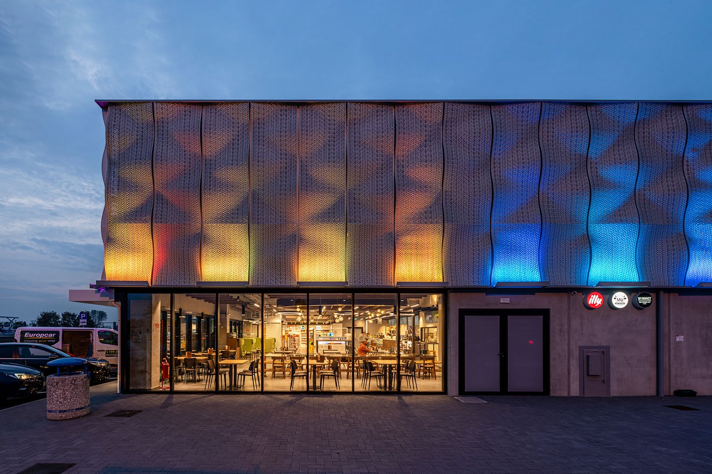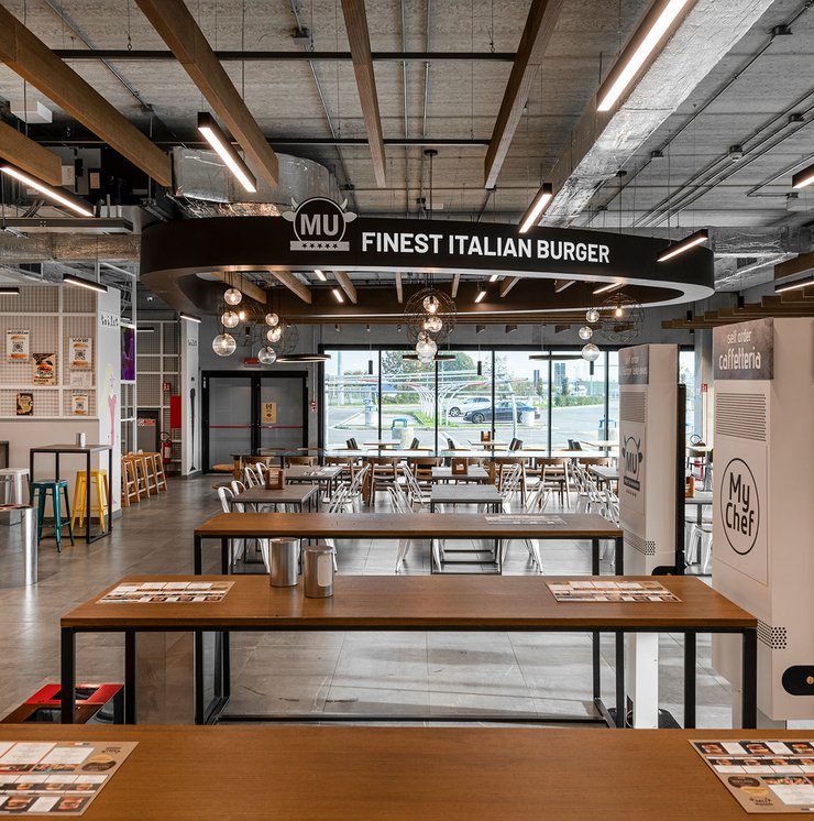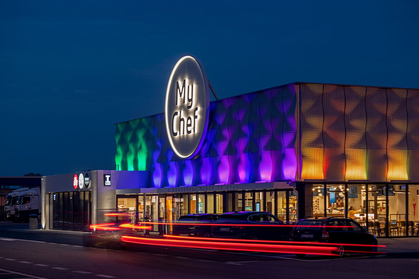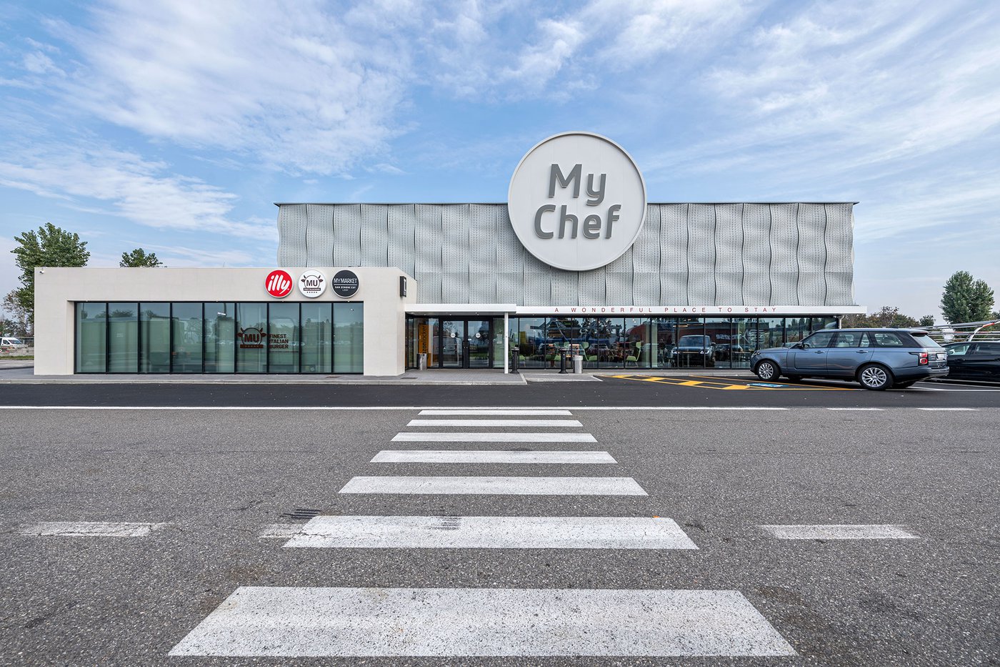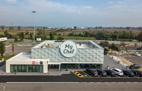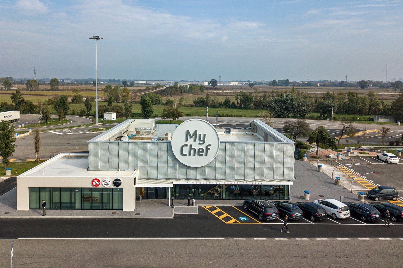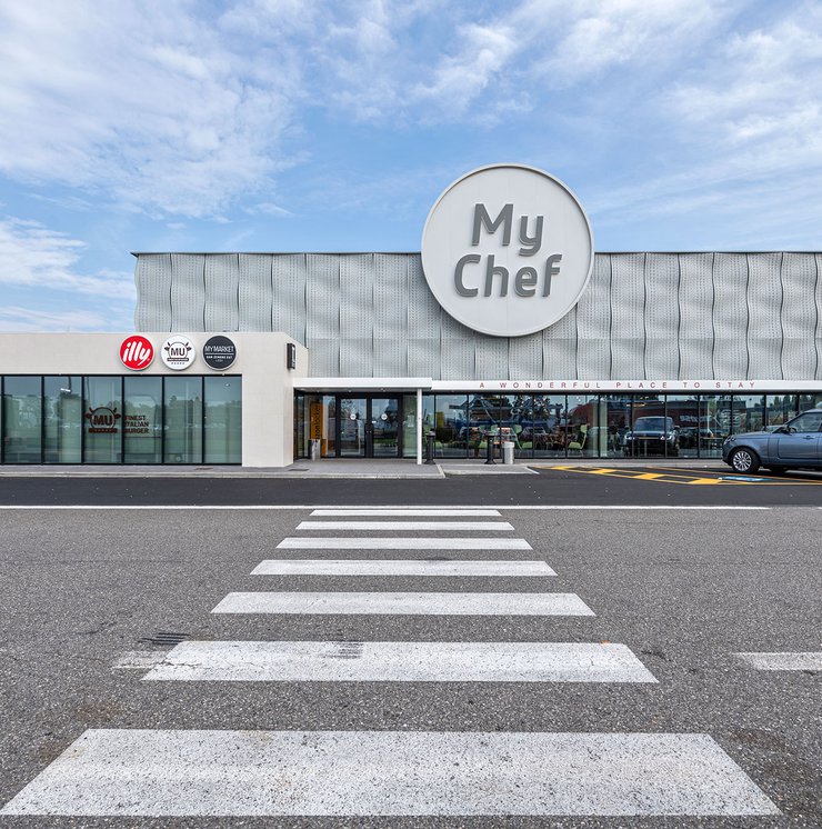 La celebre catena My Chef voleva donare un carattere moderno e hitech alla nuova area di servizio nei pressi di Lodi. Lo Studio Riboli ha dunque optato per un’infrastruttura esterna accattivante, dai volumi innovativi e dall’illuminazione multicolore. Gli oltre 400mq interni sono invece stati concepiti come un arioso open space, caratterizzato da un arredamento minimale e dai pavimenti in gres Marca Corona.