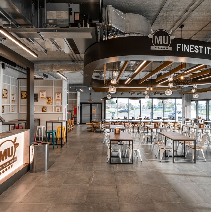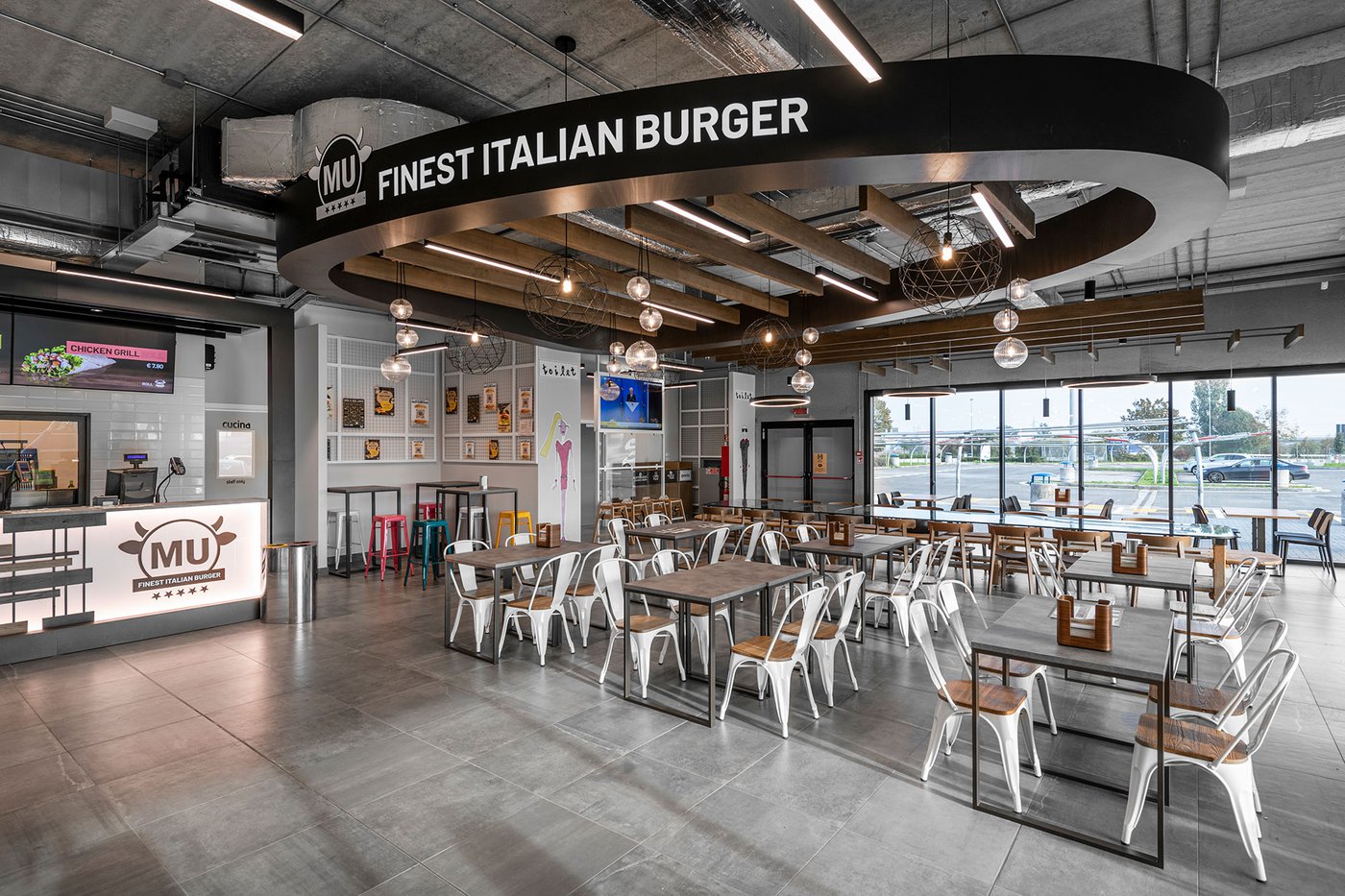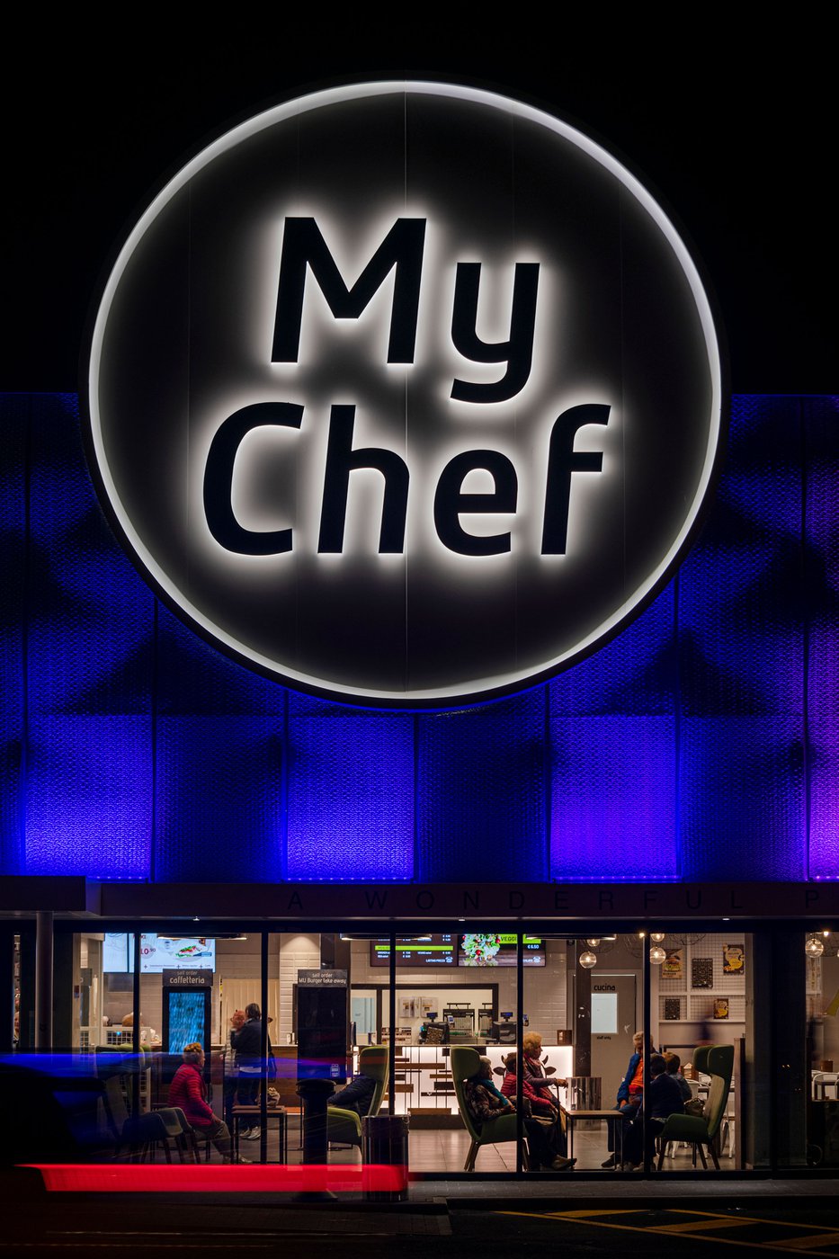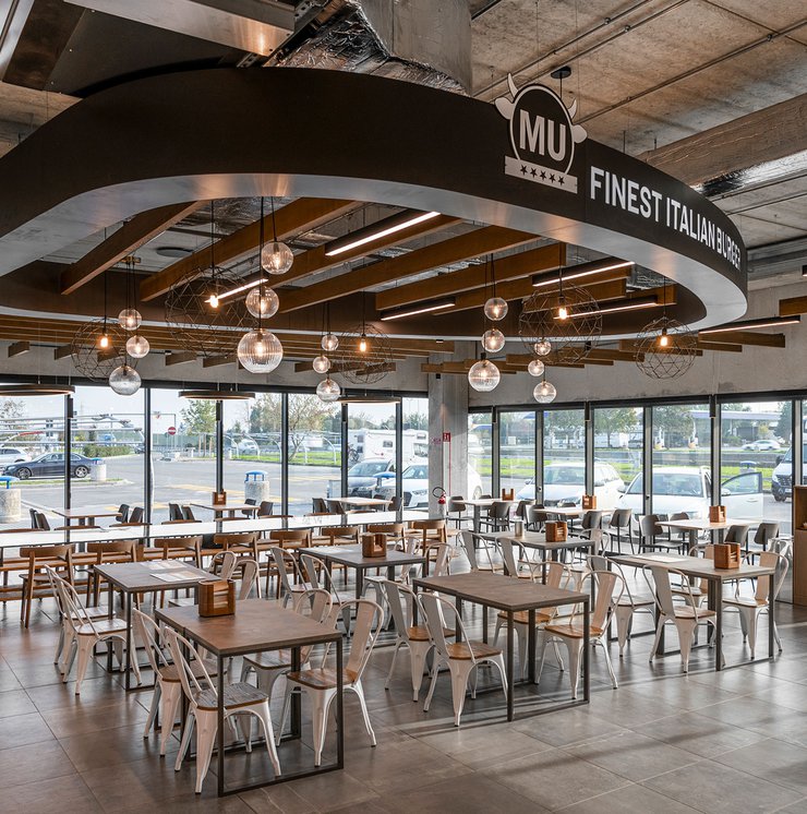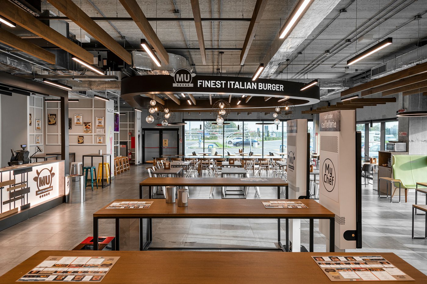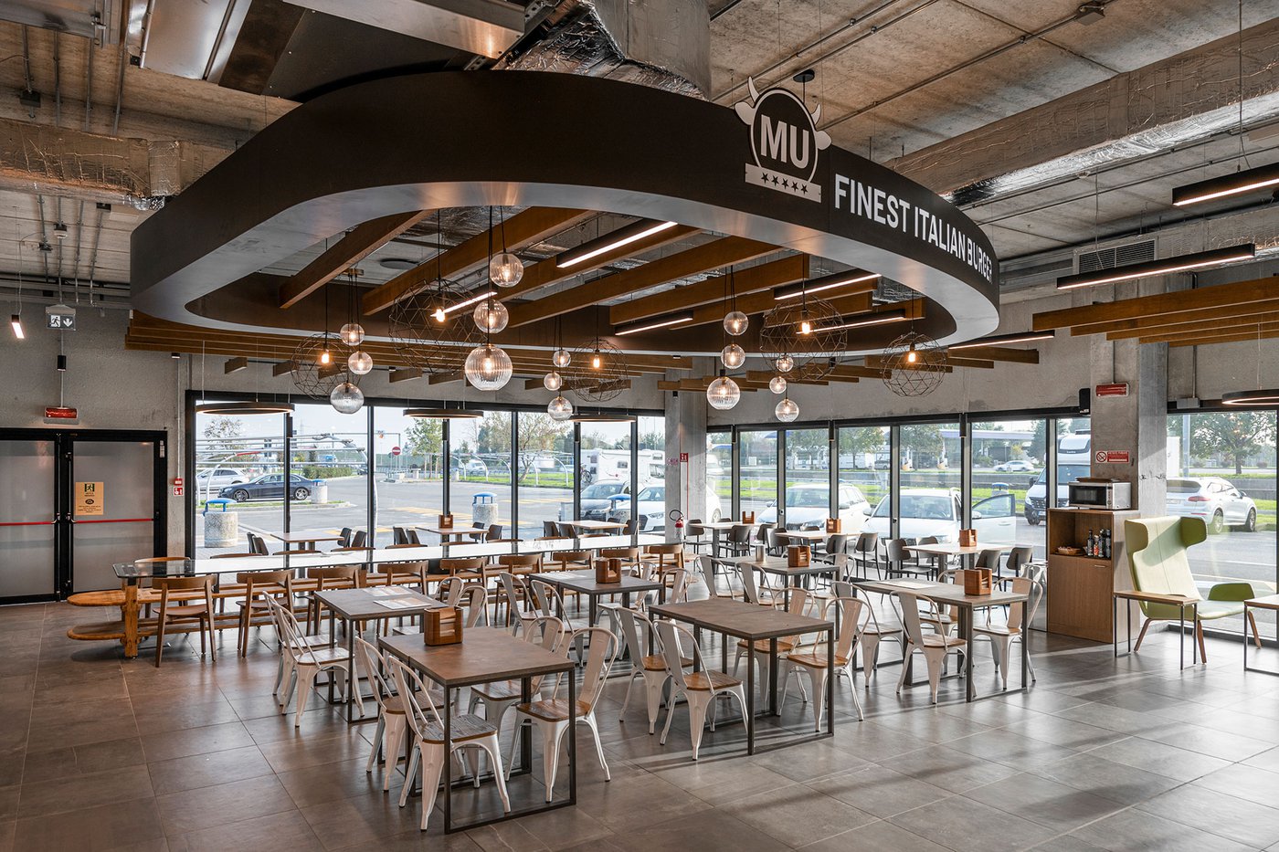 La celebre catena My Chef voleva donare un carattere moderno e hitech alla nuova area di servizio nei pressi di Lodi. Lo Studio Riboli ha dunque optato per un’infrastruttura esterna accattivante, dai volumi innovativi e dall’illuminazione multicolore. Gli oltre 400mq interni sono invece stati concepiti come un arioso open space, caratterizzato da un arredamento minimale e dai pavimenti in gres Marca Corona.