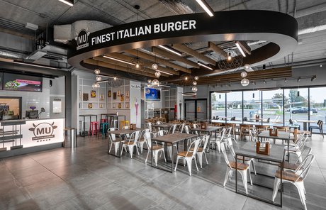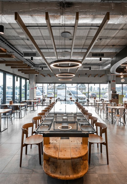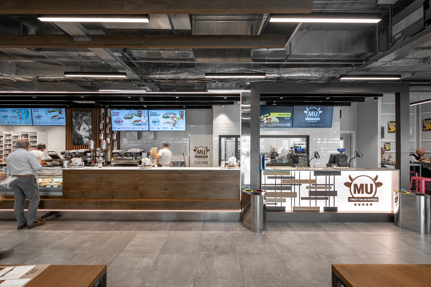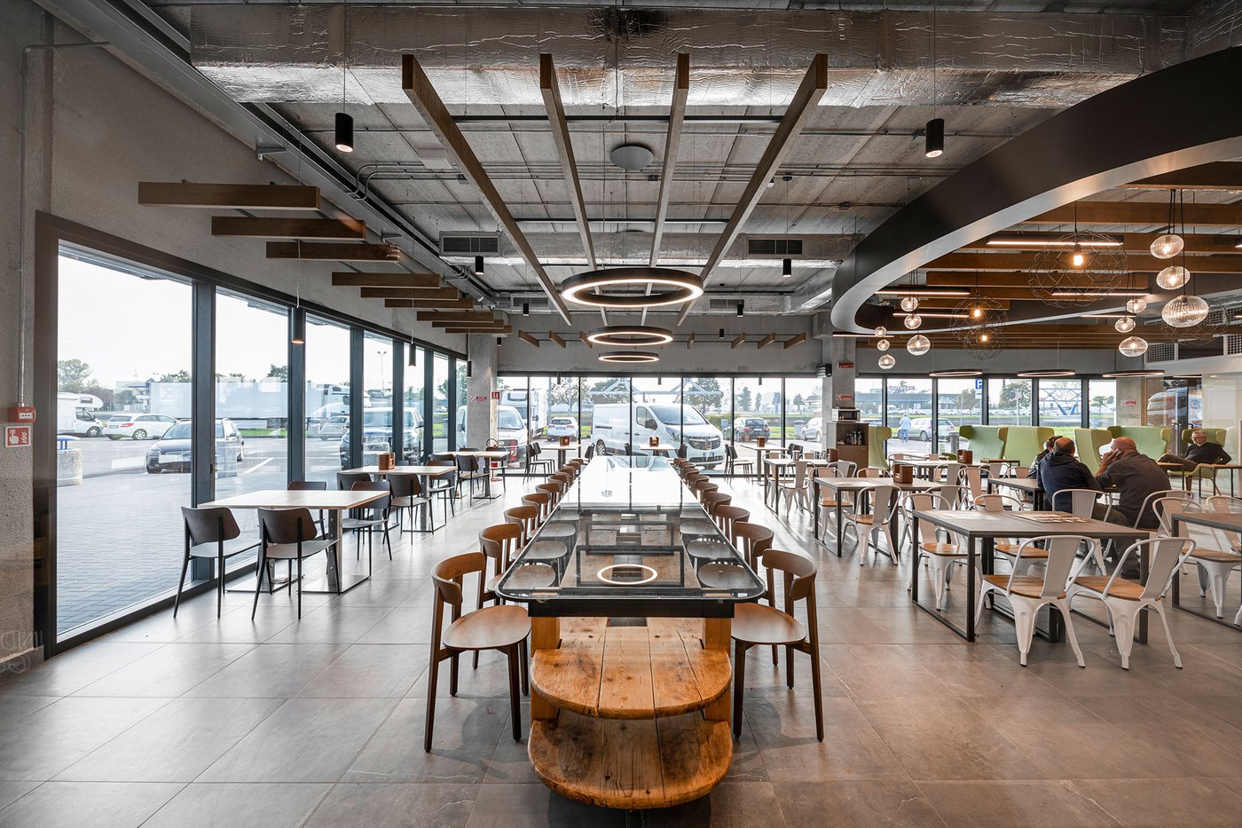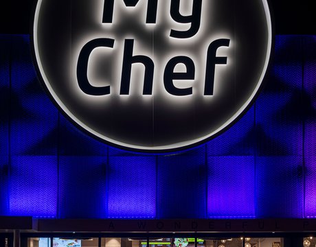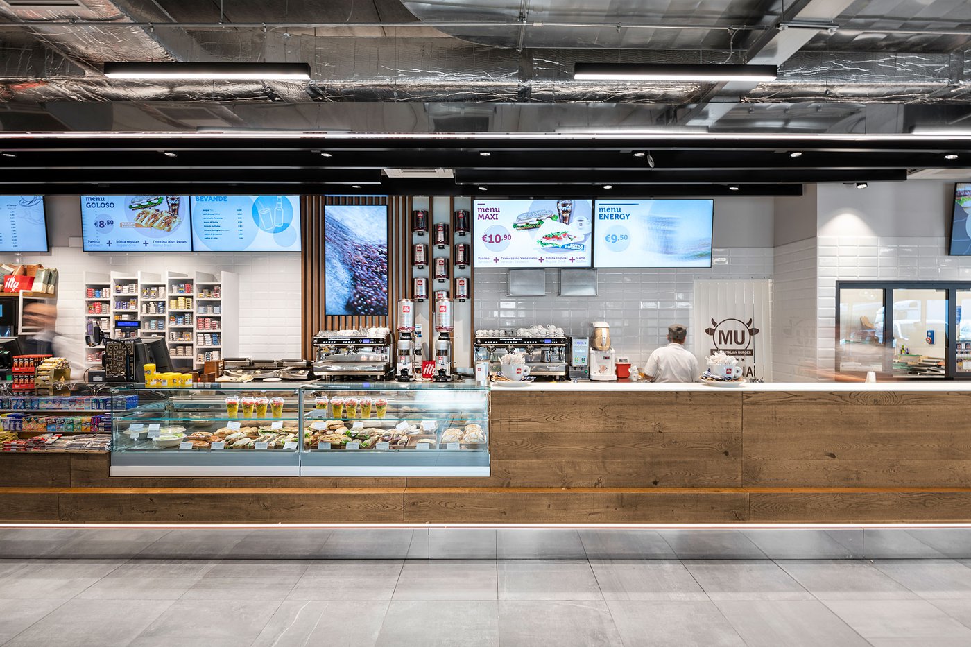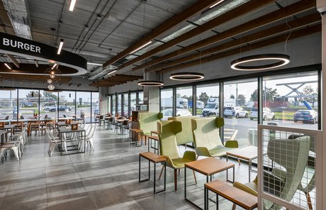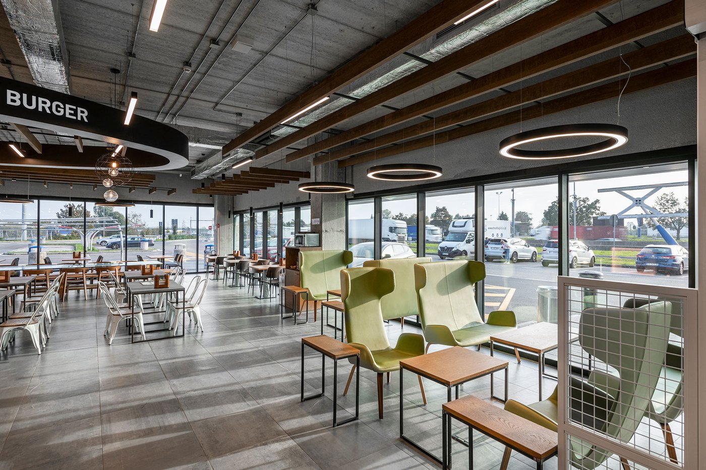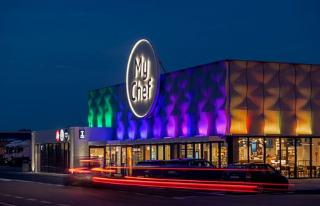 La celebre catena My Chef voleva donare un carattere moderno e hitech alla nuova area di servizio nei pressi di Lodi. Lo Studio Riboli ha dunque optato per un’infrastruttura esterna accattivante, dai volumi innovativi e dall’illuminazione multicolore. Gli oltre 400mq interni sono invece stati concepiti come un arioso open space, caratterizzato da un arredamento minimale e dai pavimenti in gres Marca Corona.