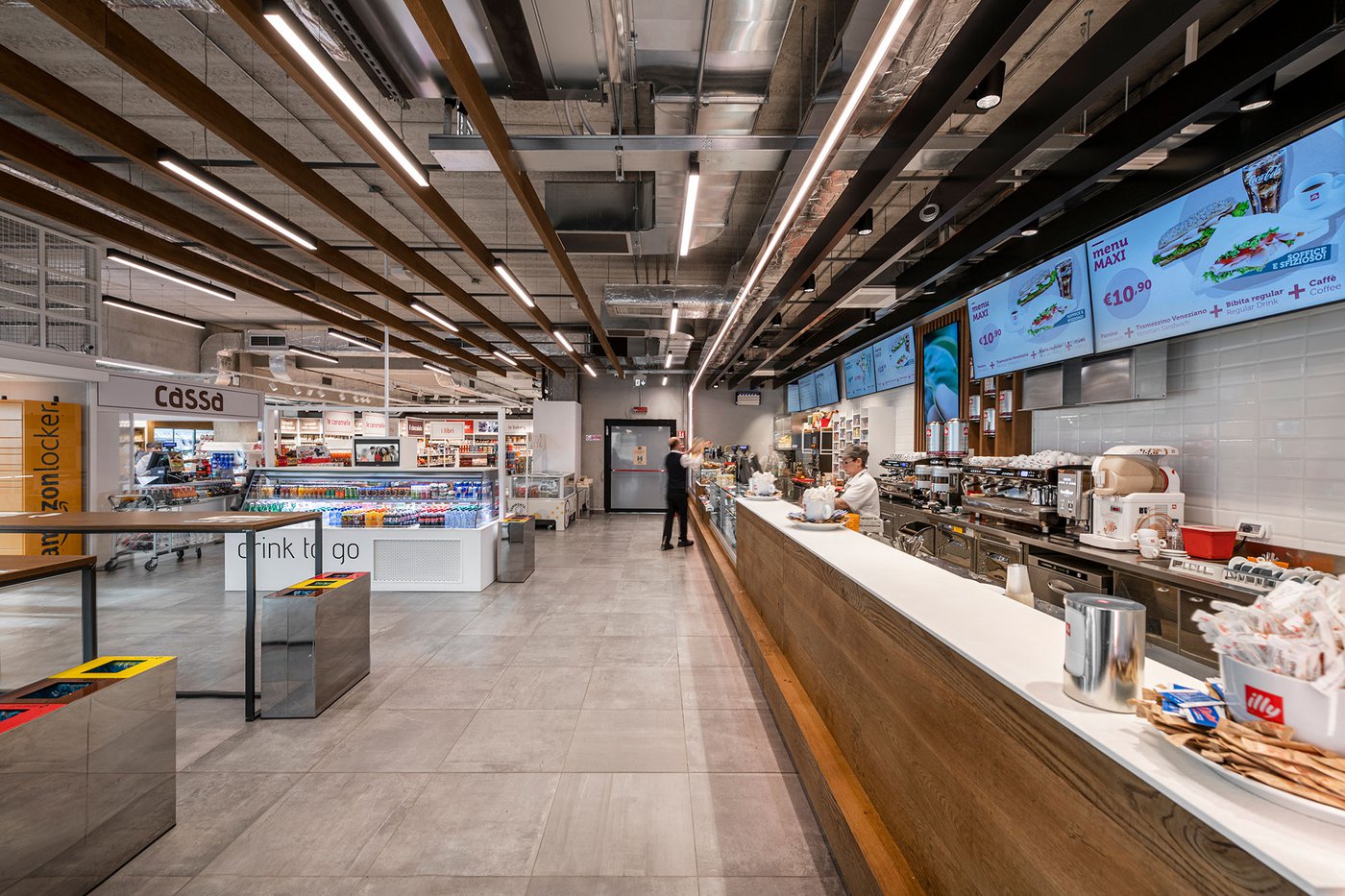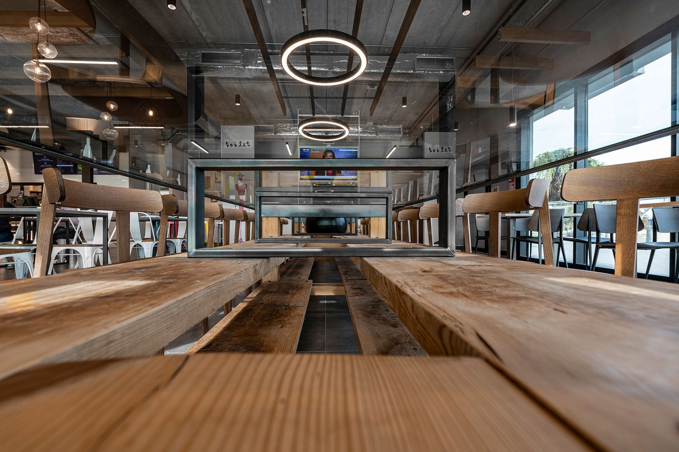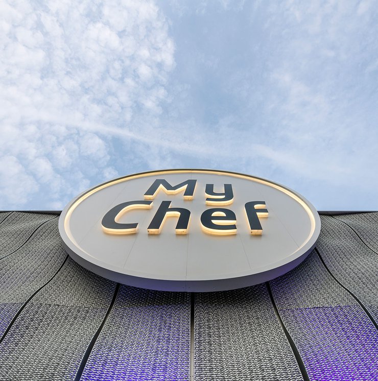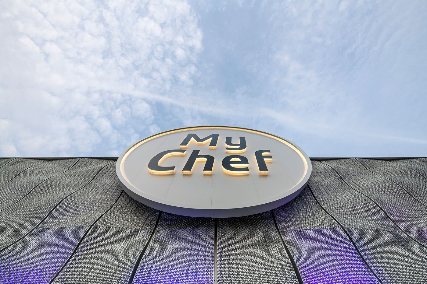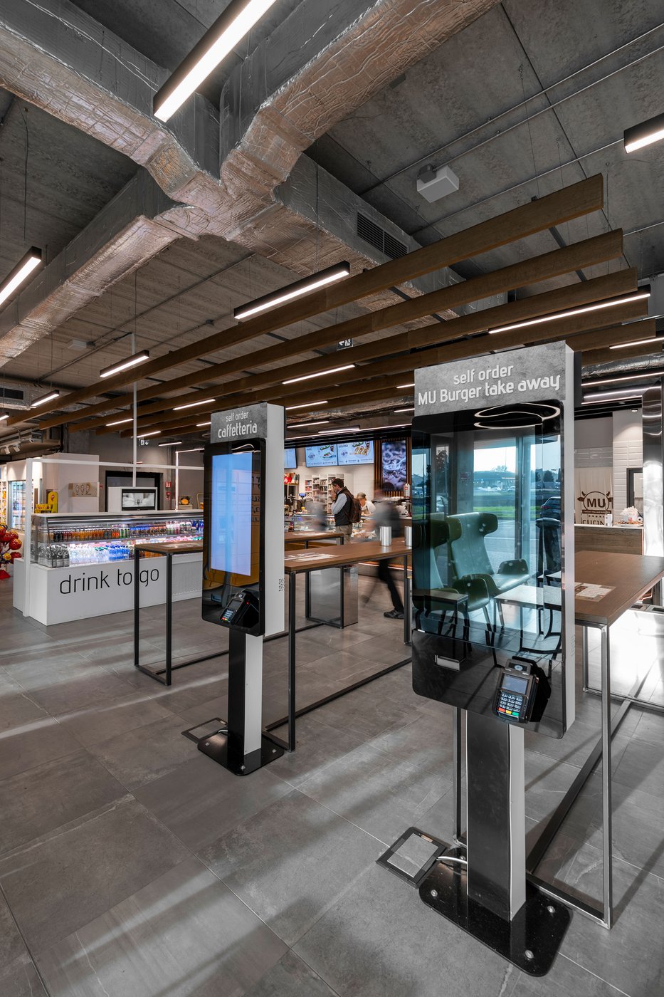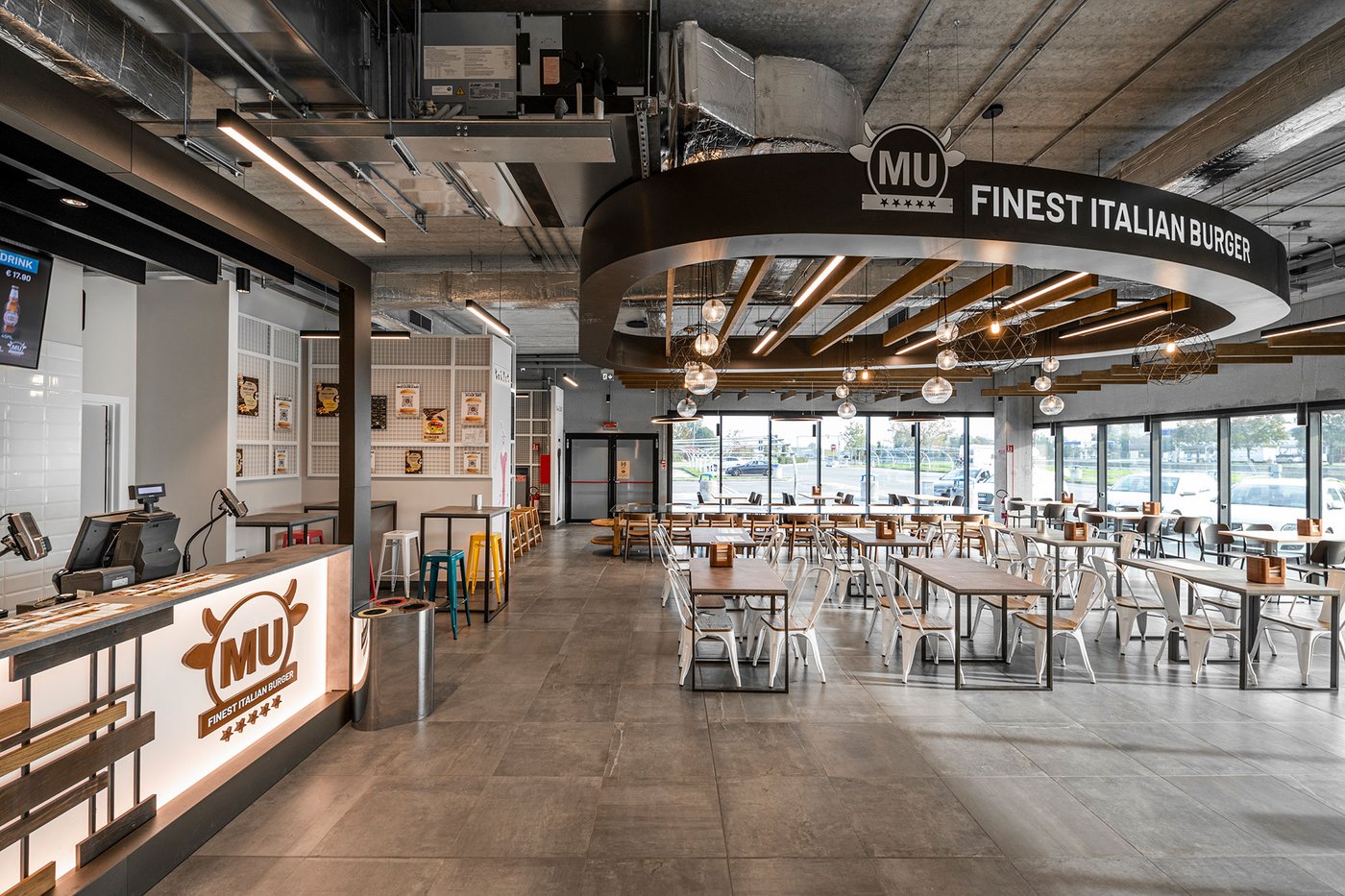 La celebre catena My Chef voleva donare un carattere moderno e hitech alla nuova area di servizio nei pressi di Lodi. Lo Studio Riboli ha dunque optato per un’infrastruttura esterna accattivante, dai volumi innovativi e dall’illuminazione multicolore. Gli oltre 400mq interni sono invece stati concepiti come un arioso open space, caratterizzato da un arredamento minimale e dai pavimenti in gres Marca Corona.