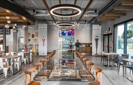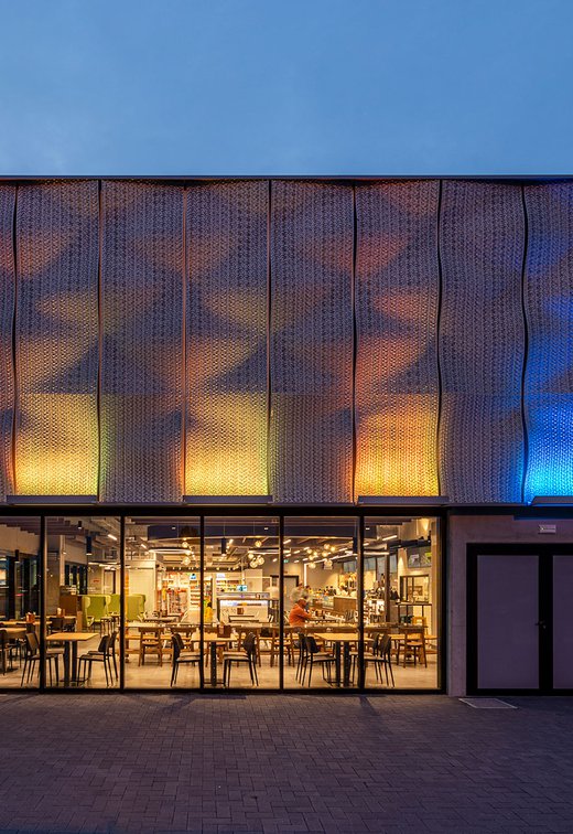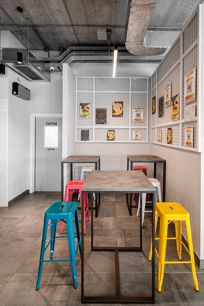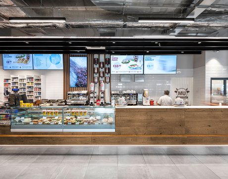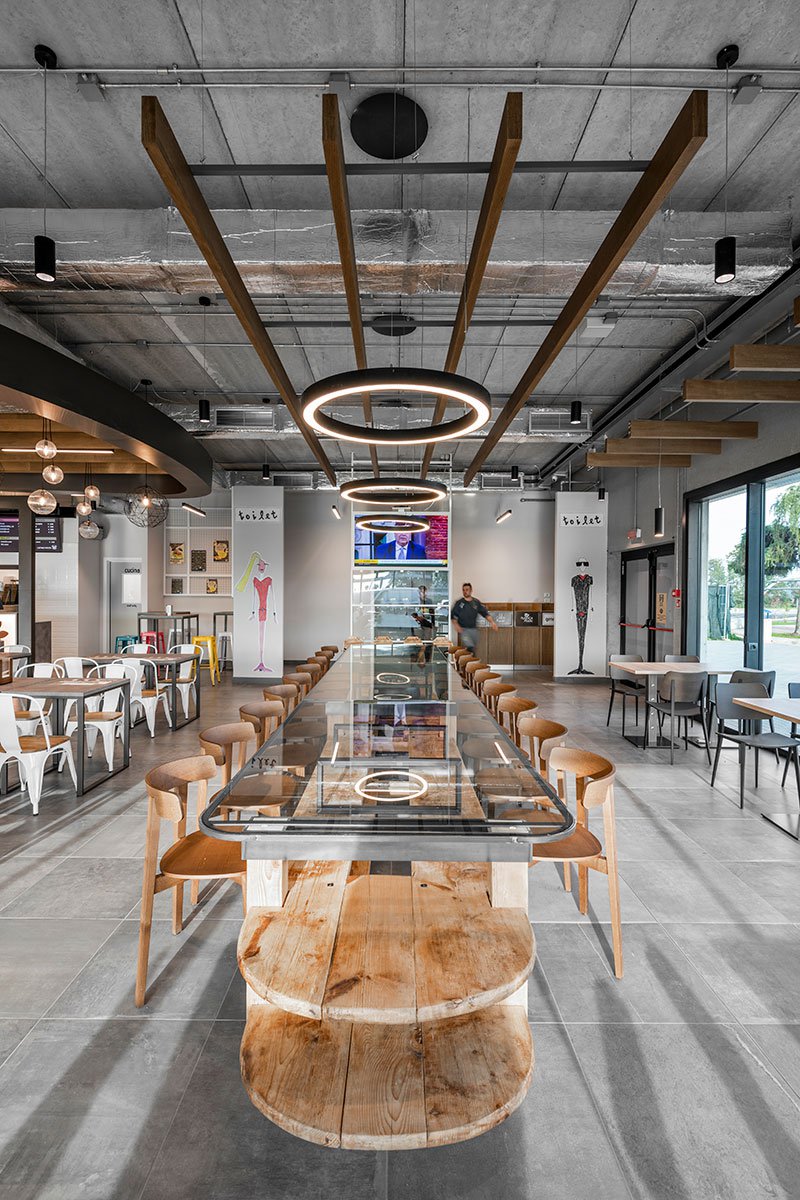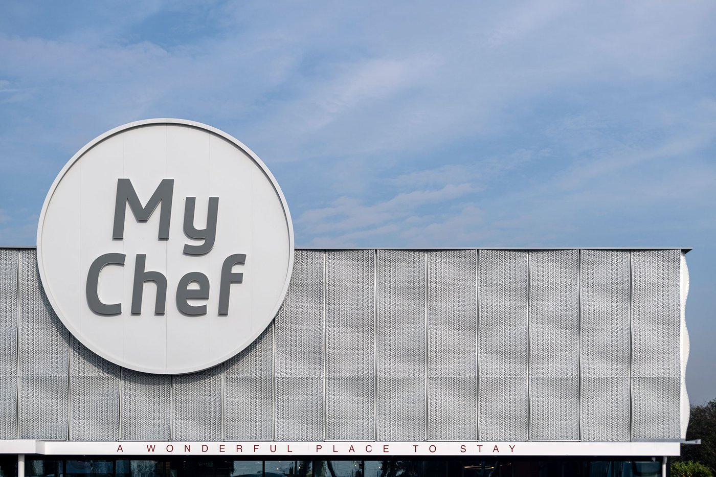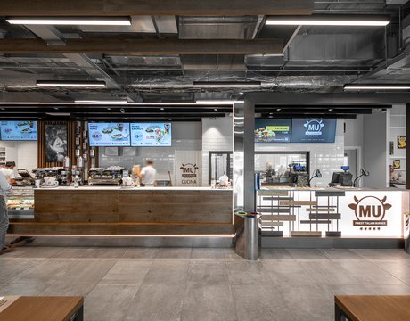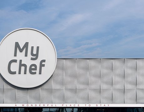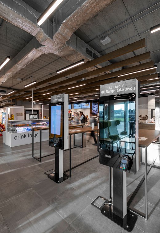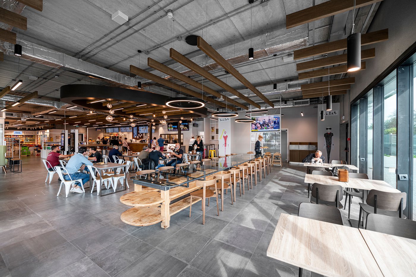 La celebre catena My Chef voleva donare un carattere moderno e hitech alla nuova area di servizio nei pressi di Lodi. Lo Studio Riboli ha dunque optato per un’infrastruttura esterna accattivante, dai volumi innovativi e dall’illuminazione multicolore. Gli oltre 400mq interni sono invece stati concepiti come un arioso open space, caratterizzato da un arredamento minimale e dai pavimenti in gres Marca Corona.