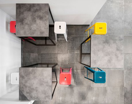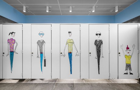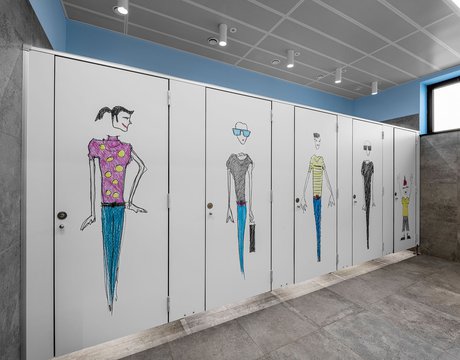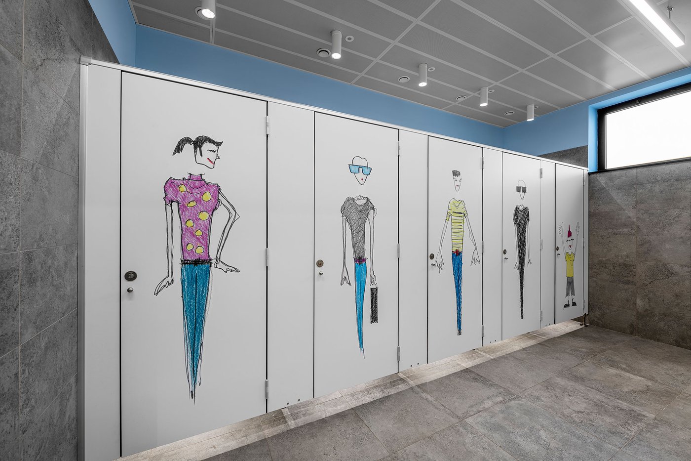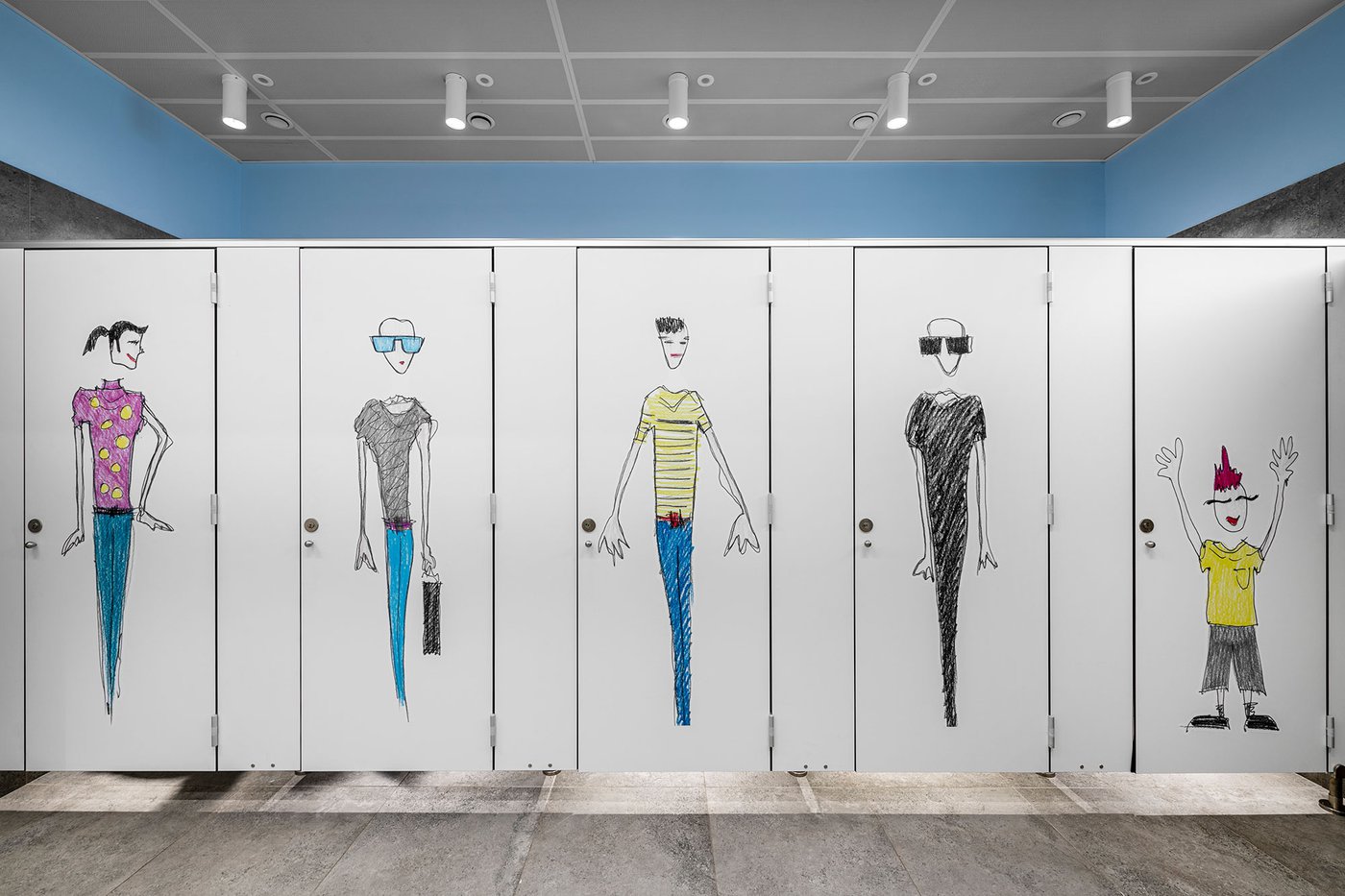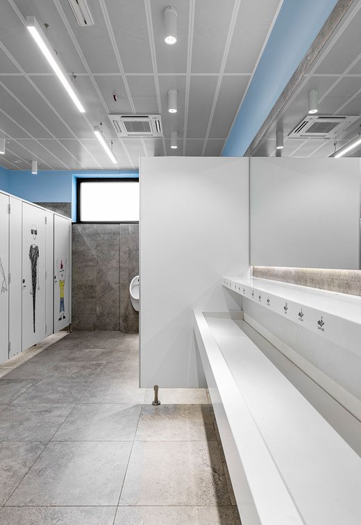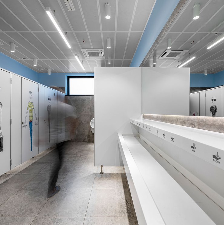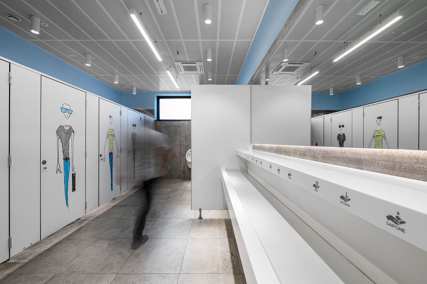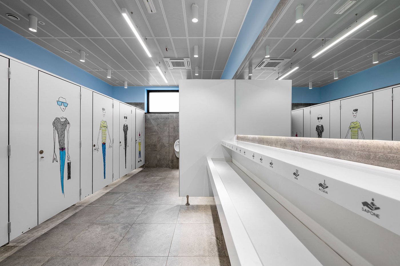 Nelle toilettes sono invece utilizzate le ceramiche Street sia a pavimento che rivestimento, sdrammatizzate da grafiche stilizzate e ironiche. La resistenza, l’igienicità e la facilità di pulizia del gres rendono StoneOne la collezione ideale per trasformare un’area di servizio in un luogo accogliente e sicuro, dove ricaricare le energie prima di ripartire!