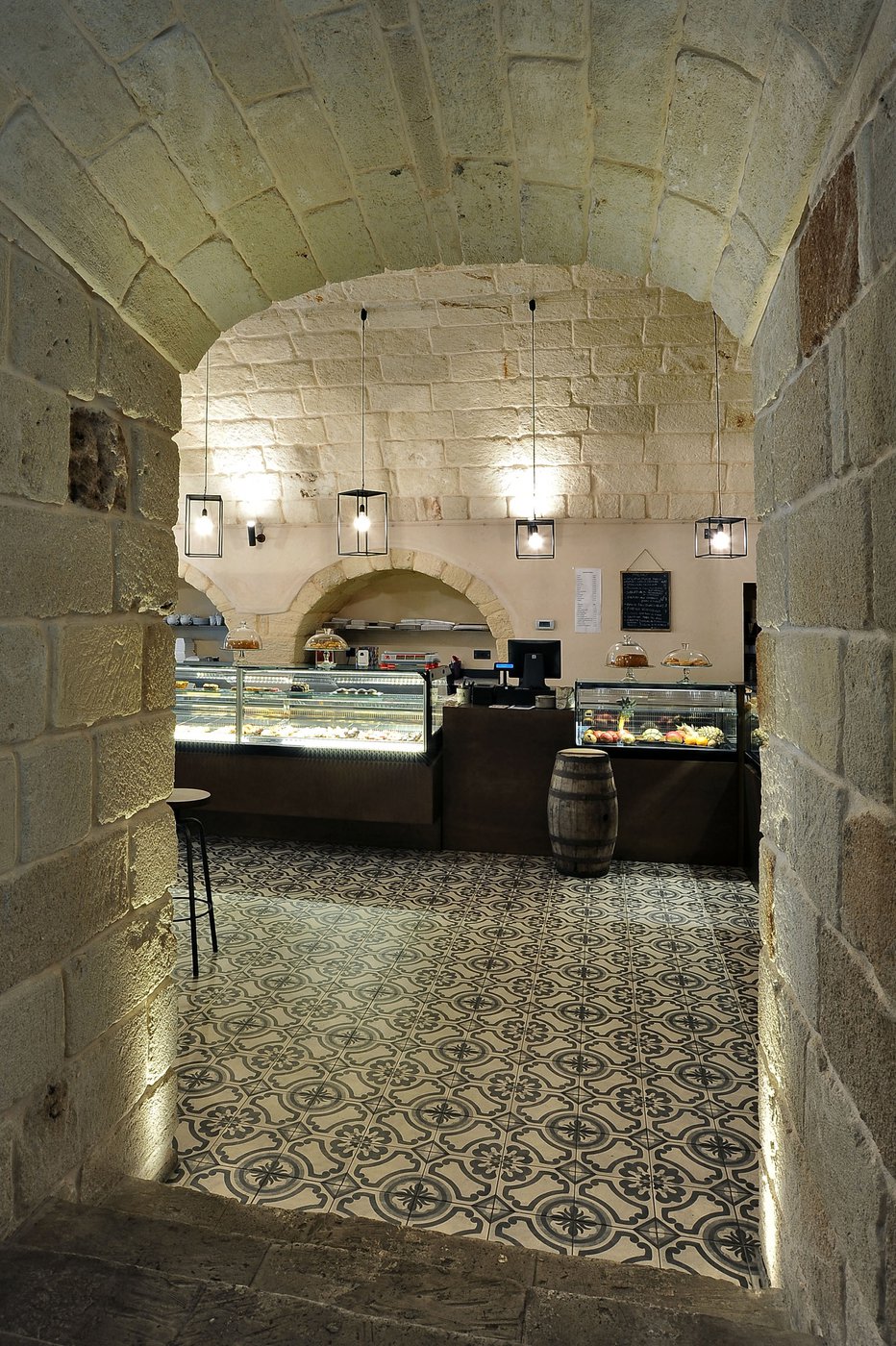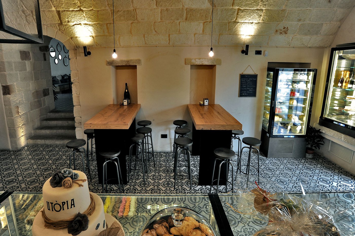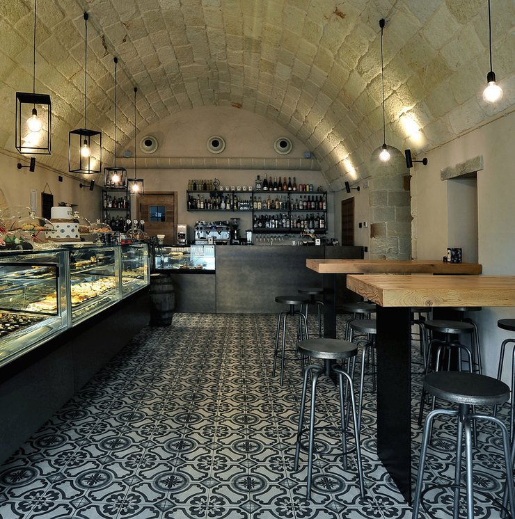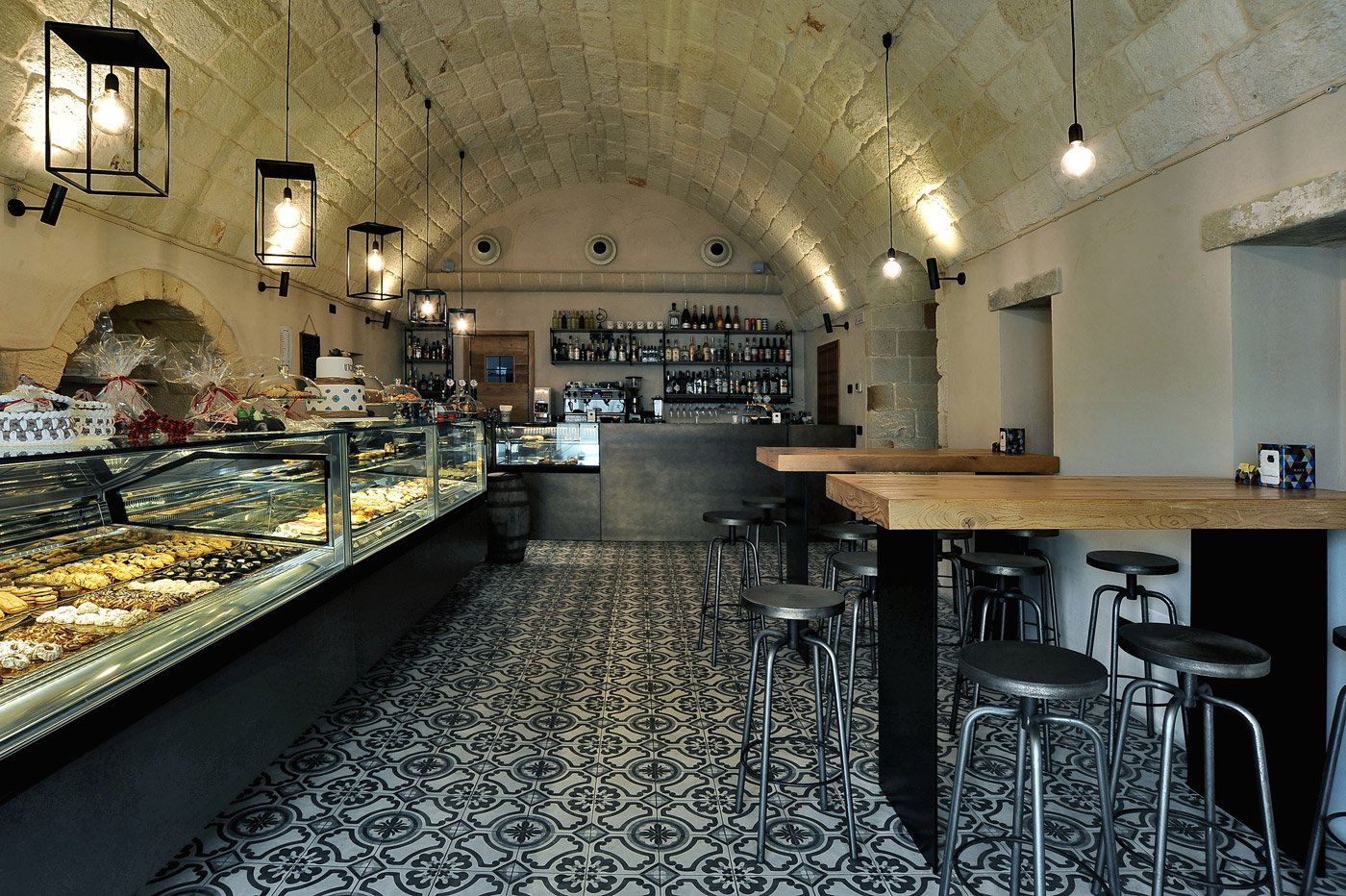 Il gres porcellanato effetto cotto di Terra è il protagonista indiscusso della Pasticceria Utopia, nei pressi di Lecce: le cementine quadrate ed esagonali impreziosiscono infatti tutti gli spazi interni del locale, donando loro un tocco elegante e moderno. All’ingresso e nella zona bancone l’elaborato decoro Giglio è posato a pavimento per valorizzare gli storici muri a faccia vista.