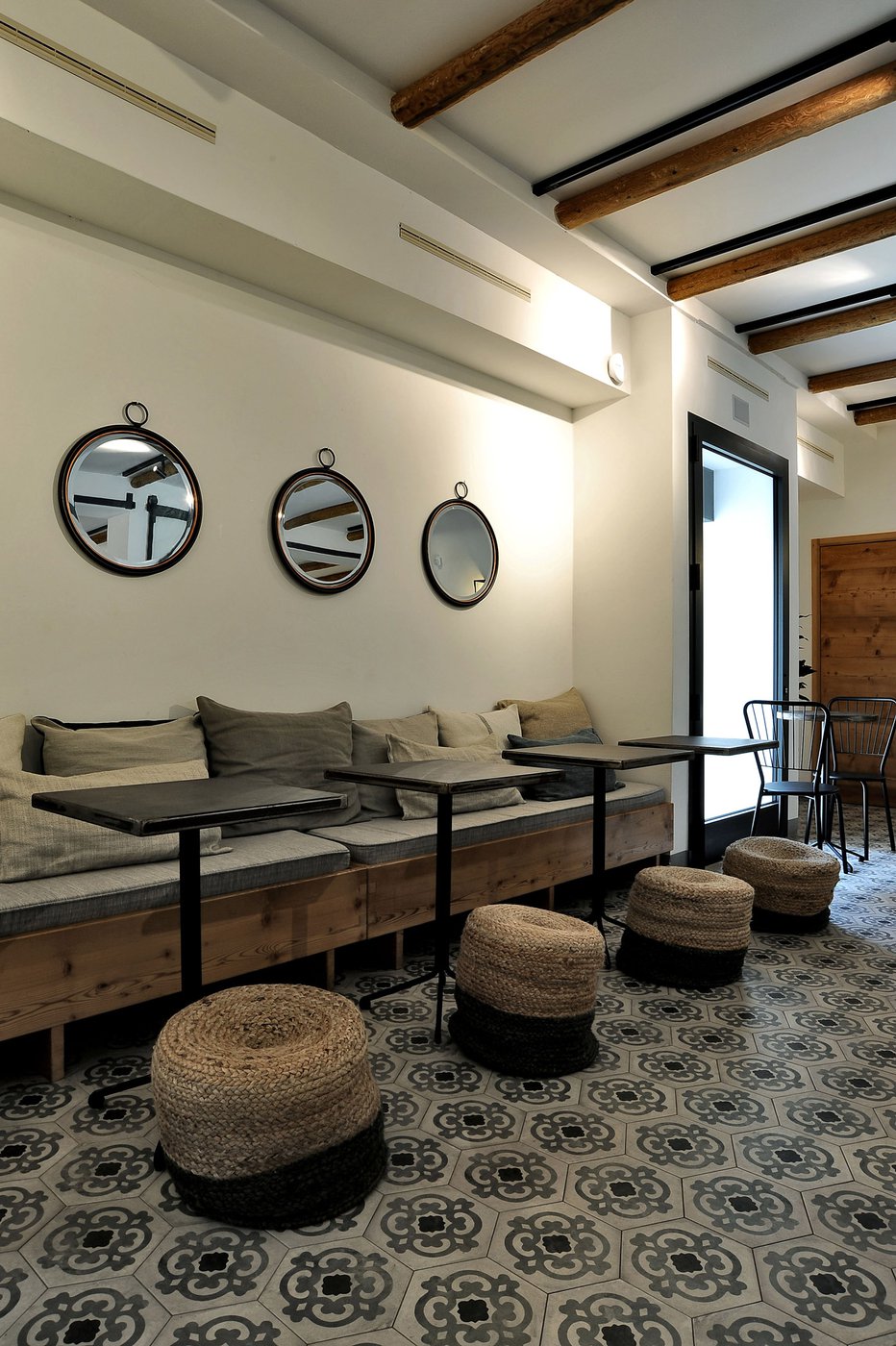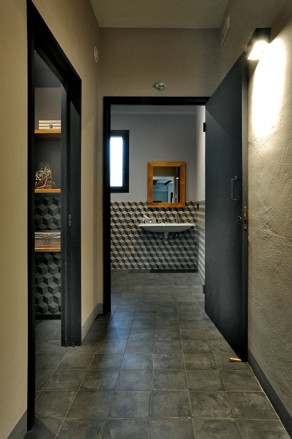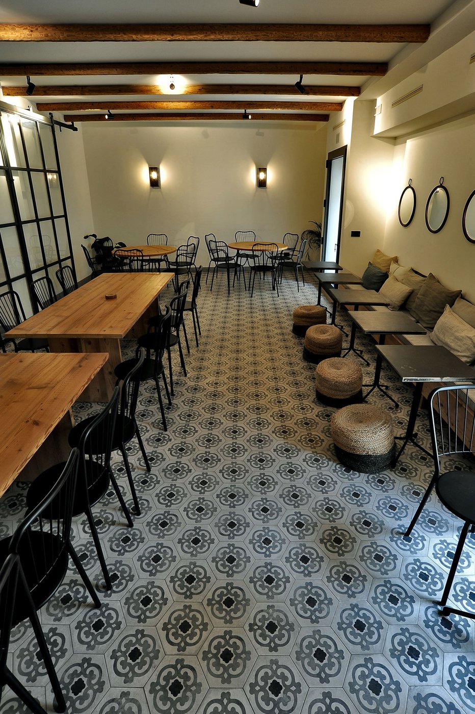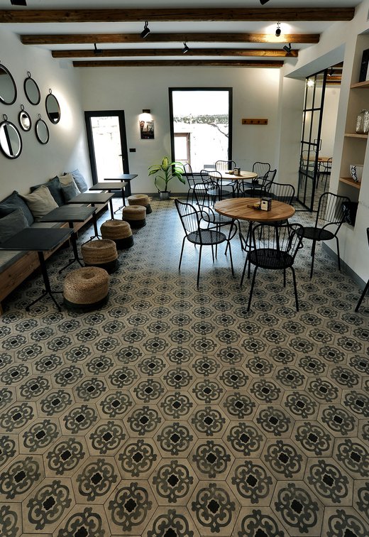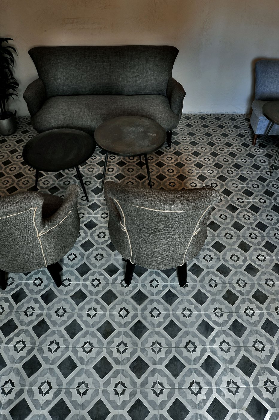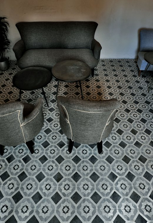 Le sale interne presentano invece uno stile più ricercato e retrò, accostando arredi design e sedute avvolgenti ai tappeti ceramici dai motivi Fiore e Geometria. Nelle sale da bagno, si ritrova infine una combinazione più pacata, tra i fondi scuri e il pattern geometrico Cubo, proposto in questo caso a rivestimento