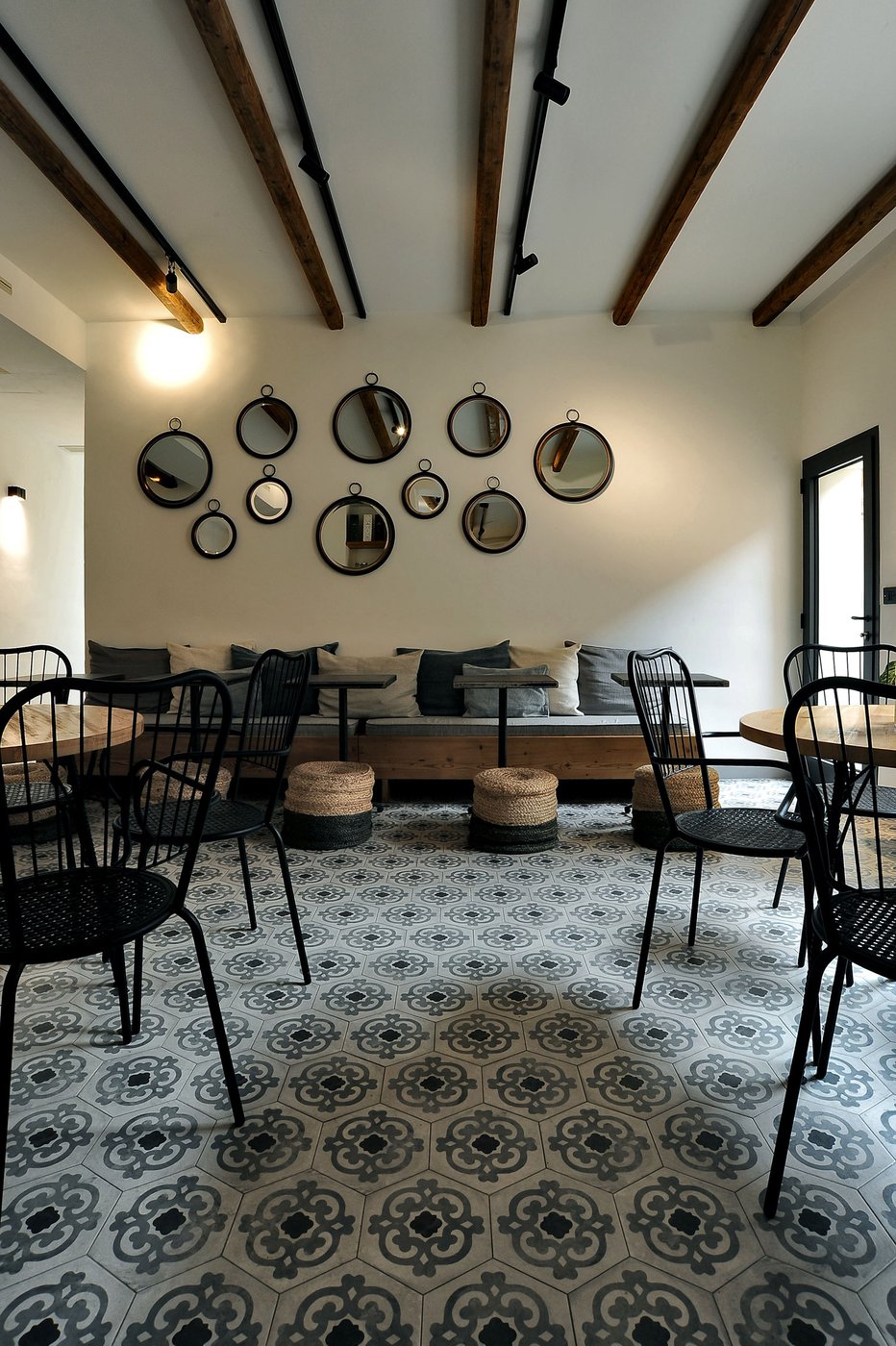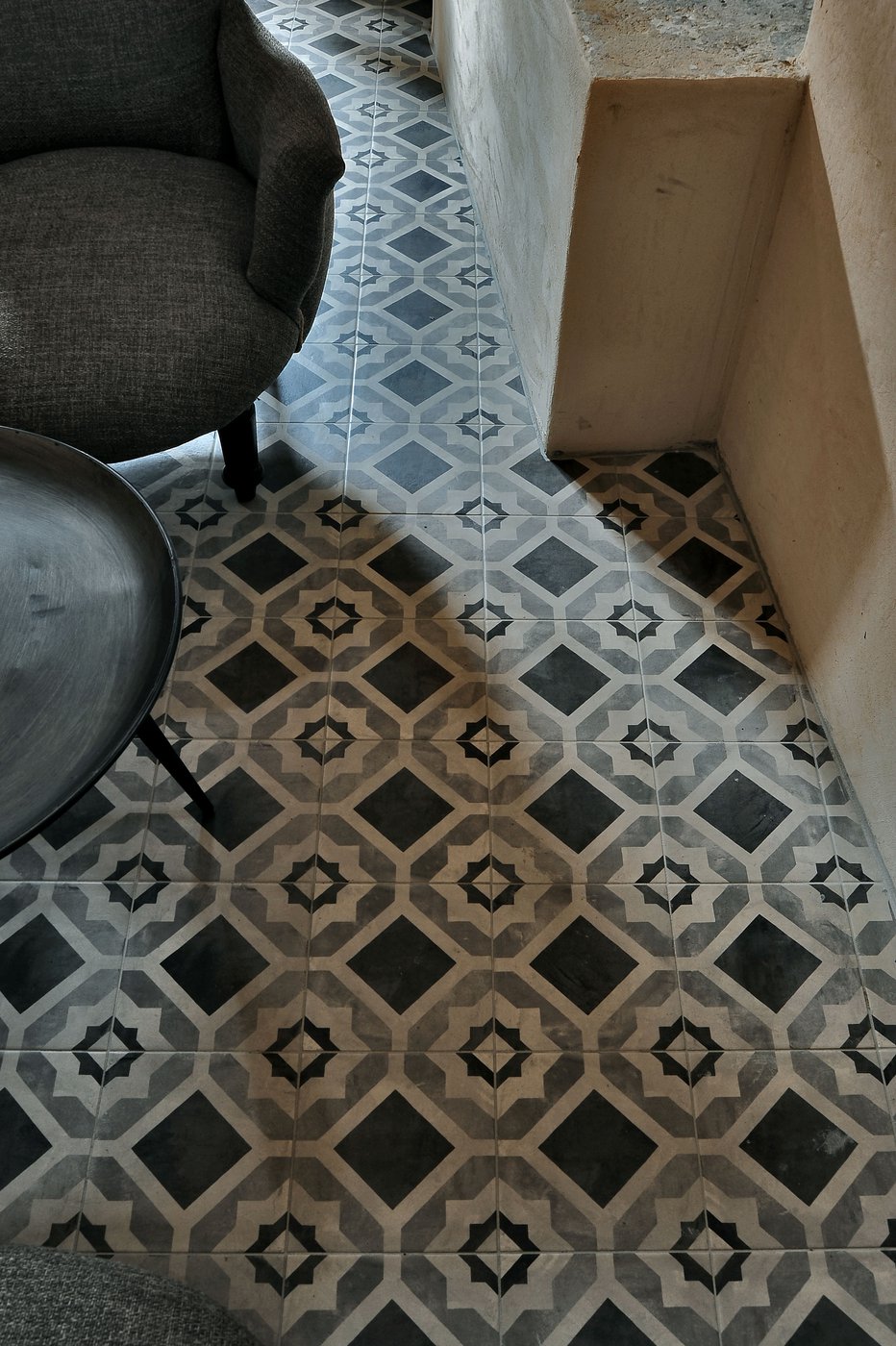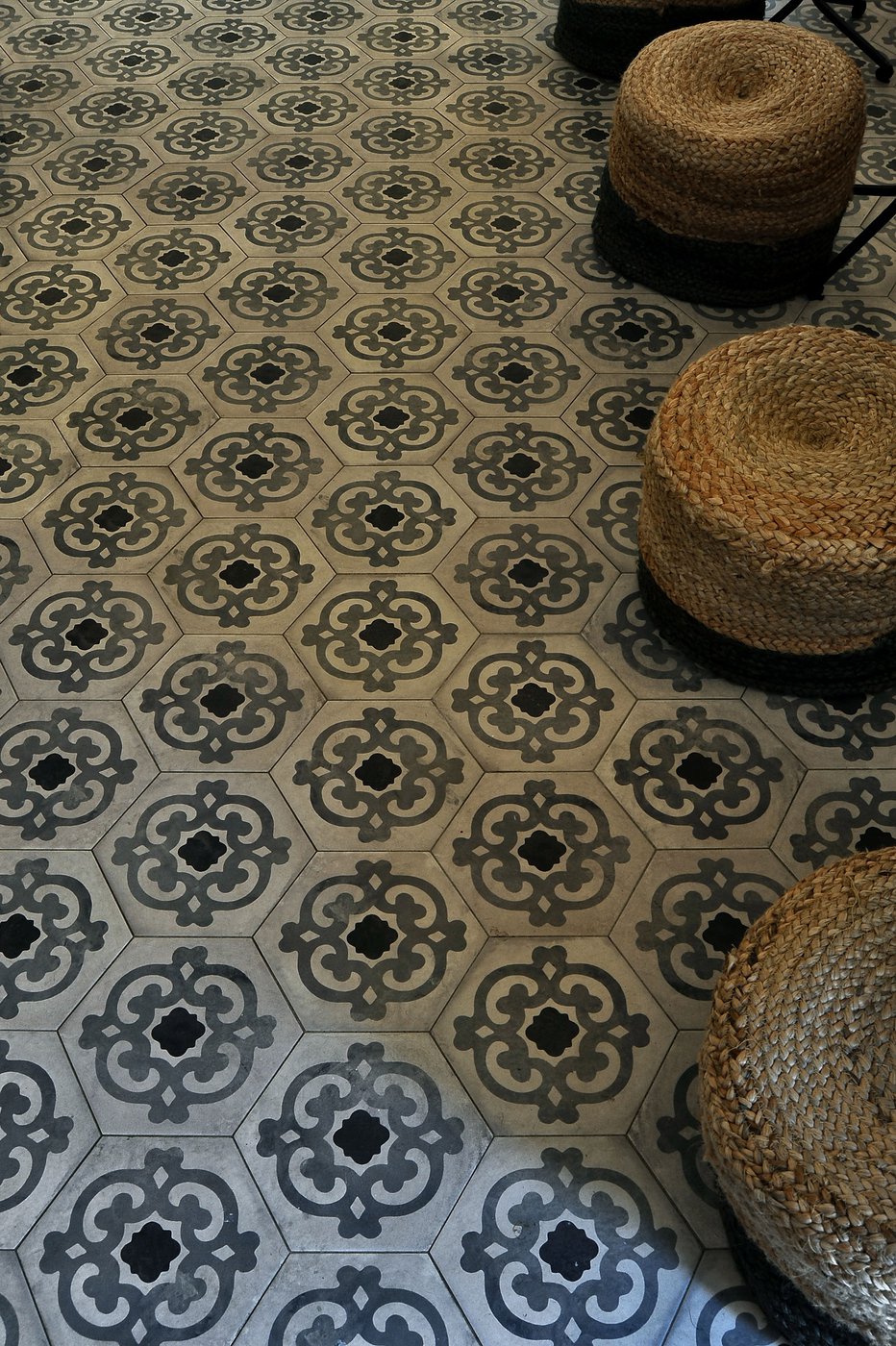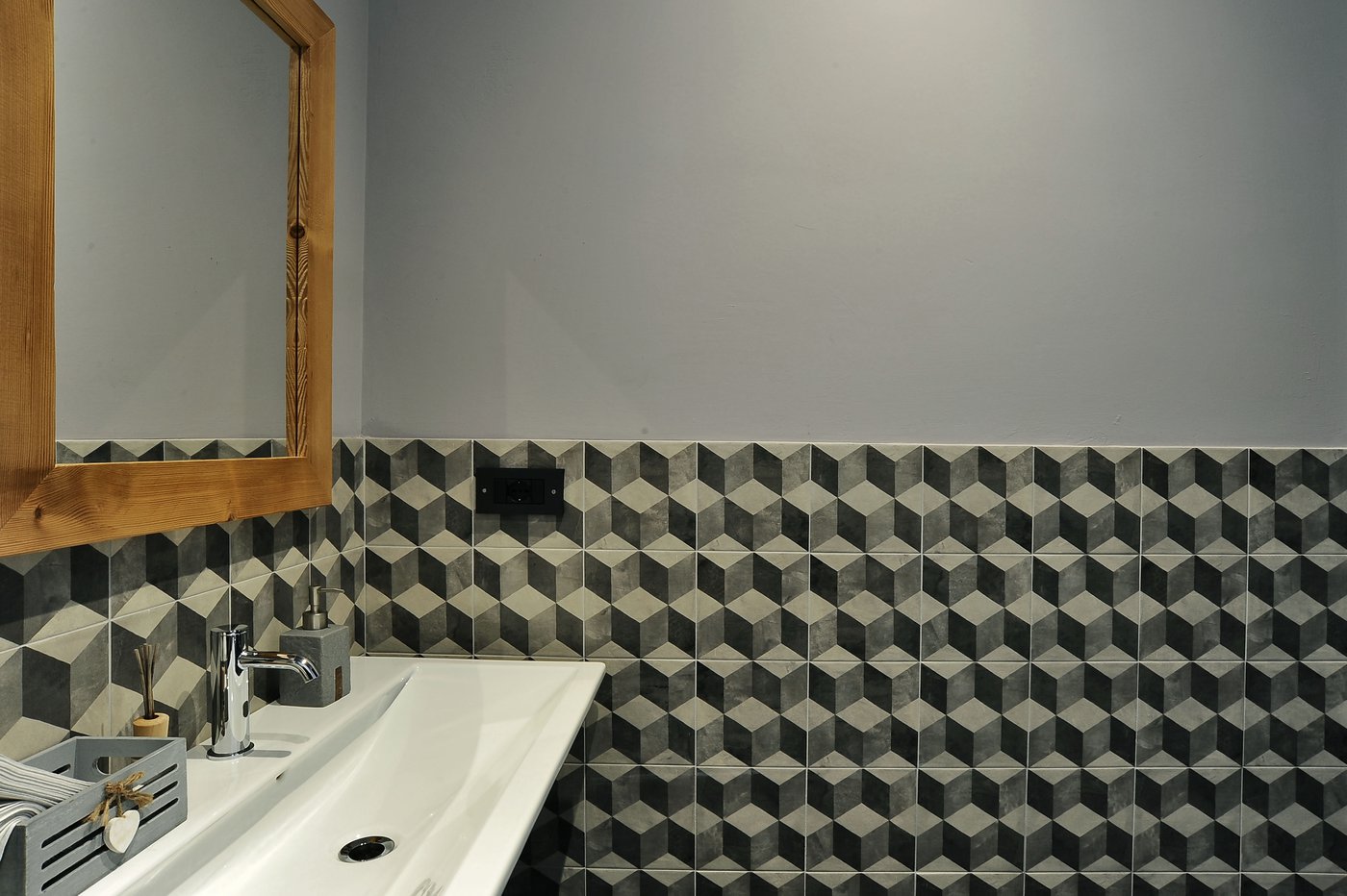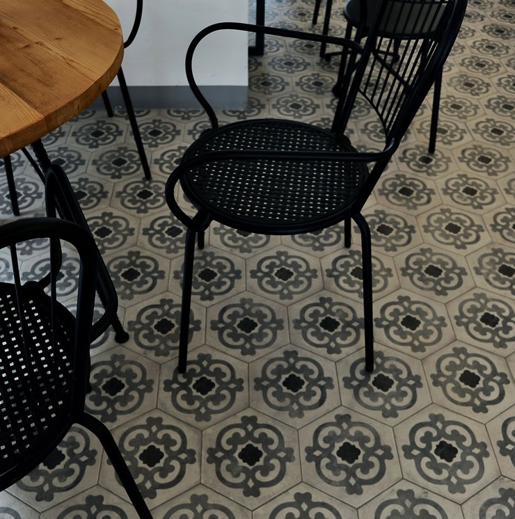 Le sale interne presentano invece uno stile più ricercato e retrò, accostando arredi design e sedute avvolgenti ai tappeti ceramici dai motivi Fiore e Geometria. Nelle sale da bagno, si ritrova infine una combinazione più pacata, tra i fondi scuri e il pattern geometrico Cubo, proposto in questo caso a rivestimento