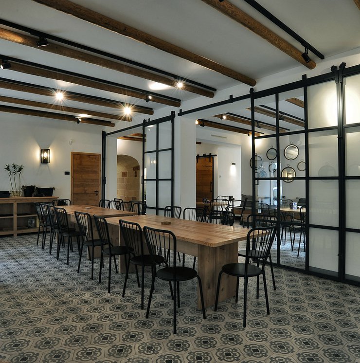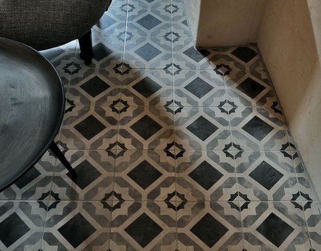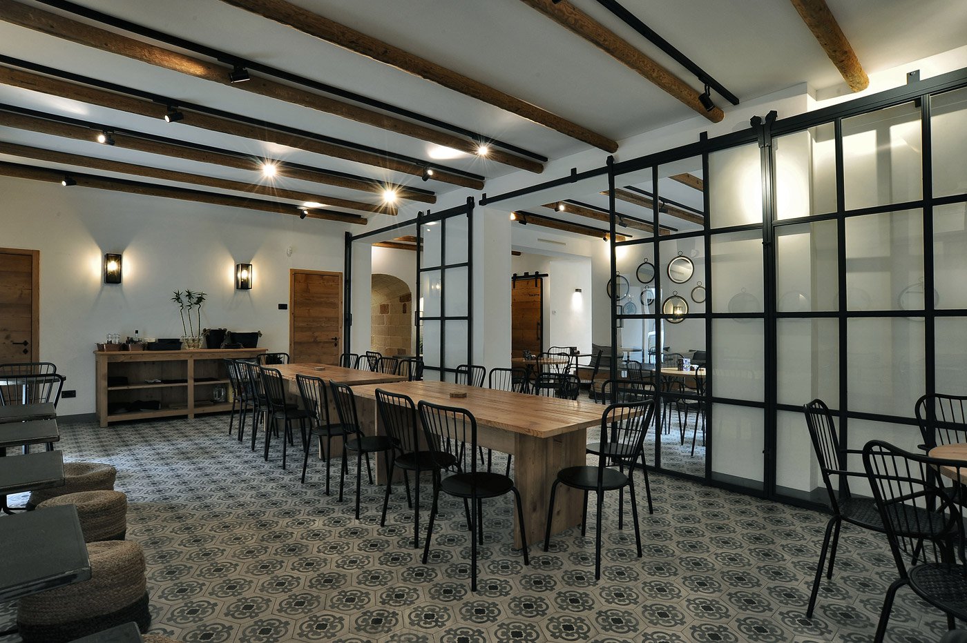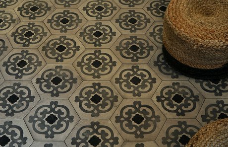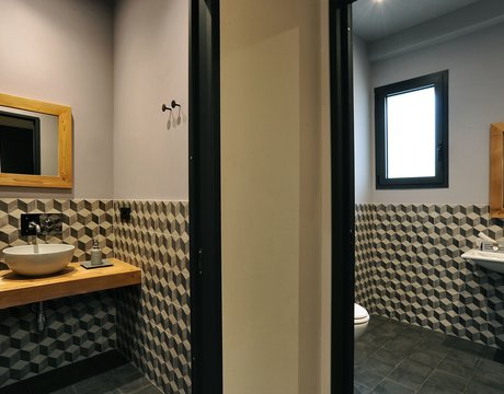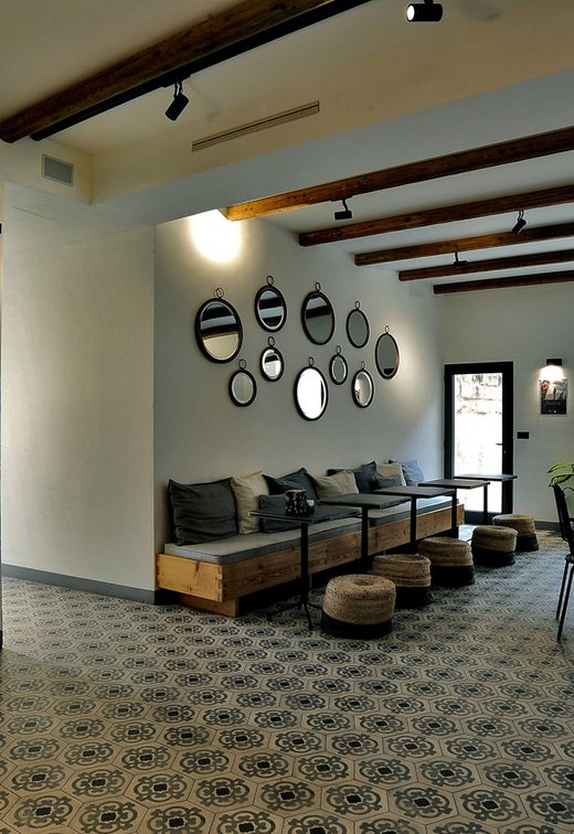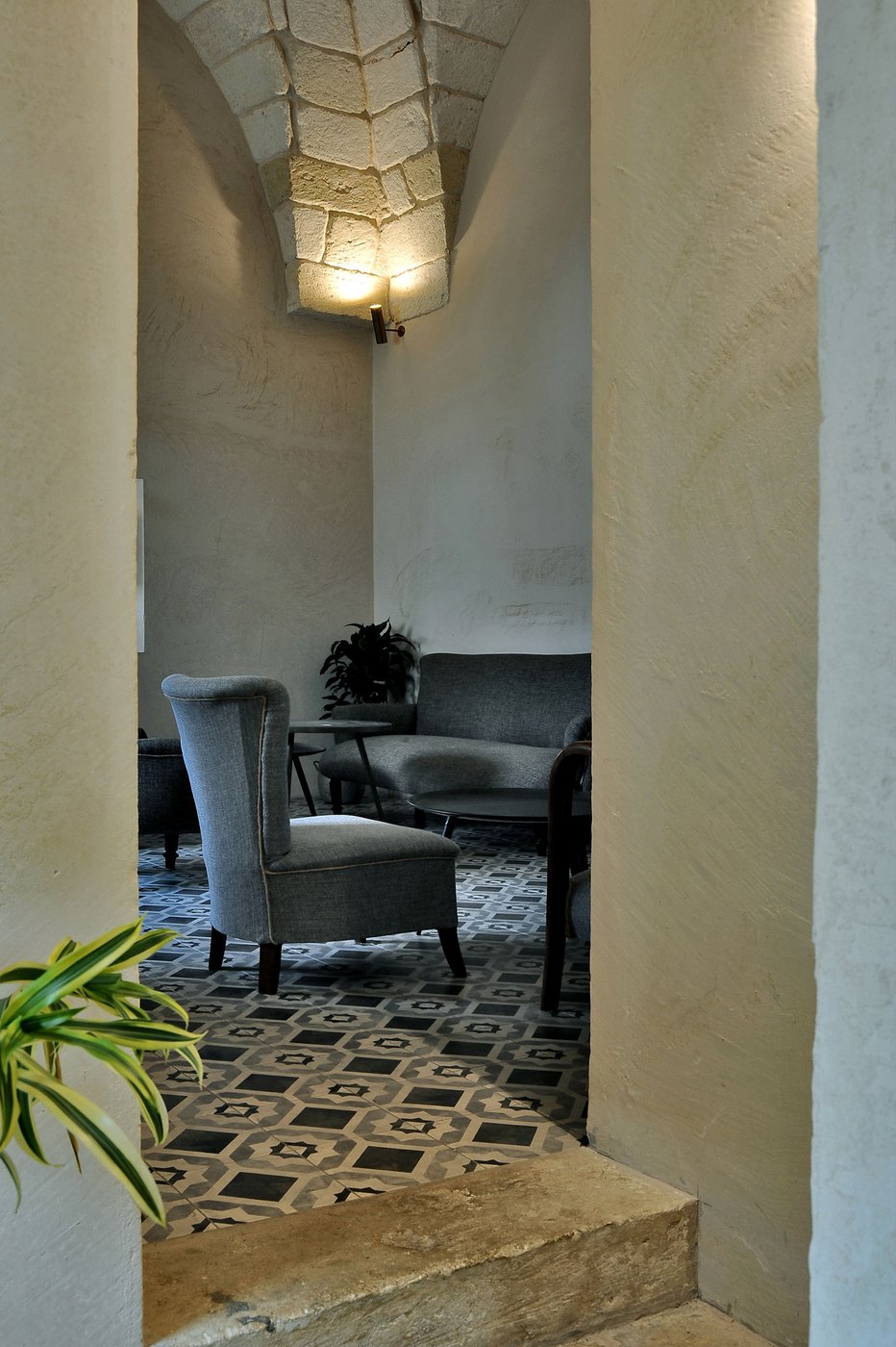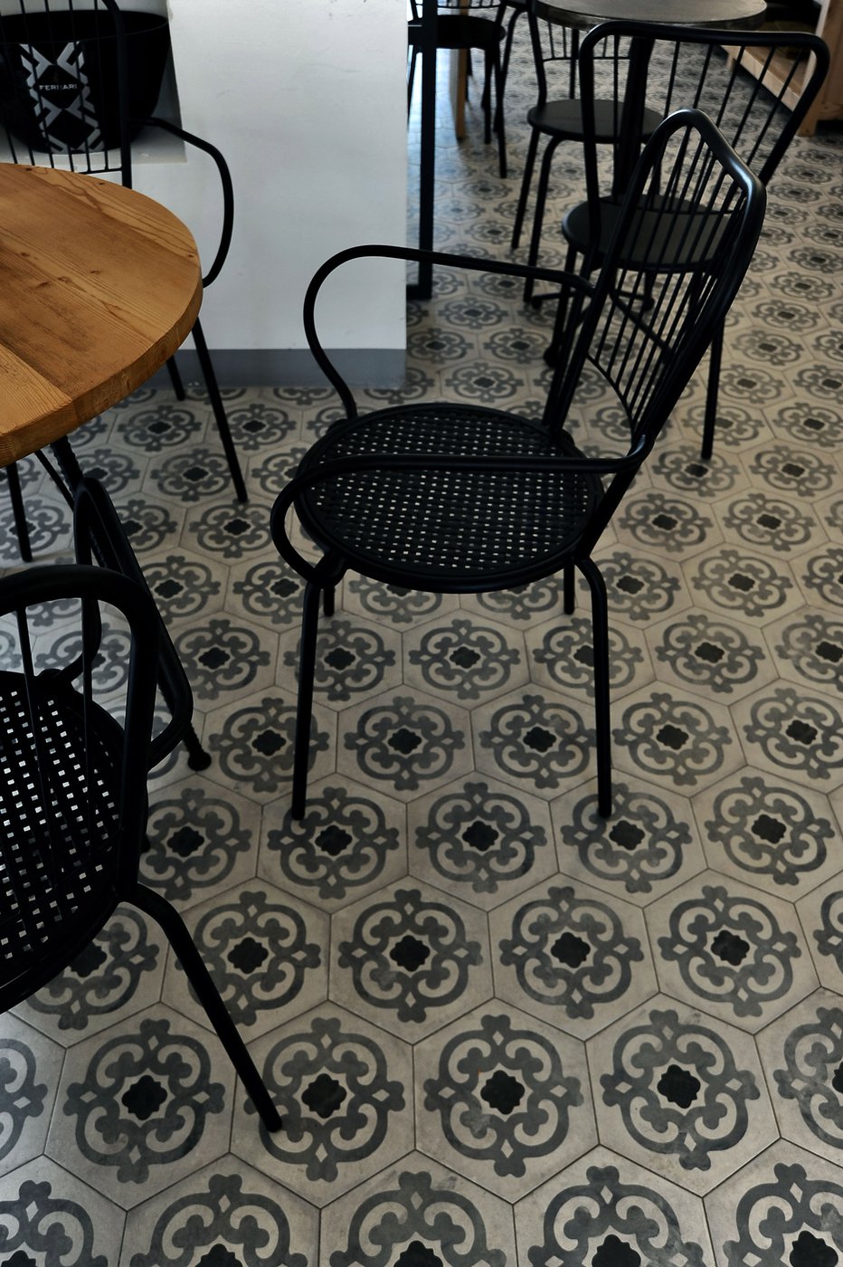 Le sale interne presentano invece uno stile più ricercato e retrò, accostando arredi design e sedute avvolgenti ai tappeti ceramici dai motivi Fiore e Geometria. Nelle sale da bagno, si ritrova infine una combinazione più pacata, tra i fondi scuri e il pattern geometrico Cubo, proposto in questo caso a rivestimento