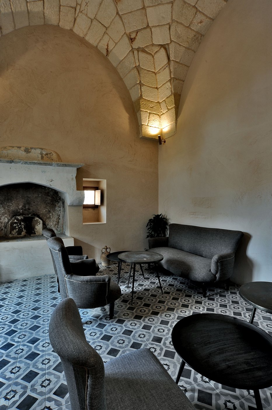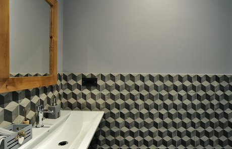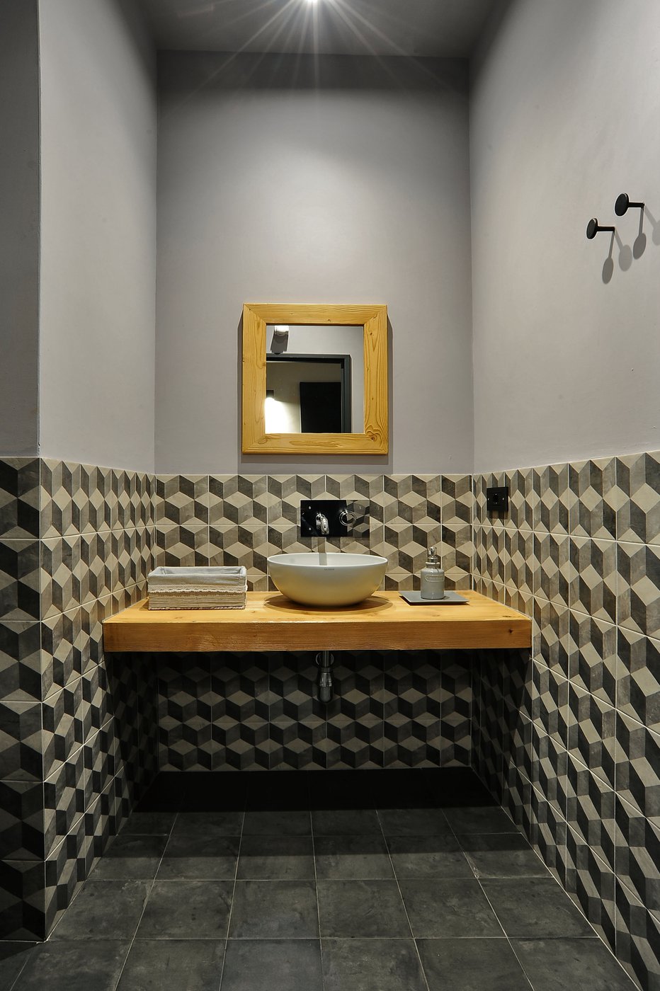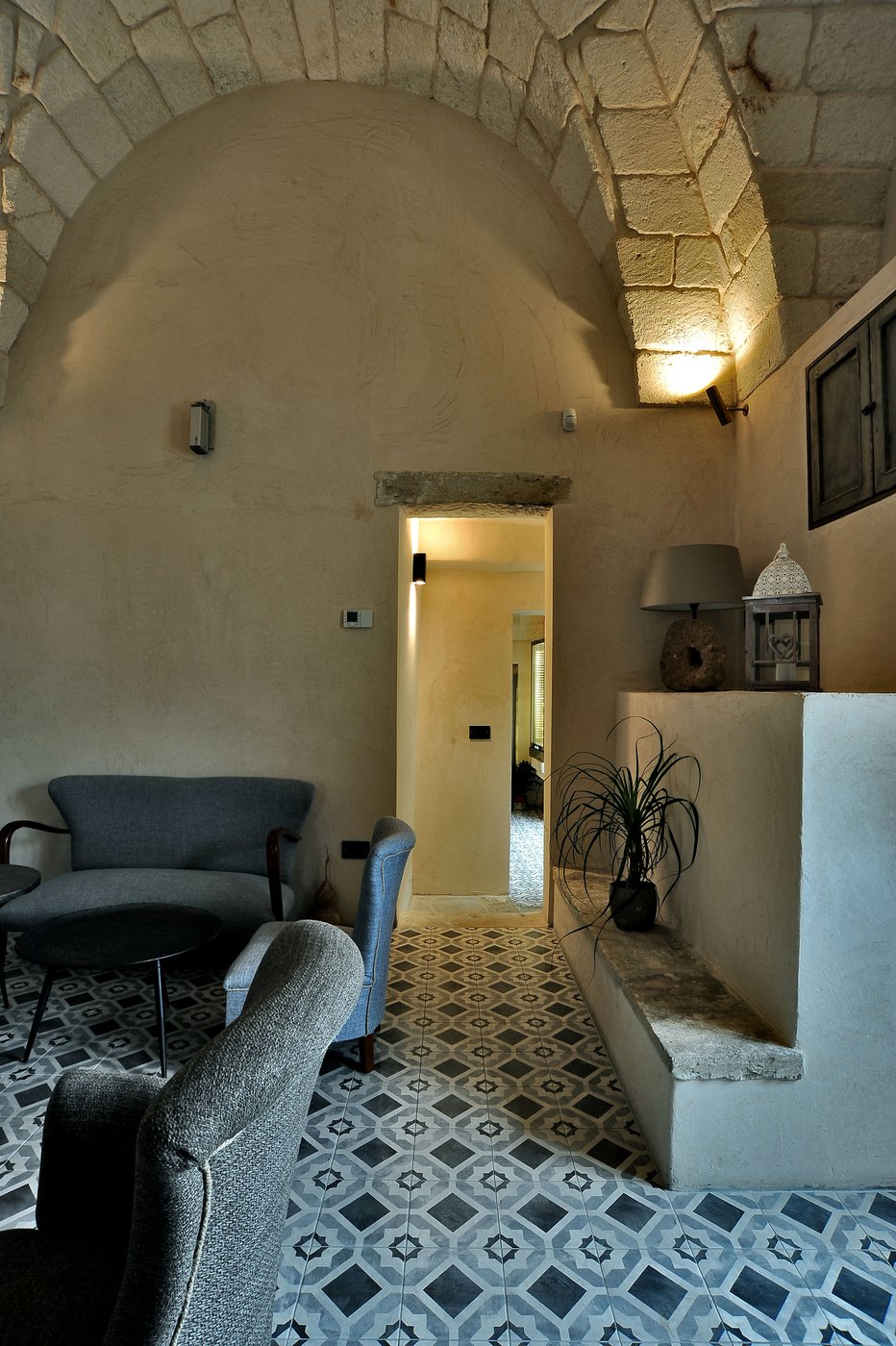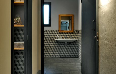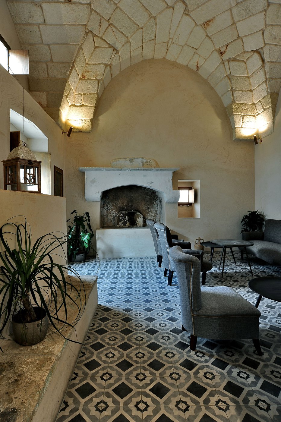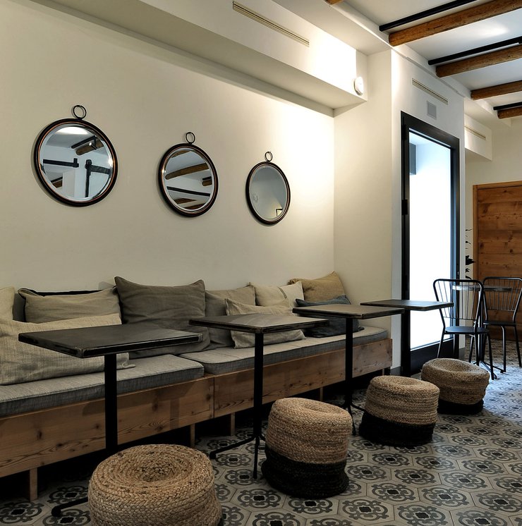 Le sale interne presentano invece uno stile più ricercato e retrò, accostando arredi design e sedute avvolgenti ai tappeti ceramici dai motivi Fiore e Geometria. Nelle sale da bagno, si ritrova infine una combinazione più pacata, tra i fondi scuri e il pattern geometrico Cubo, proposto in questo caso a rivestimento