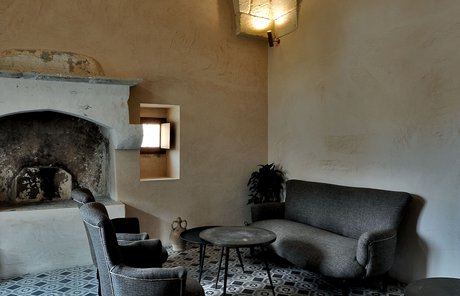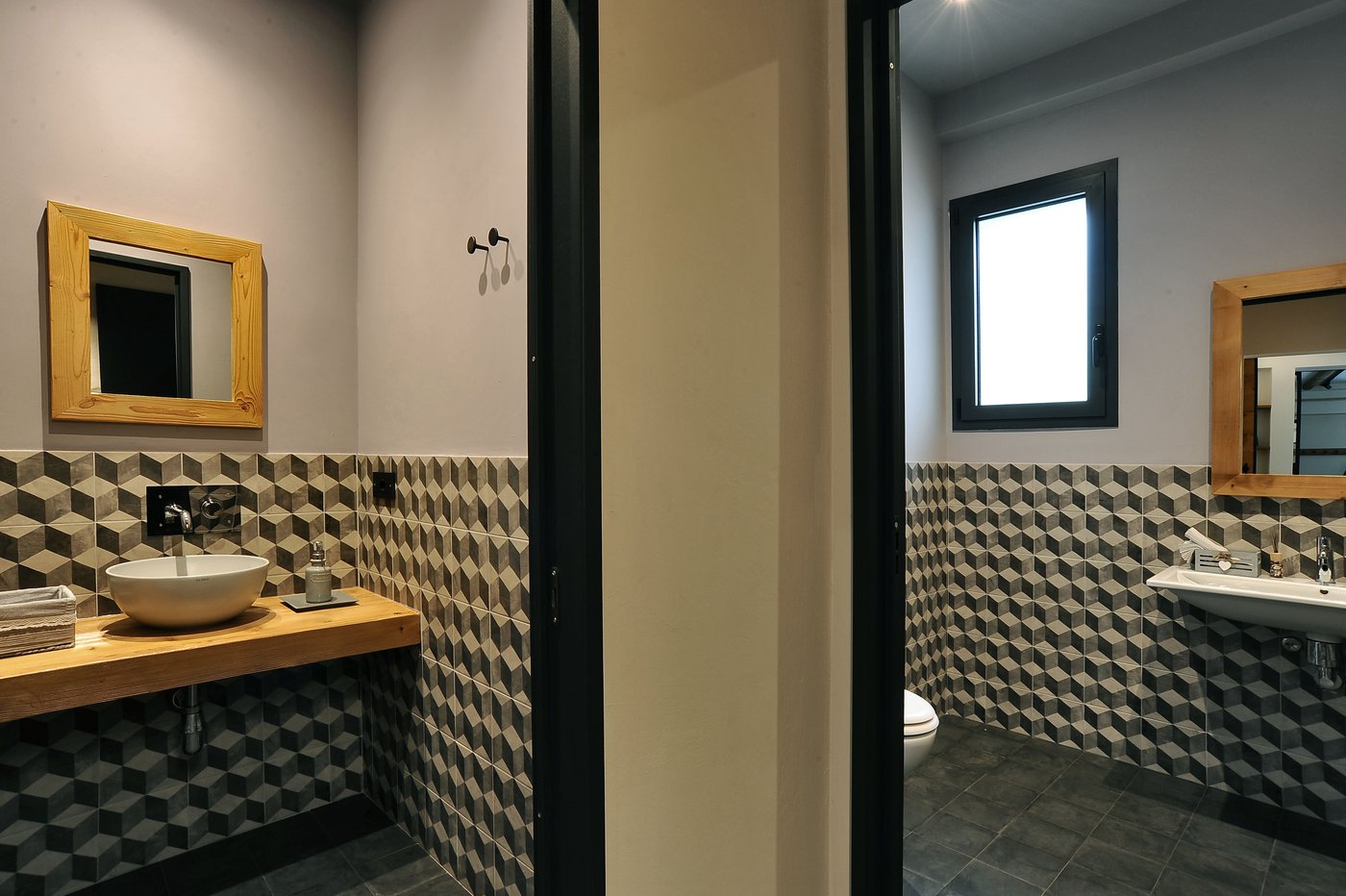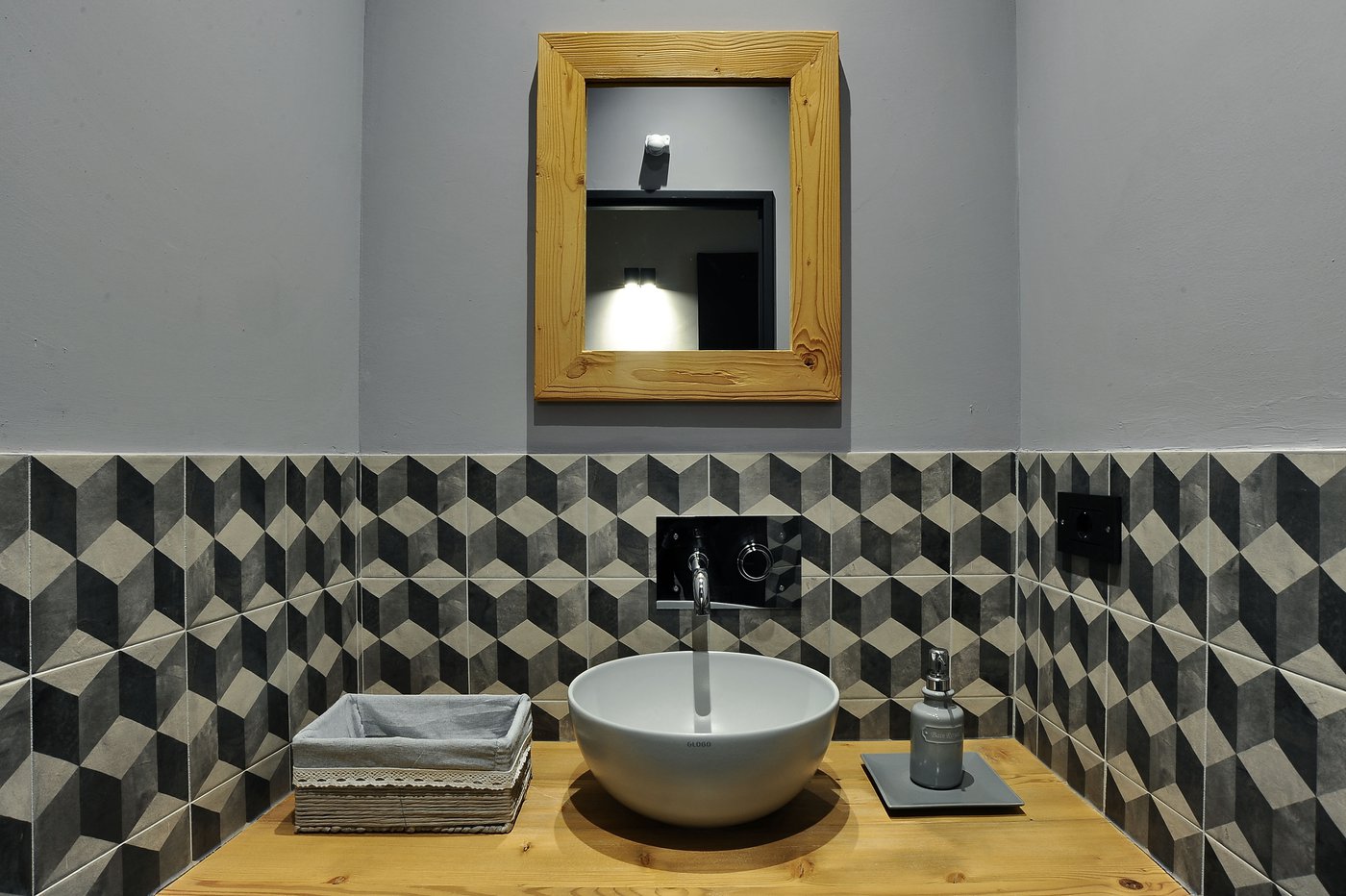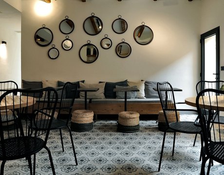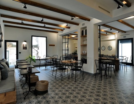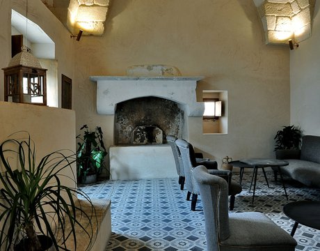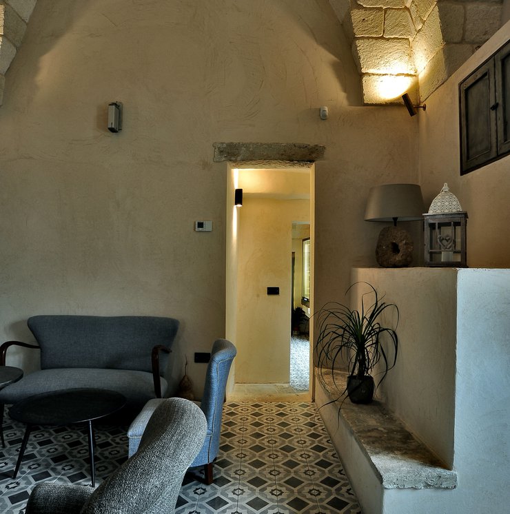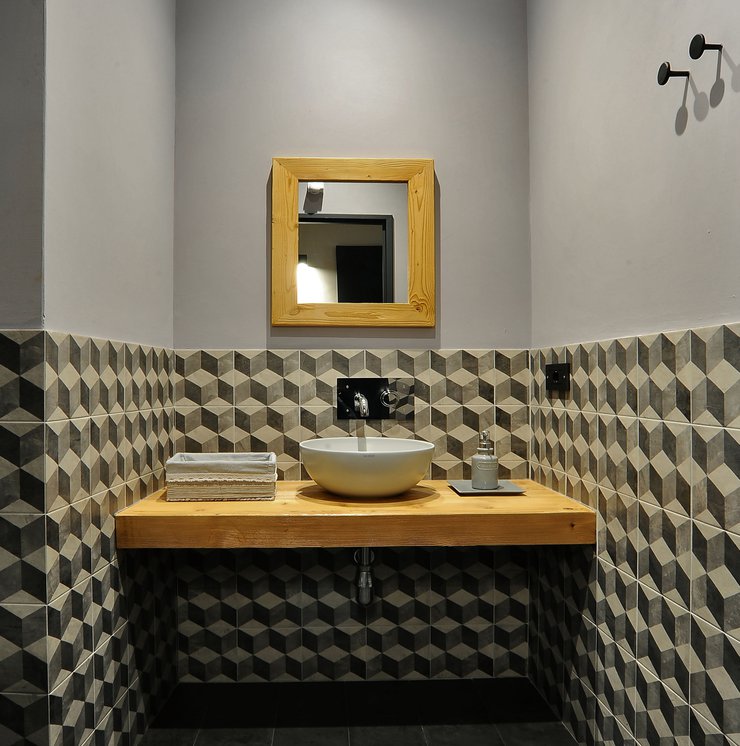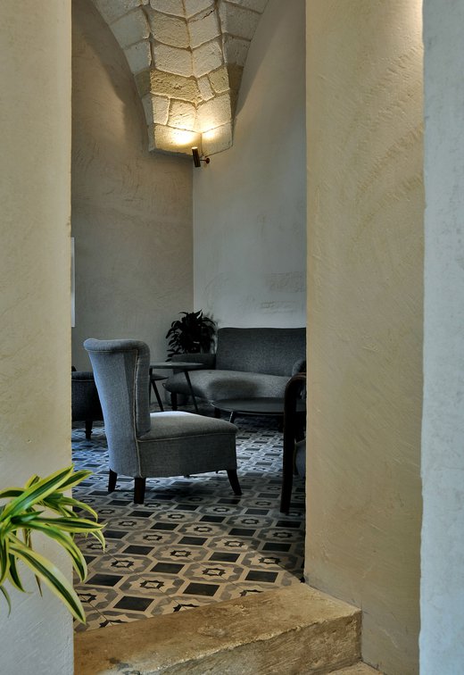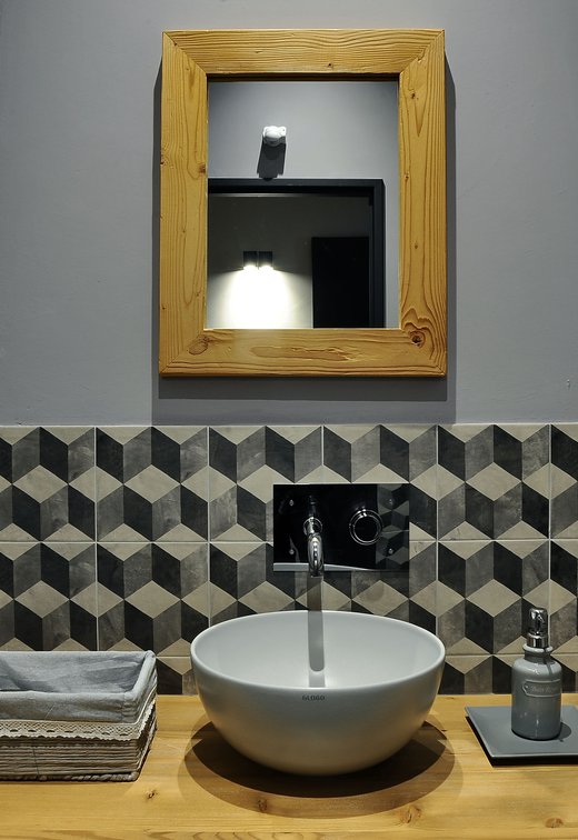 Le sale interne presentano invece uno stile più ricercato e retrò, accostando arredi design e sedute avvolgenti ai tappeti ceramici dai motivi Fiore e Geometria. Nelle sale da bagno, si ritrova infine una combinazione più pacata, tra i fondi scuri e il pattern geometrico Cubo, proposto in questo caso a rivestimento