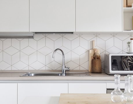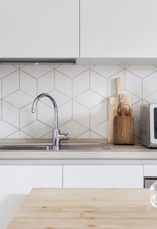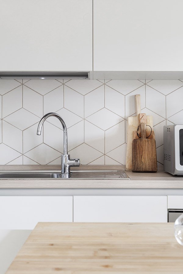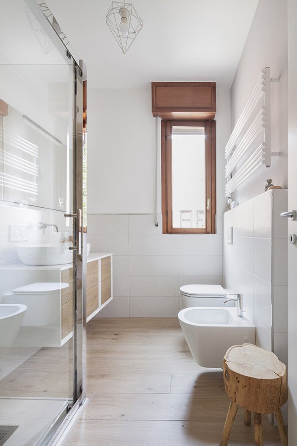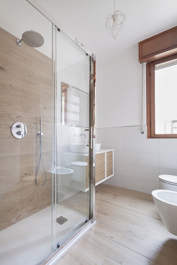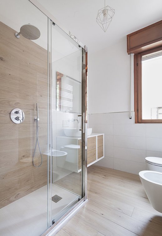 I rivestimenti in gres porcellanato effetto legno di Marca Corona, nell’elegante tonalità Beige, sono stati scelti per addolcire l’essenzialità degli arredi e valorizzare la luminosità degli ambienti.