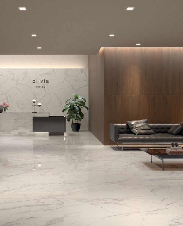 Tutte e 5 le superfici della serie Foyer Royal vengono prodotte in grandi formati rettificati, tra cui l‘innovativa lastra 120x278 cm Reflex con spessore 6 mm, pensata per ambientazioni indoor contemporanee.