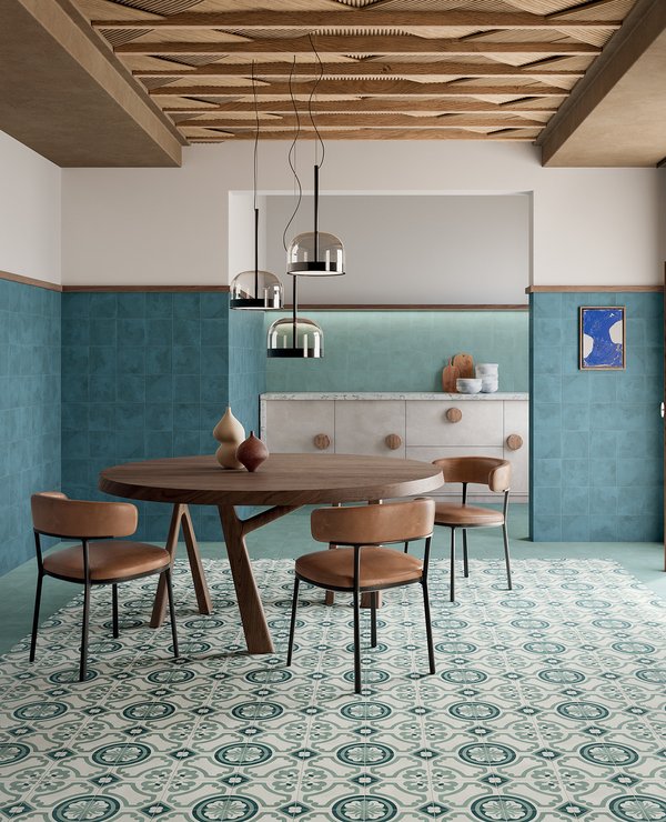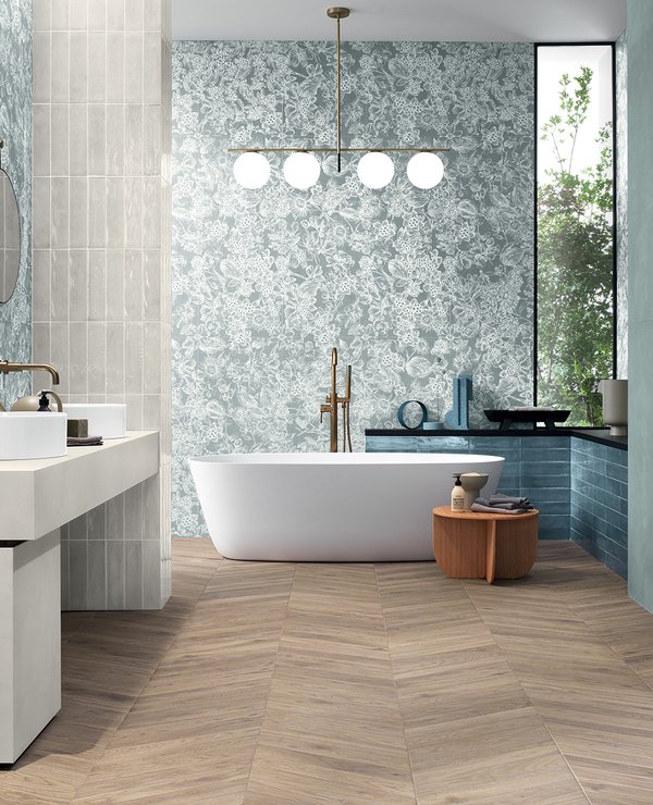 Il biophilic capta nuovamente il desiderio di riprodurre la natura, questa volta con un’attitudine più decorativa che si avvale dei motivi di matrice botanica, come piante rigogliose, fronde o foglie. Da qui si collega poi il trend floral, contraddistinto dall’uso di piastrelle grandi formati a disegno floreale, che creano bouquet emozionanti e realistici di cui poter gioire ogni giorno.