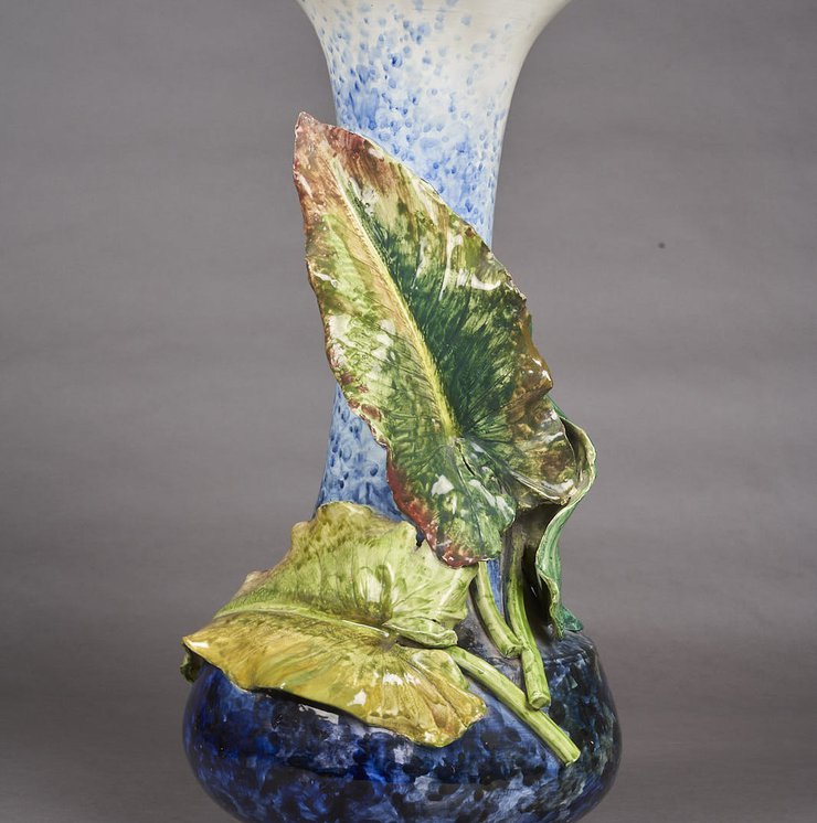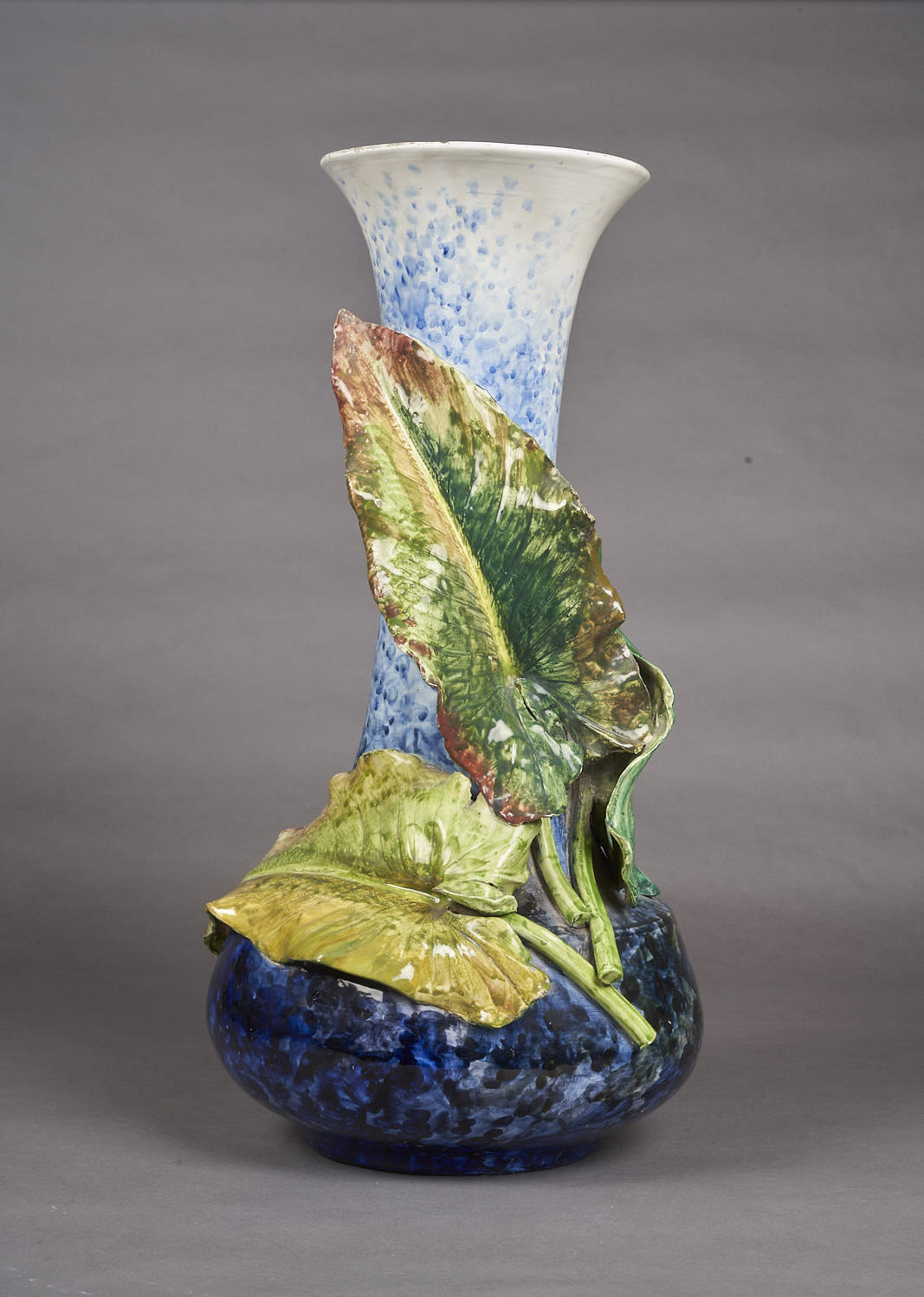 Large ornamental vase, majolica and earthenware (handles), 1880s