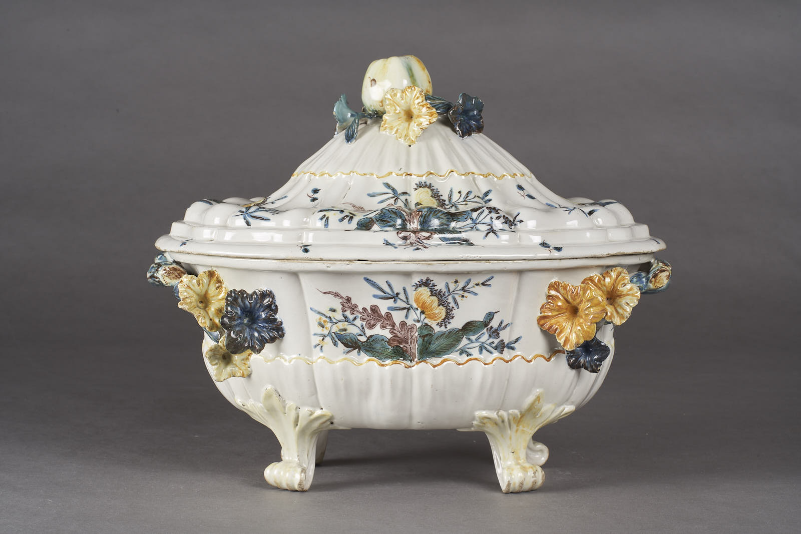 This is exemplified by the tureen with a lid in the form of a gurnard fish, with fin-shaped handles and an oval body adorned with relief and painted motifs. It was probably made by the ‘famous sculptor’ from Livorno, Pietro Giraud, maybe of French origin.