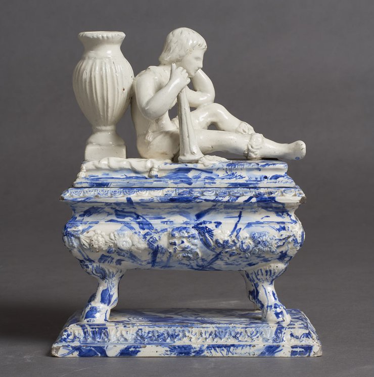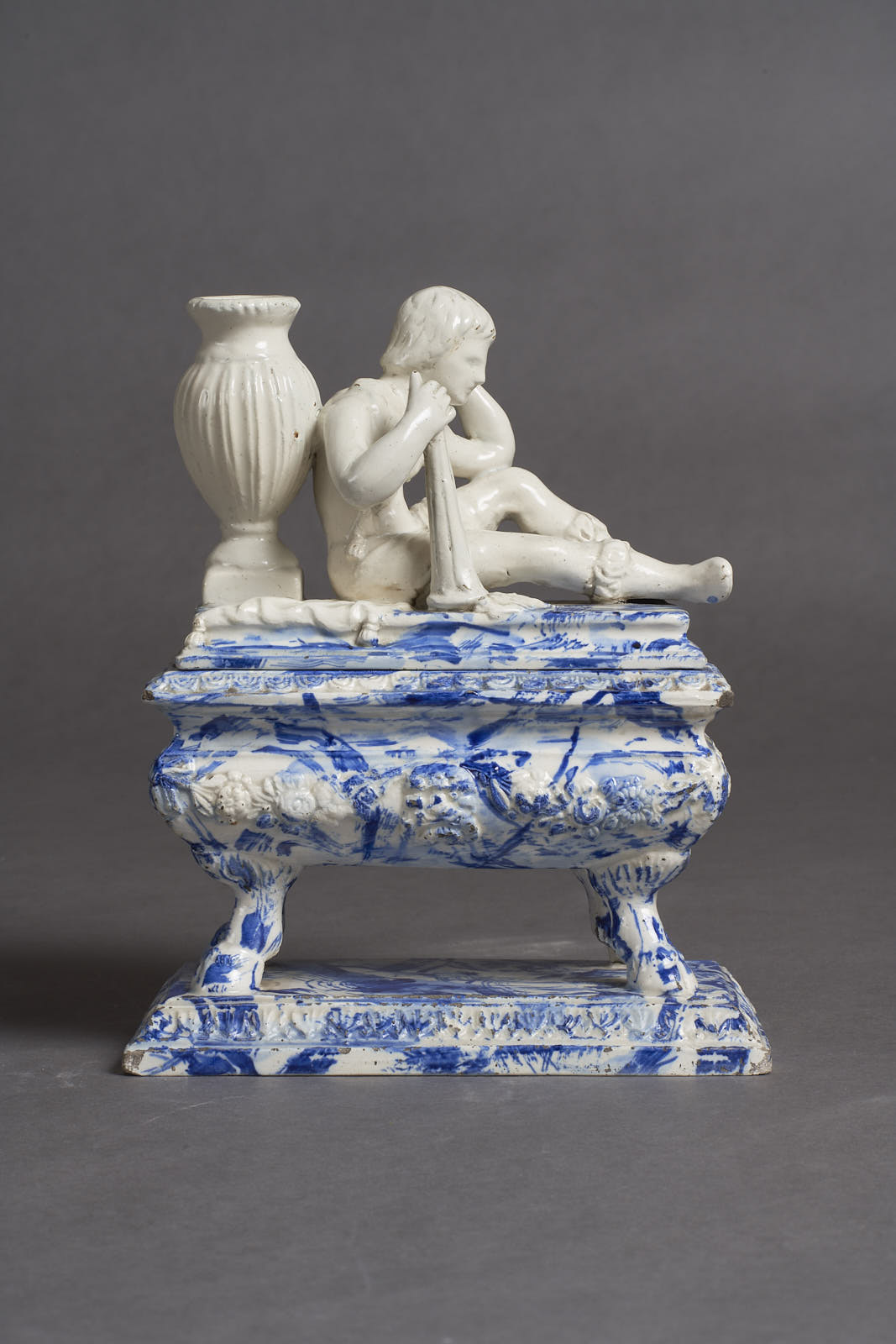 The earthenware inkwell is divided into three parts. The lid represents a sad young man, seated and holding the sickle of Father Time, which is lowered to represent time passing. Beside him is an amphora for holding pens.