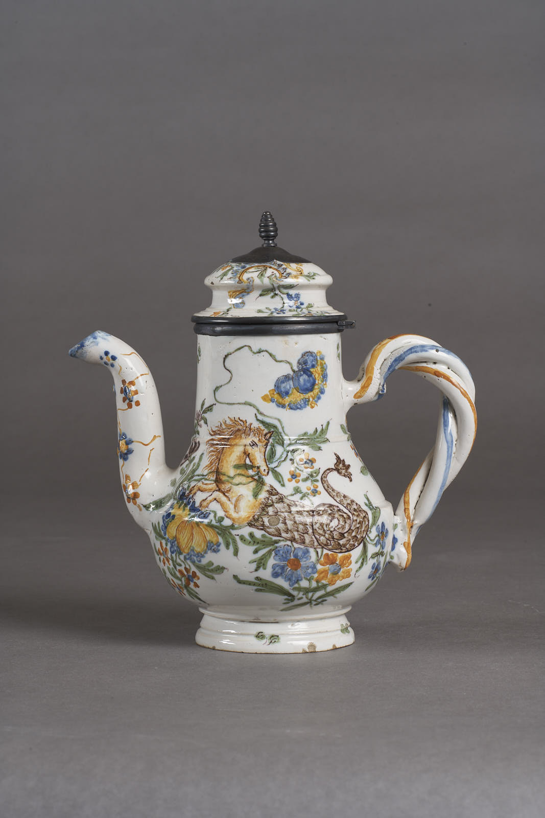 The decorative details derive from different worlds, mostly imaginary. Half figures, knights, animals, cherubs, shepherds, nymphs, seahorses, mythological deities, and couples come to life on plates and pots of different shapes and sizes. They often stand at the centre of bouquets of multicoloured flowers – tulips, anemones, cornflowers, forget-me-nots, arnica.