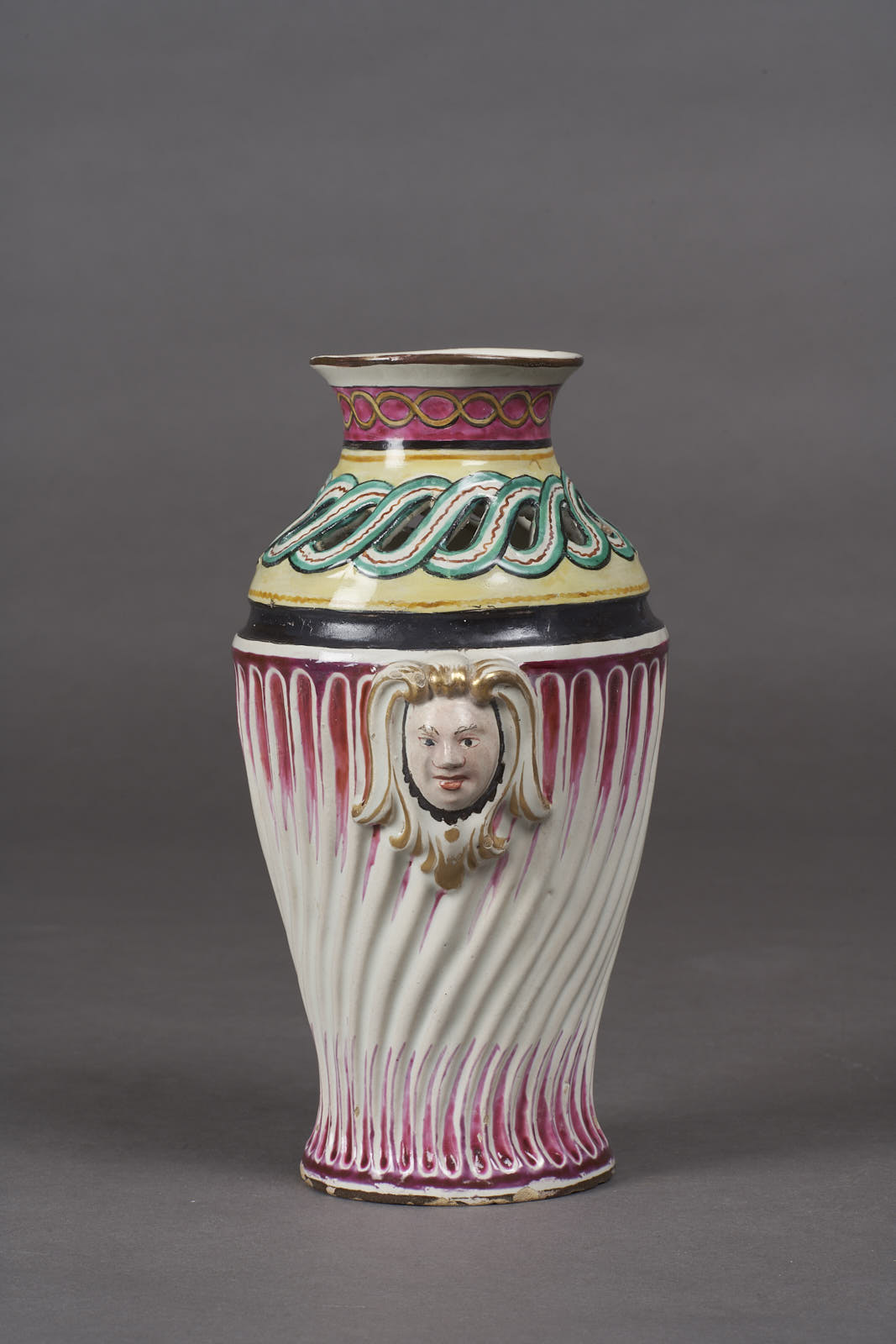Typical of Ferrari Moreni’s production, this cylindrical object was inspired by models from the Fontebasso Manufactory in Treviso, which are adorned with a rich decorative repertoire of festoons, masks, tracery, painted palmettes and harpies in white and blue.